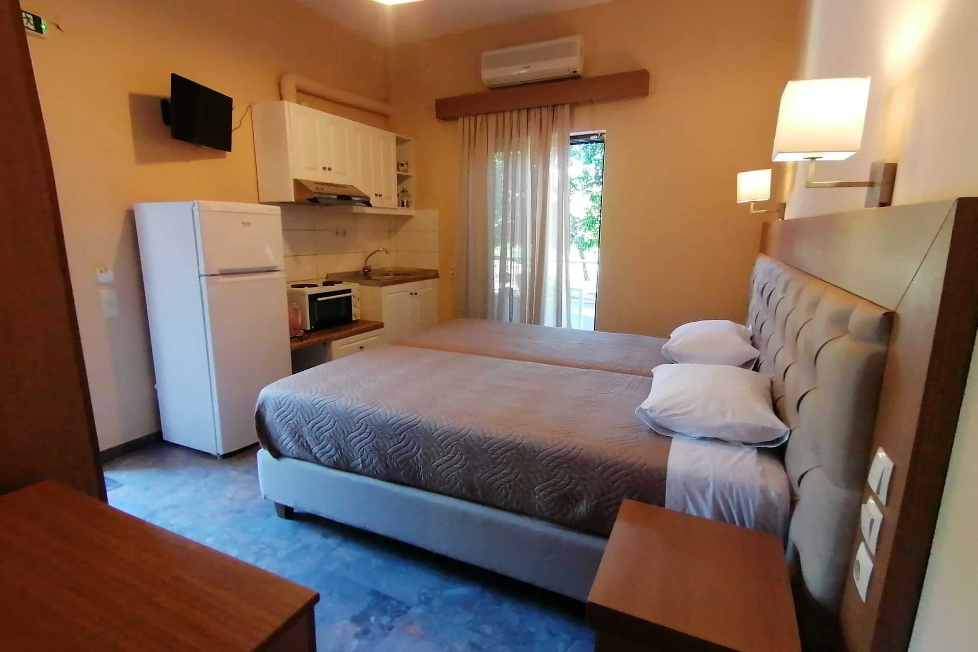Yksiö parvekkeella. Yhdistetty makuuhuone ja minikeittiö. Parivuode tai kaksi yhden hengen sänkyä. Lisävuodemahdollisuus vuodesohvasta. Minikeittiö, jossa keittolevyt, jääkaappi ja pakastin, leivänpaahdin, voileipägrilli, vedenkeitin ja yksinkertaisemman keittiövälineet. Maksuton wifi ja tallelokero. Ilmastointi lisämaksusta. Tv paikallisilla kanavilla. Hiustenkuivain. Kylpyhuoneessa suihku ja wc. Siivous 5 krt/viikko.