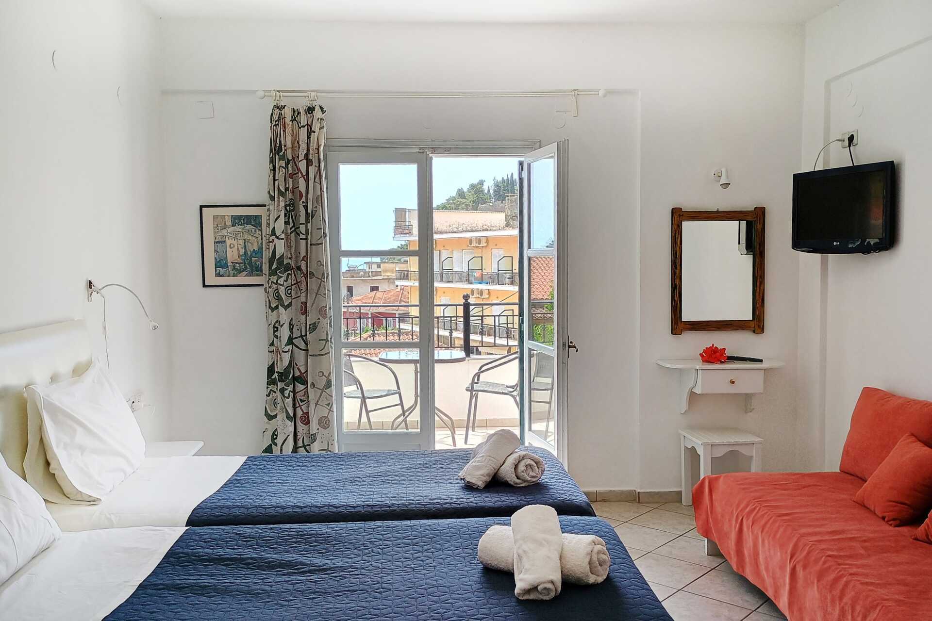 Kolmio parvekkeella. Kaksi makuuhuonetta ja minikeittiö eteisessä, josta pääsee molempiin makuuhuoneisiin. Yhdessä makuuhuoneessa on parivuode ja toisessa makuuhuoneessa kaksi erillistä vuodetta. Minikeittiössä keittolevyt, jääkaappi, vedenkeitin, mikro ja yksinkertainen keittiövarustus. Maksuton wifi. Ilmastointi ja tallelokero lisämaksusta. Tv kansainvälisillä kanavilla. Kylpyhuoneessa suihku ja wc. Siivous 6 krt/viikko.