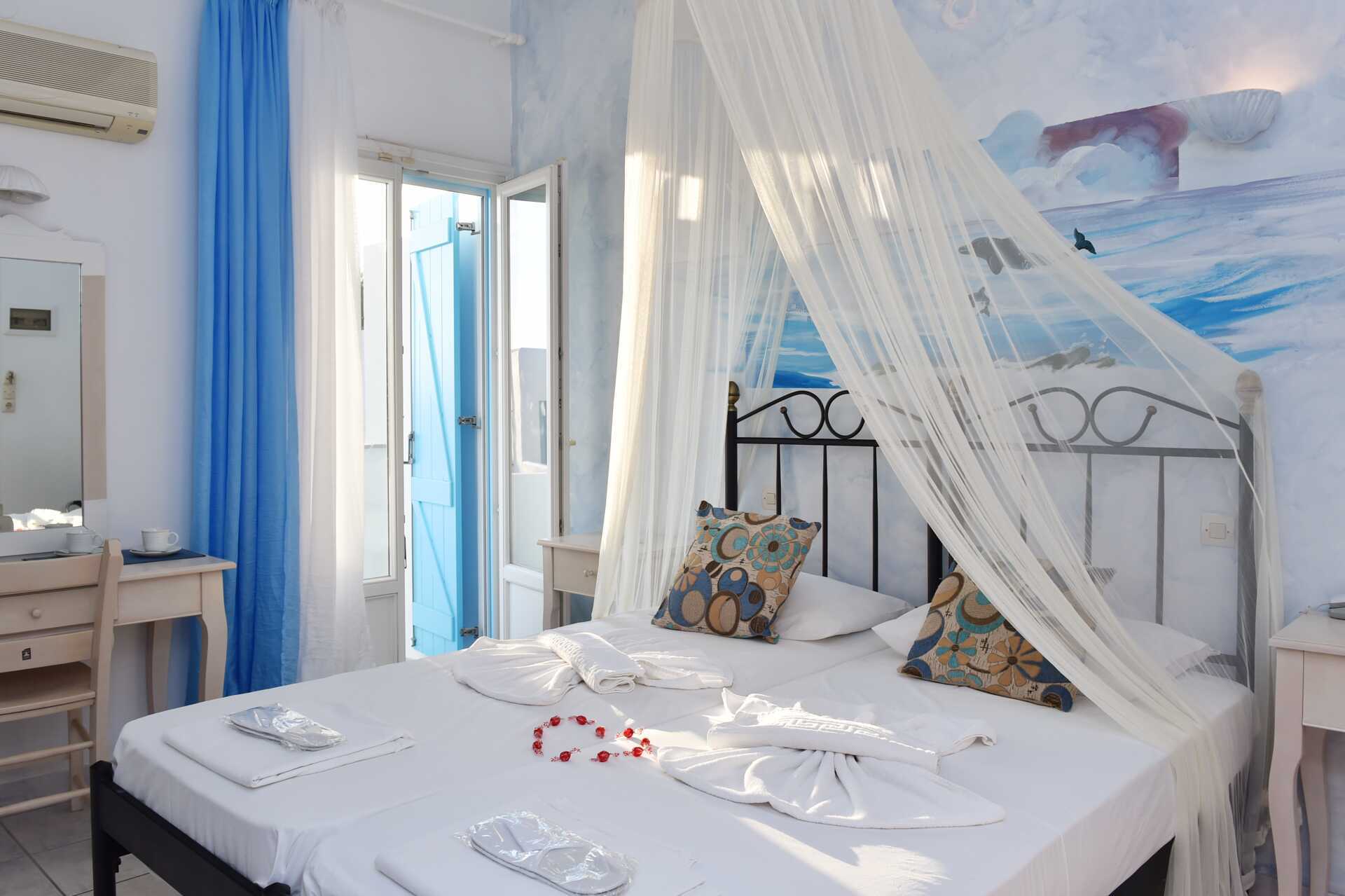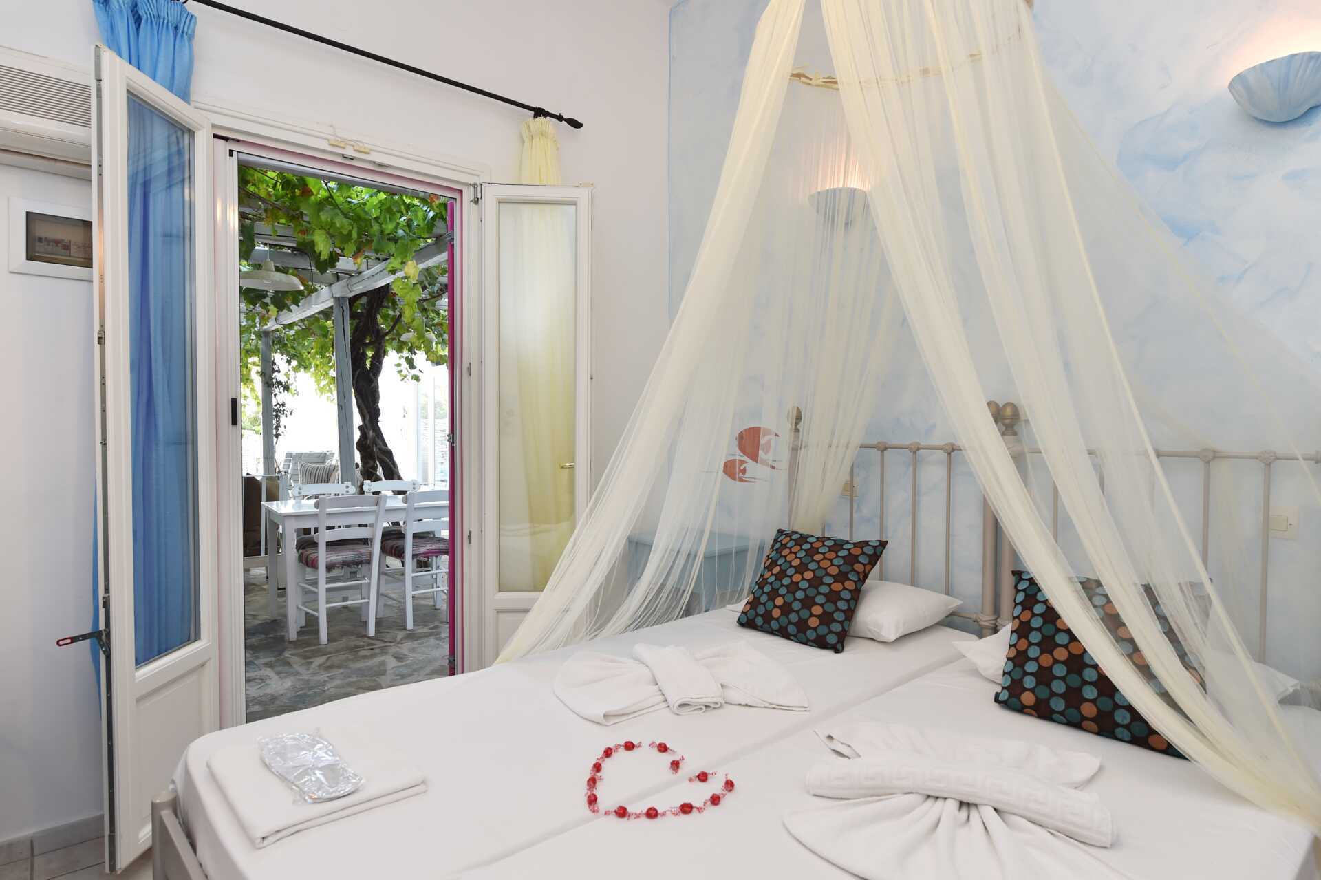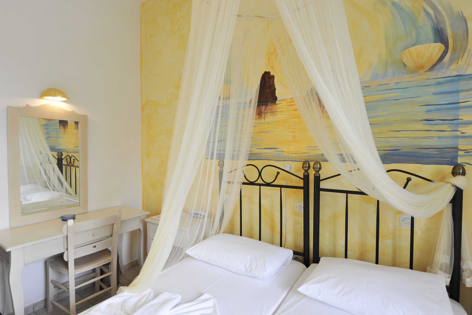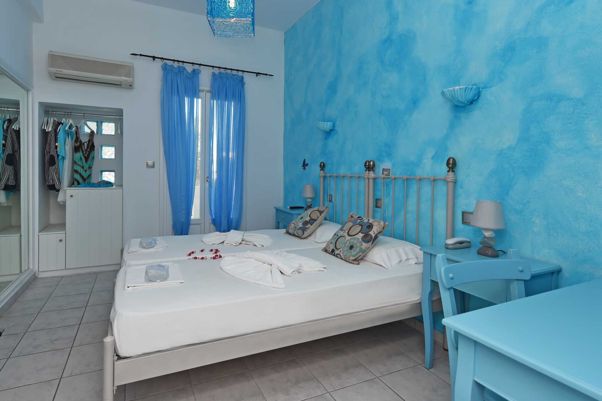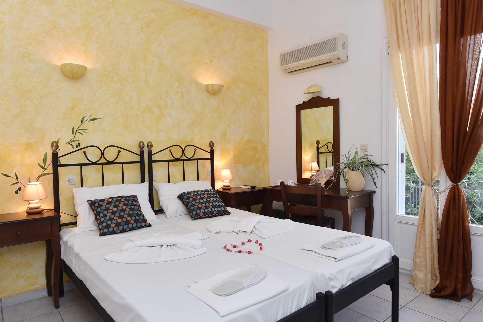 Kahden hengen huone parvekkeella tai terassilla. Parivuode tai kaksi yhden hengen sänkyä. Maksuton wifi ja ilmastointi. Jääkaappi. Vedenkeitin. Tv kansainvälisillä kanavilla. Hiustenkuivain. Kylpyhuoneessa suihku ja wc. Siivous 7 krt/viikko.