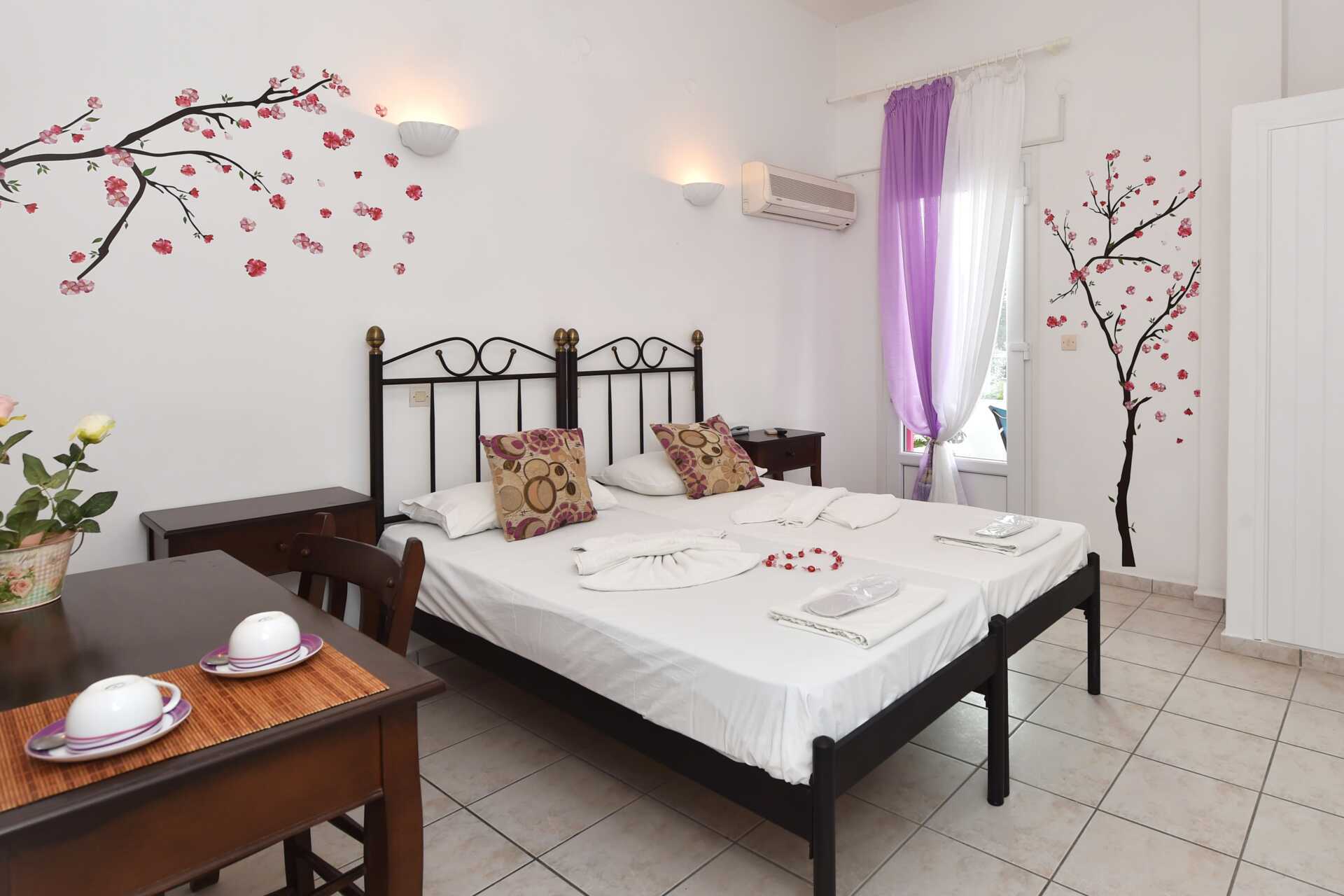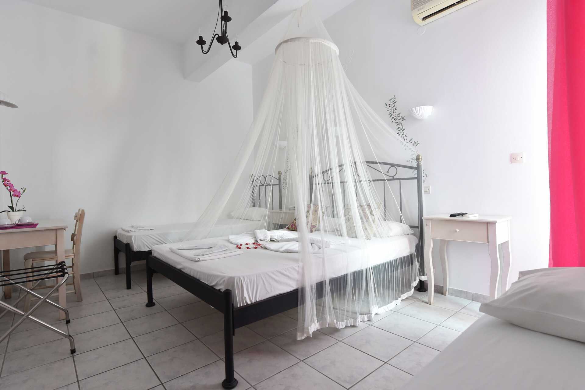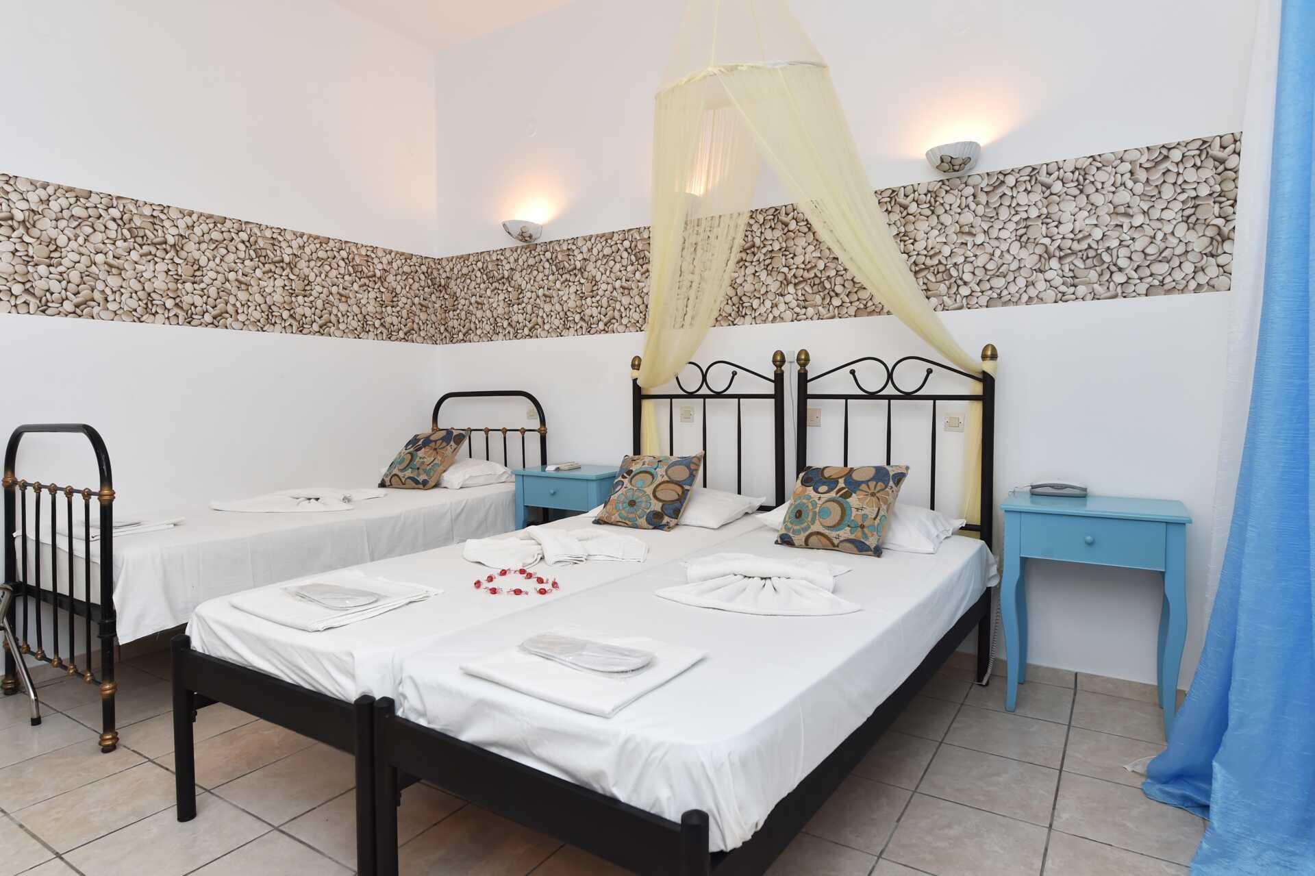 Kolmen hengen huone parvekkeella tai terassilla. Yksi parivuode ja yksi yhden hengen vuode tai kolme yhden hengen vuodetta. Maksuton wifi ja ilmastointi. Jääkaappi. Vedenkeitin. Tv kansainvälisillä kanavilla. Hiustenkuivain. Kylpyhuoneessa suihku ja wc. Siivous 7 krt/viikko.