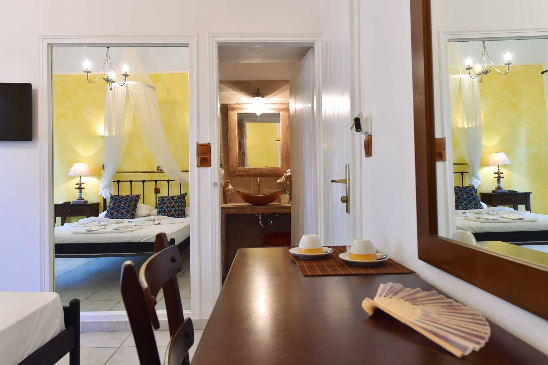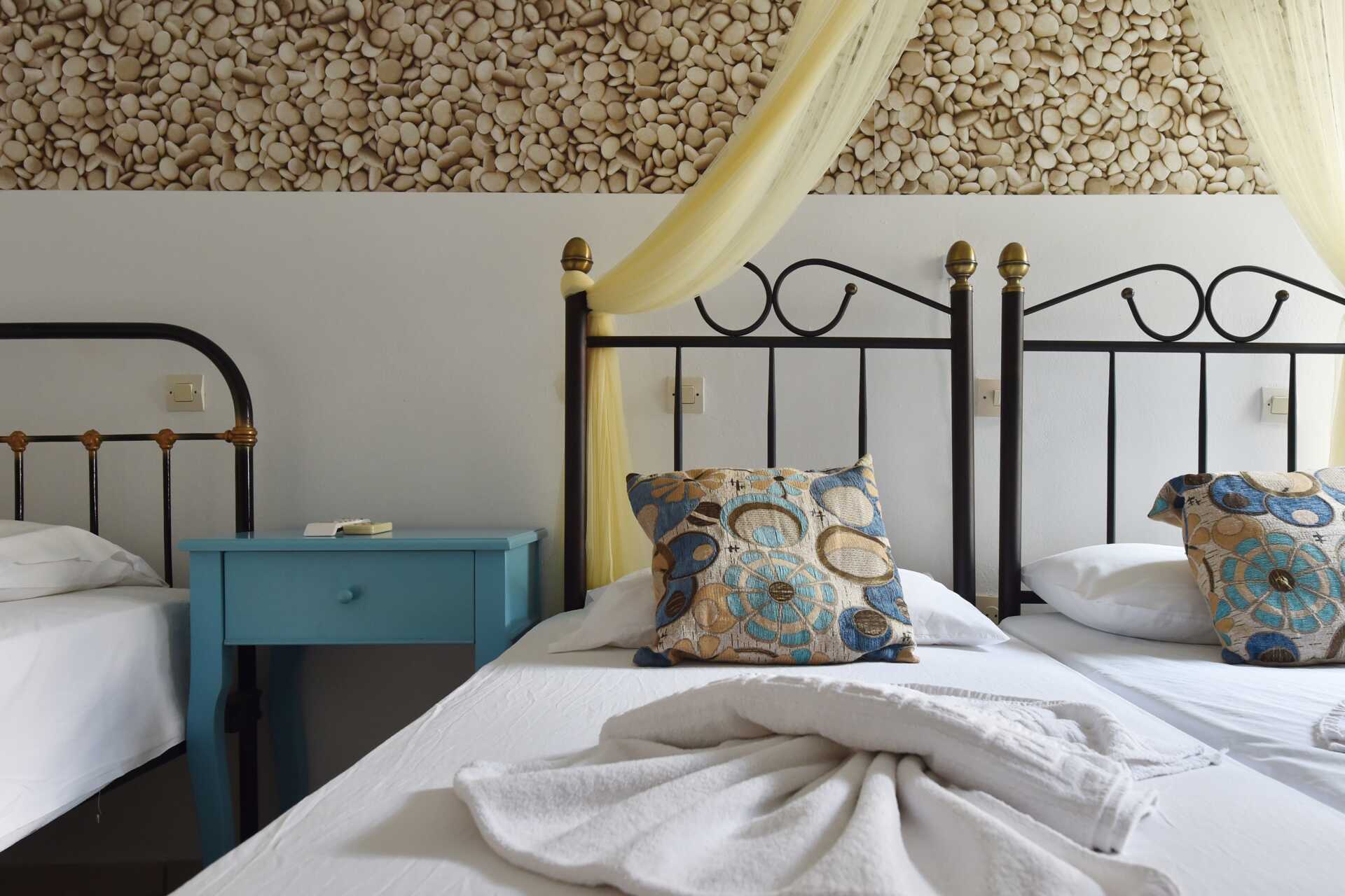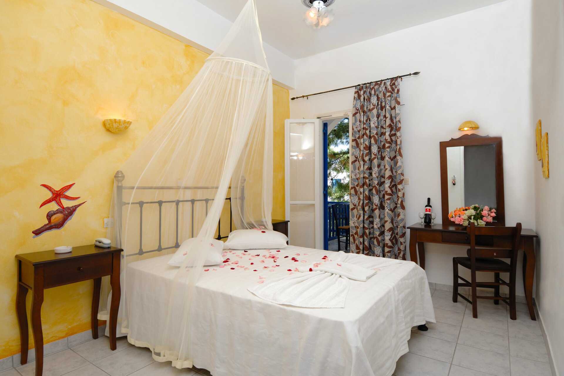Kolmen hengen huone parvekkeella tai terassilla. Yksi parivuode ja yksi yhden hengen vuode tai kolme yhden hengen vuodetta. Maksuton wifi ja ilmastointi. Jääkaappi. Vedenkeitin. Tv kansainvälisillä kanavilla. Hiustenkuivain. Kylpyhuoneessa suihku ja wc. Siivous 7 krt/viikko.