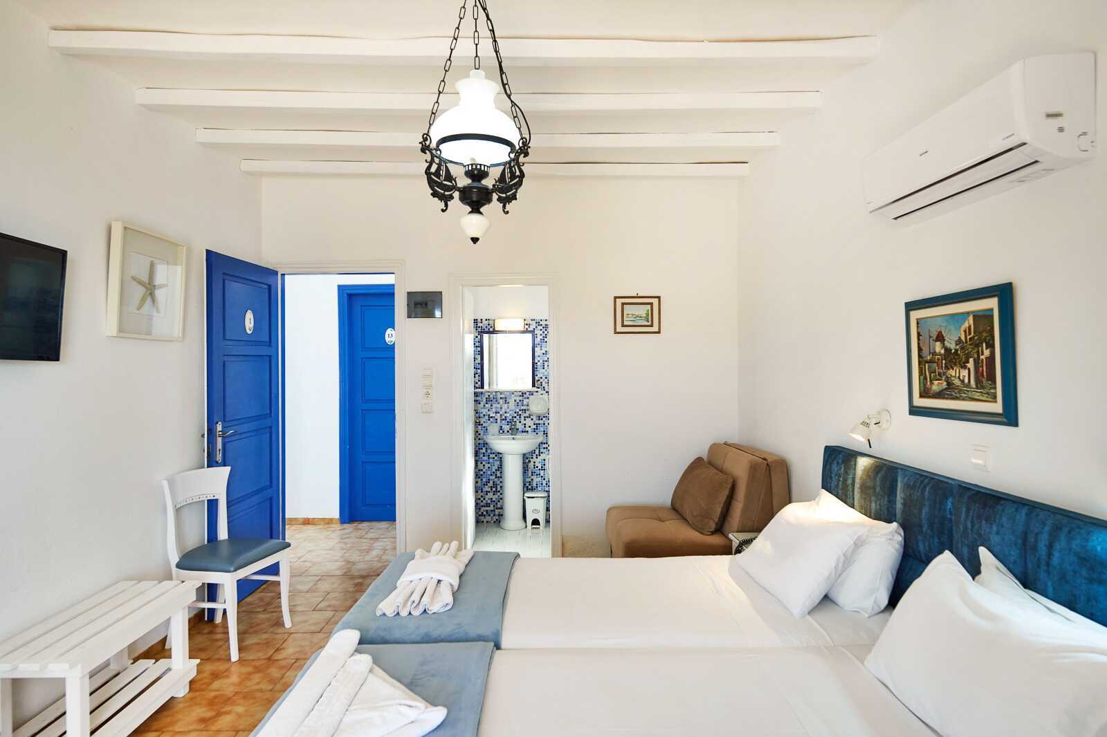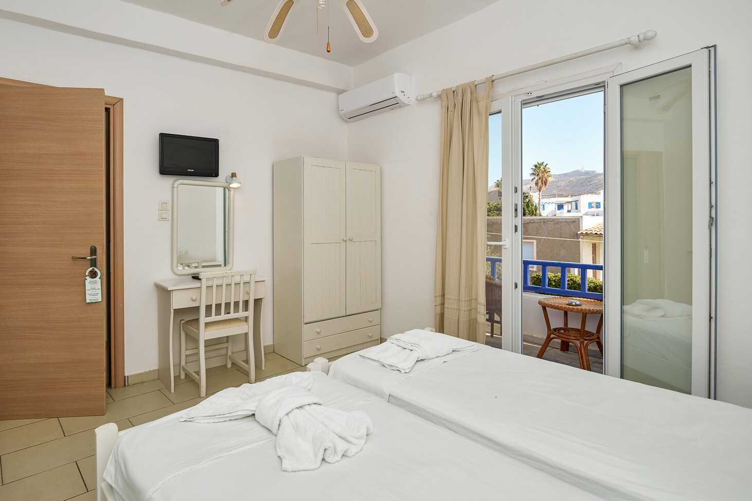 Kolmen hengen huone parvekkeella. Parivuode tai kaksi erillistä sänkyä ja yhden hengen sänky. Maksuton wifi ja ilmastointi. Jääkaappi. Tv kansainvälisillä kanavilla. Hiustenkuivain. Kylpyhuoneessa suihku ja wc. Siivous 7 krt/viikko. Alle 2-vuotiaat lapset lasketaan lisävuoteella majoittuviksi henkilöiksi.