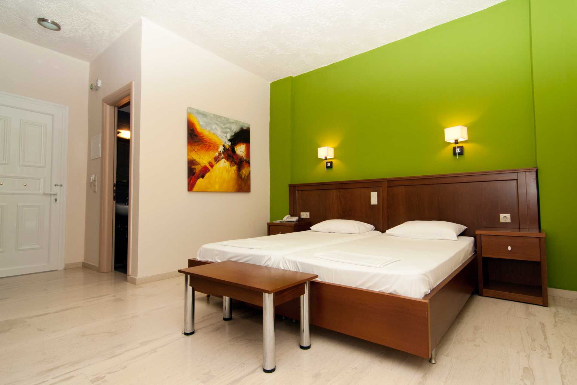 Kahden hengen huone parvekkeella tai terassilla. Kaksi yhden hengen vuodetta. Lisävuodemahdollisuus yhden hengen vuoteesta. Maksuton wifi, ilmastointi ja tallelokero. Jääkaappi. Tv kansainvälisillä kanavilla. Silitysrauta ja -lauta. Hiustenkuivain. Kylpyhuoneessa suihku ja wc. Siivous 6 krt/viikko. Alle 2-vuotiaat lapset lasketaan lisävuoteella majoittuviksi henkilöiksi.
