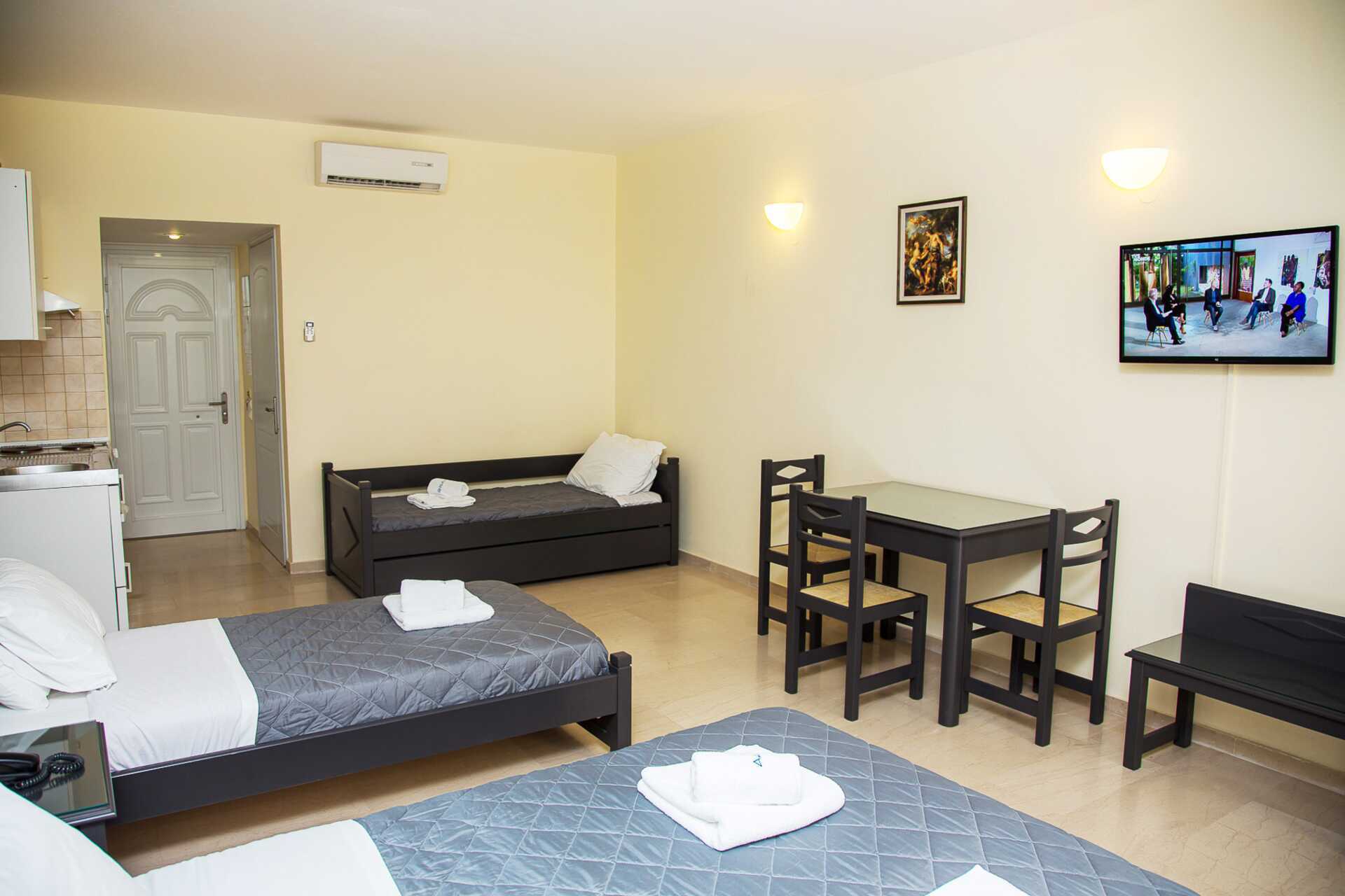 Kahden hengen huone parvekkeella. Parivuode tai kaksi yhden hengen sänkyä. Lisävuodemahdollisuus yhden hengen vuoteeseen tai vuodesohvaan. Jääkaappi. Vedenkeitin. Tv kansainvälisillä kanavilla. Hiustenkuivain. Kylpyhuoneessa amme ja wc. Siivous 6 krt/viikko.