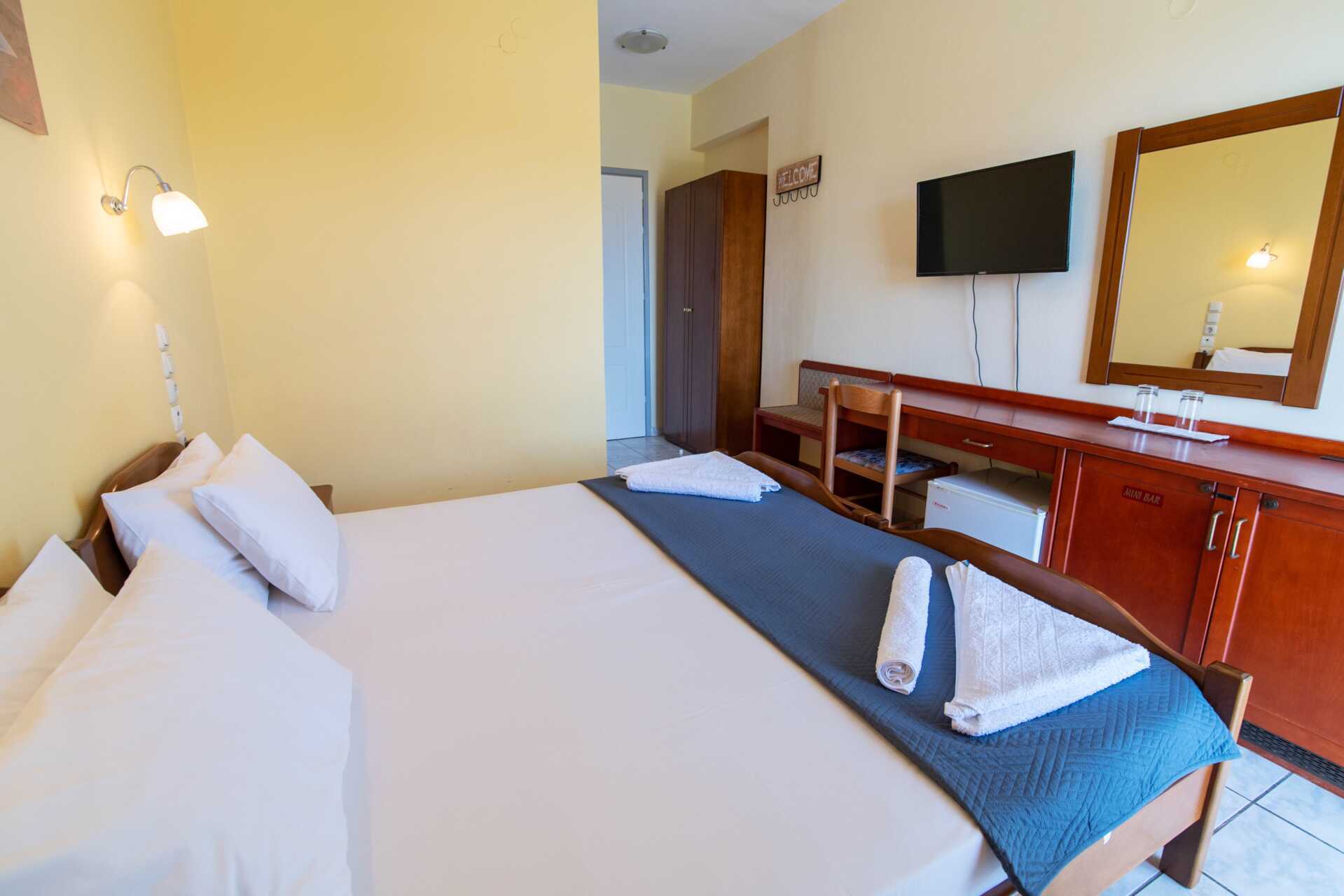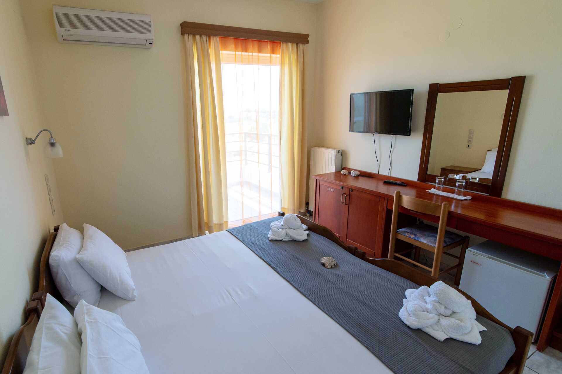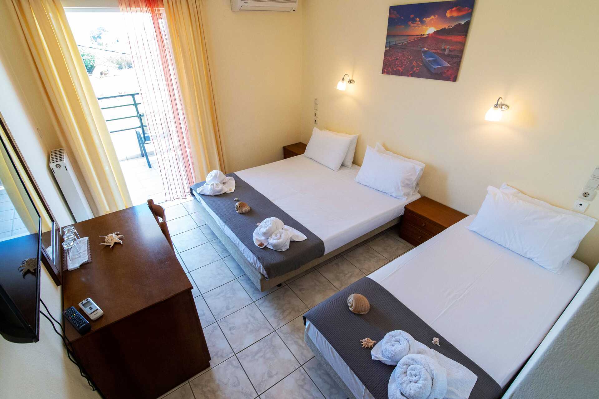 Kahden hengen huone parvekkeella, osassa merinäköala. Parivuode tai kaksi yhden hengen sänkyä. Maksuton wifi ja ilmastointi. Jääkaappi. Tv paikallisilla kanavilla. Hiustenkuivain. Kylpyhuoneessa suihku ja wc. Siivous 5 krt/viikko.
