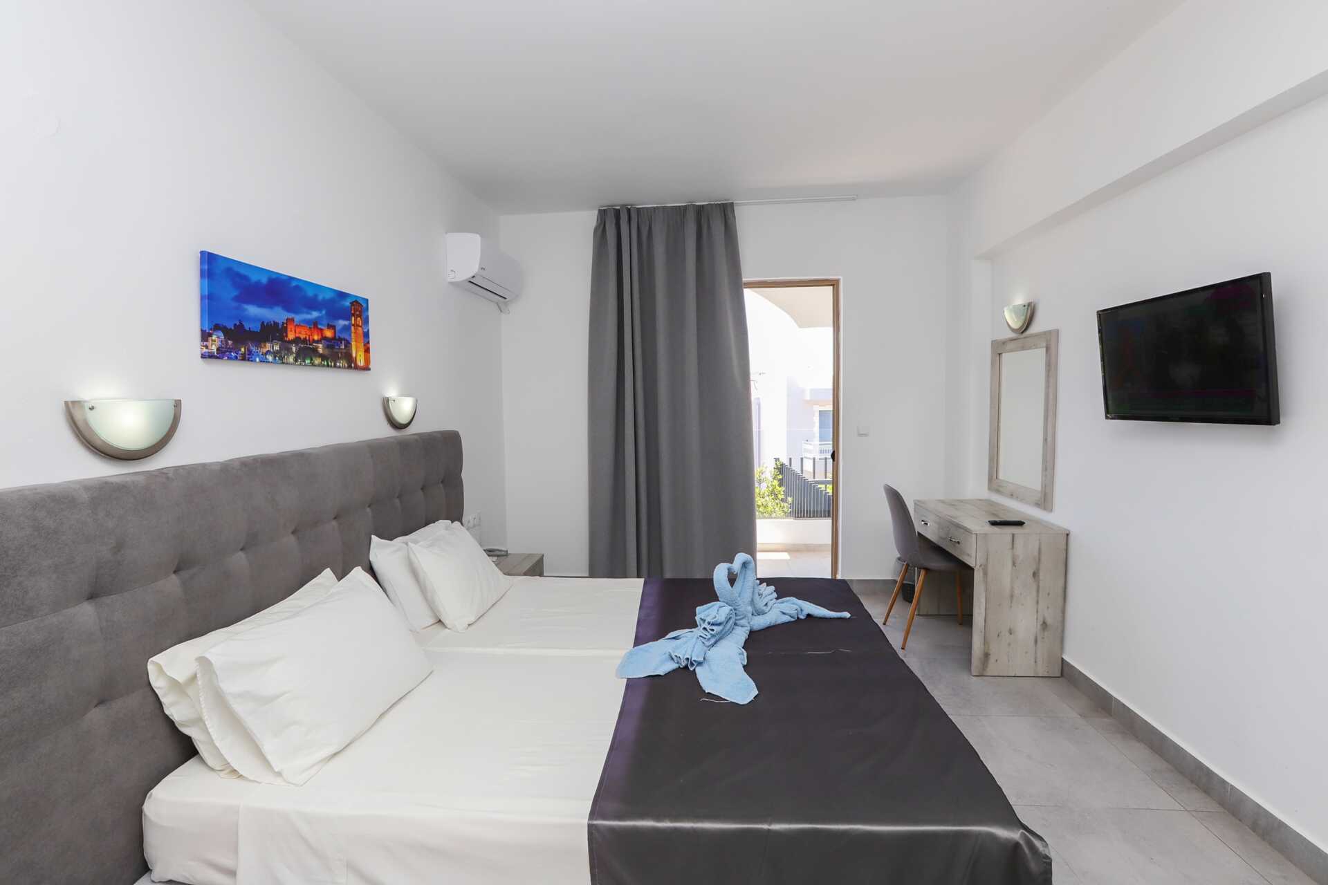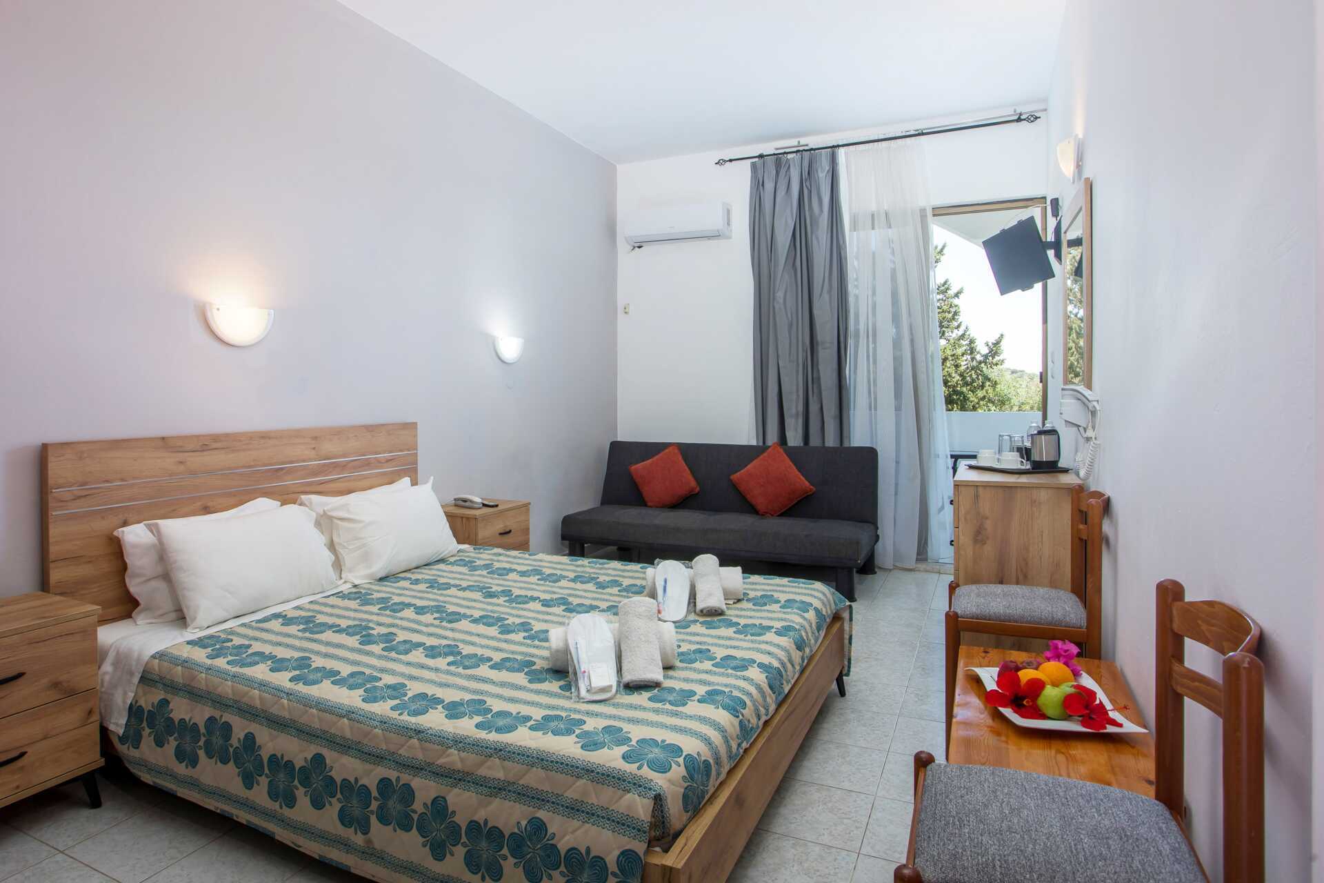 Perhehuone parvekkeella tai terassilla. Parivuode tai kaksi yhden hengen sänkyä. Lisävuodemahdollisuus kerrossängystä. Maksuton wifi, ilmastointi ja tallelokero. Jääkaappi ja vedenkeitin. Tv kansainvälisillä kanavilla. Hiustenkuivain. Kylpyhuoneessa suihku ja wc. Siivous 6 krt/viikko.