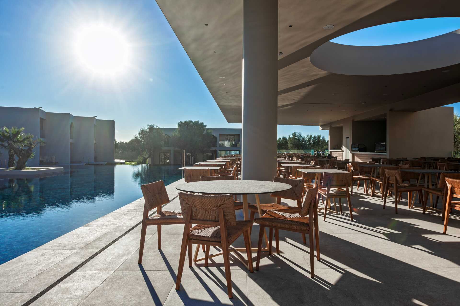Blue Sea Oliviassa on buffetravintola, jossa voit syödä aamupalan, lounaan ja illallisella sekä kreikkalaisen että kansainvälisen keittiön elementeillä. Gluteenittomia, laktoosittomia, kasvis- ja vegaanivaihtoehtoja on saatavilla pyynnöstä. Yhdistetty allas- ja välipalabaari, joka tarjoilee salaatteja, välipaloja, hedelmiä, jäätelöä ja makeisia päiväsaikaan ja on sitten avoinna juomia varten vasta hieman ennen puoltayötä.