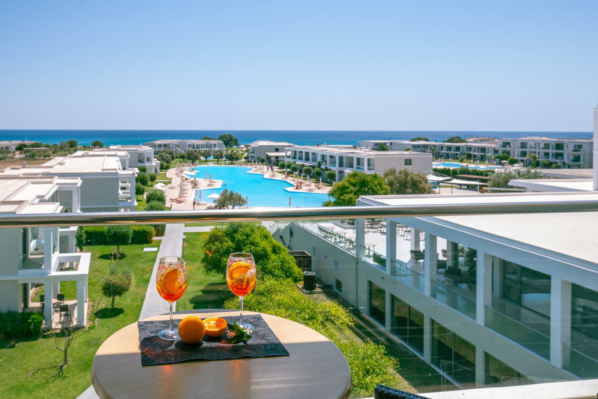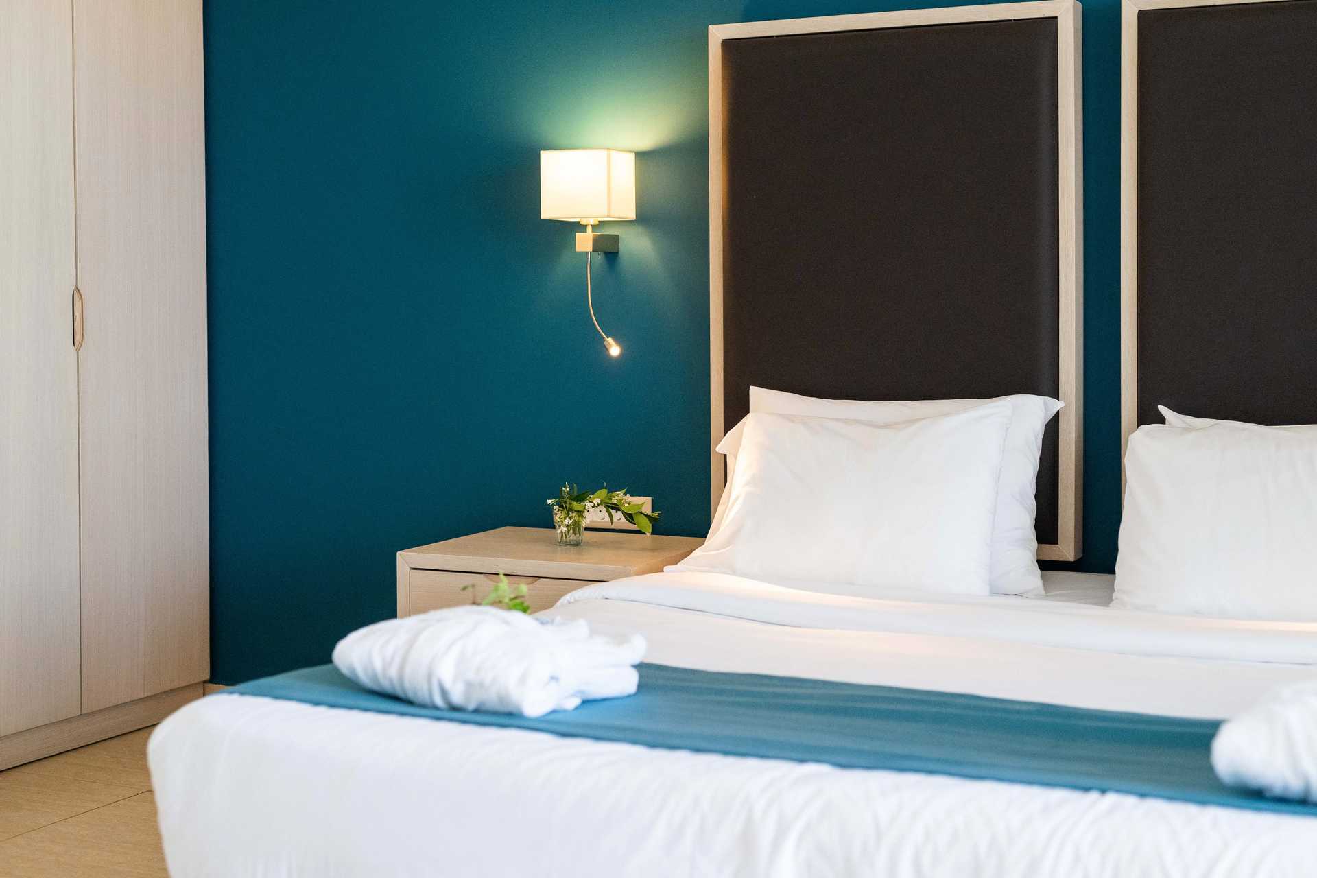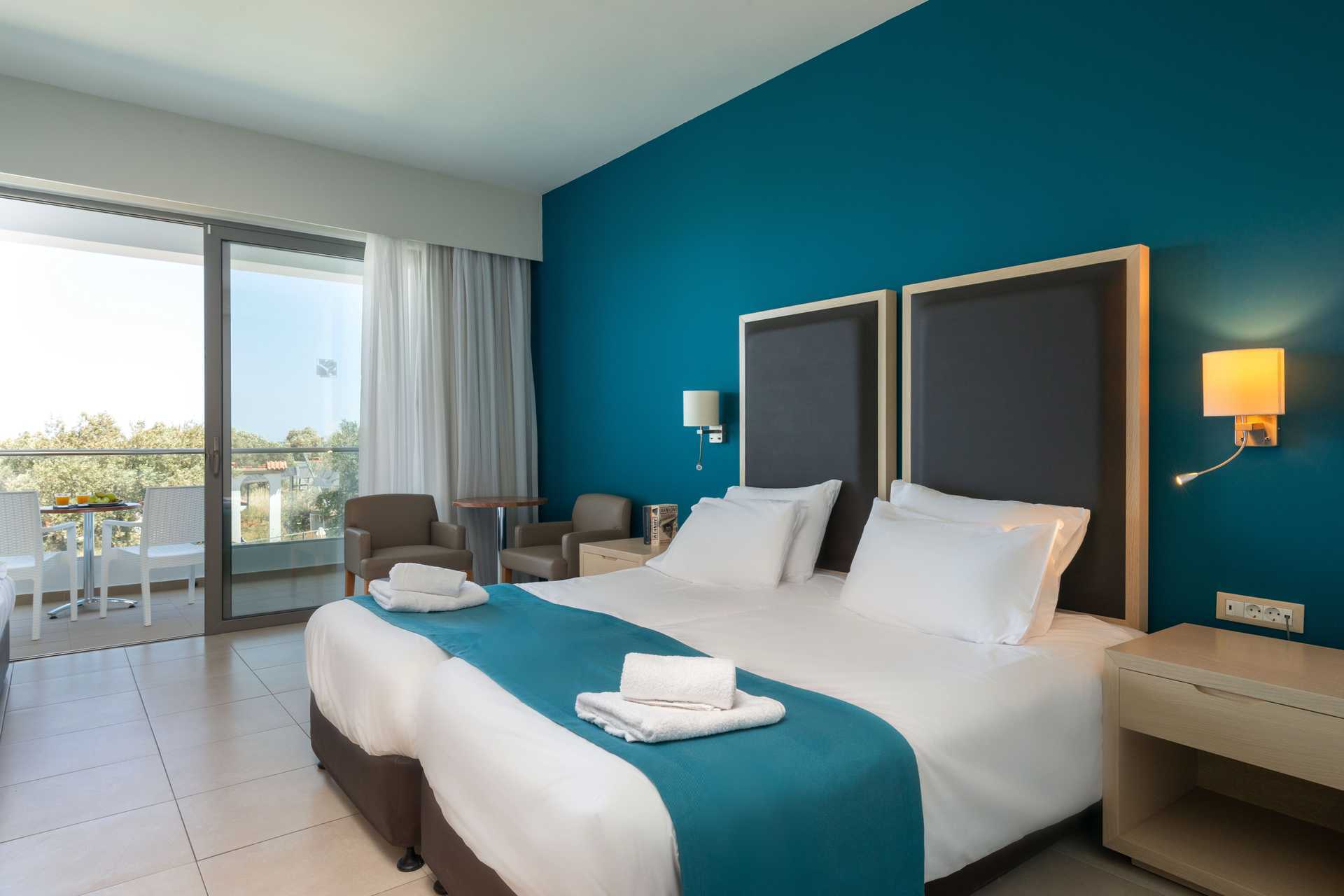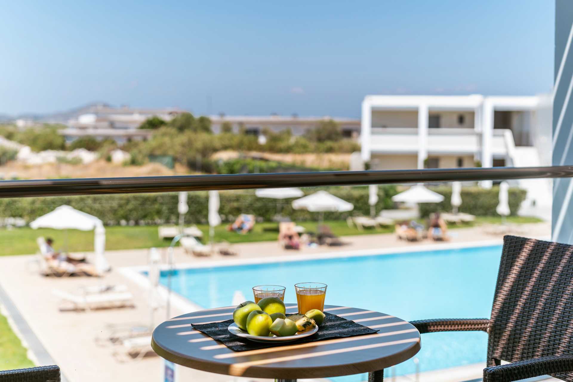 Kahden hengen huoneita, joissa on parveke tai maaterassi. Osasta parvekkeista allasnäkymä, merinäköala tai rajoitettu merinäköala. Parivuode tai kaksi yhden hengen vuodetta. Lisävuodemahdollisuus vuodesohvasta. Maksuton wifi, ilmastointi ja tallelokero. Jääkaappi. Vedenkeitin. Tv kansainvälisillä kanavilla. Hiustenkuivain. Amme/suihku ja wc. Siivous 7 krt/viikko.
