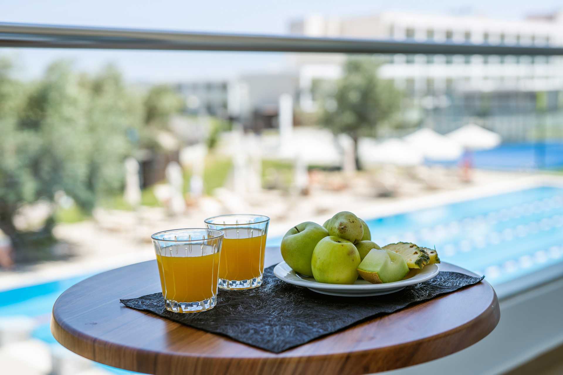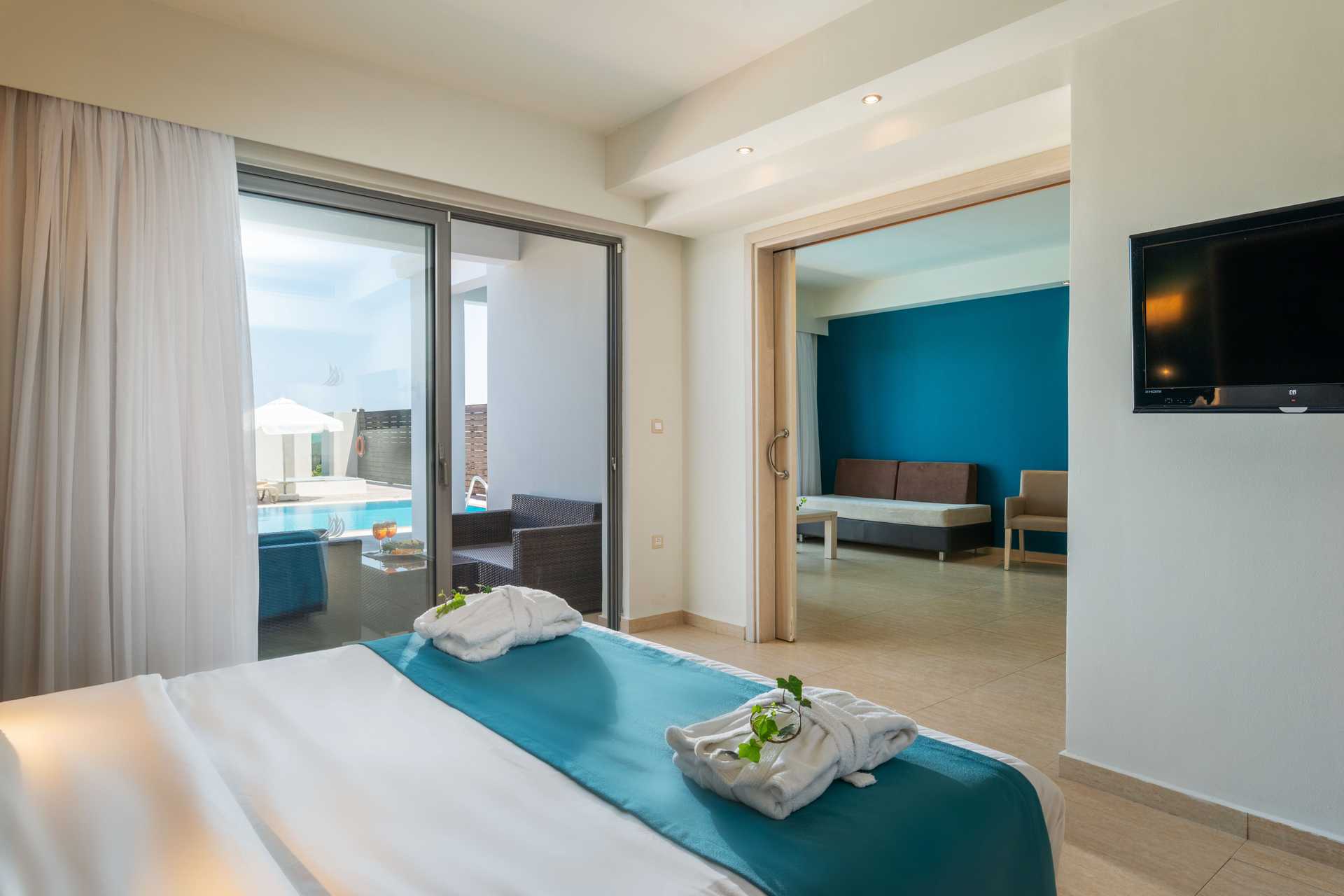 Perhehuoneita, joissa on parveke tai maaterassi. Osalta parvekkeista on merinäköala, rajoitettu merinäköala tai allasnäköala. Makuuhuoneosa ja olohuoneosa, jotka voidaan erottaa väliovin. Parivuode tai kaksi yhden hengen vuodetta makuuhuoneosassa ja mahdollisuus lisävuoteeseen vuodesohvasta olohuoneosassa. Tv kansainvälisillä kanavilla. Pieni jääkaappi ja vedenkeitin. Maksuton wifi, ilmastointi ja tallelokero. Hiustenkuivain. Amme/suihku ja wc. Siivous 7 krt/viikko.