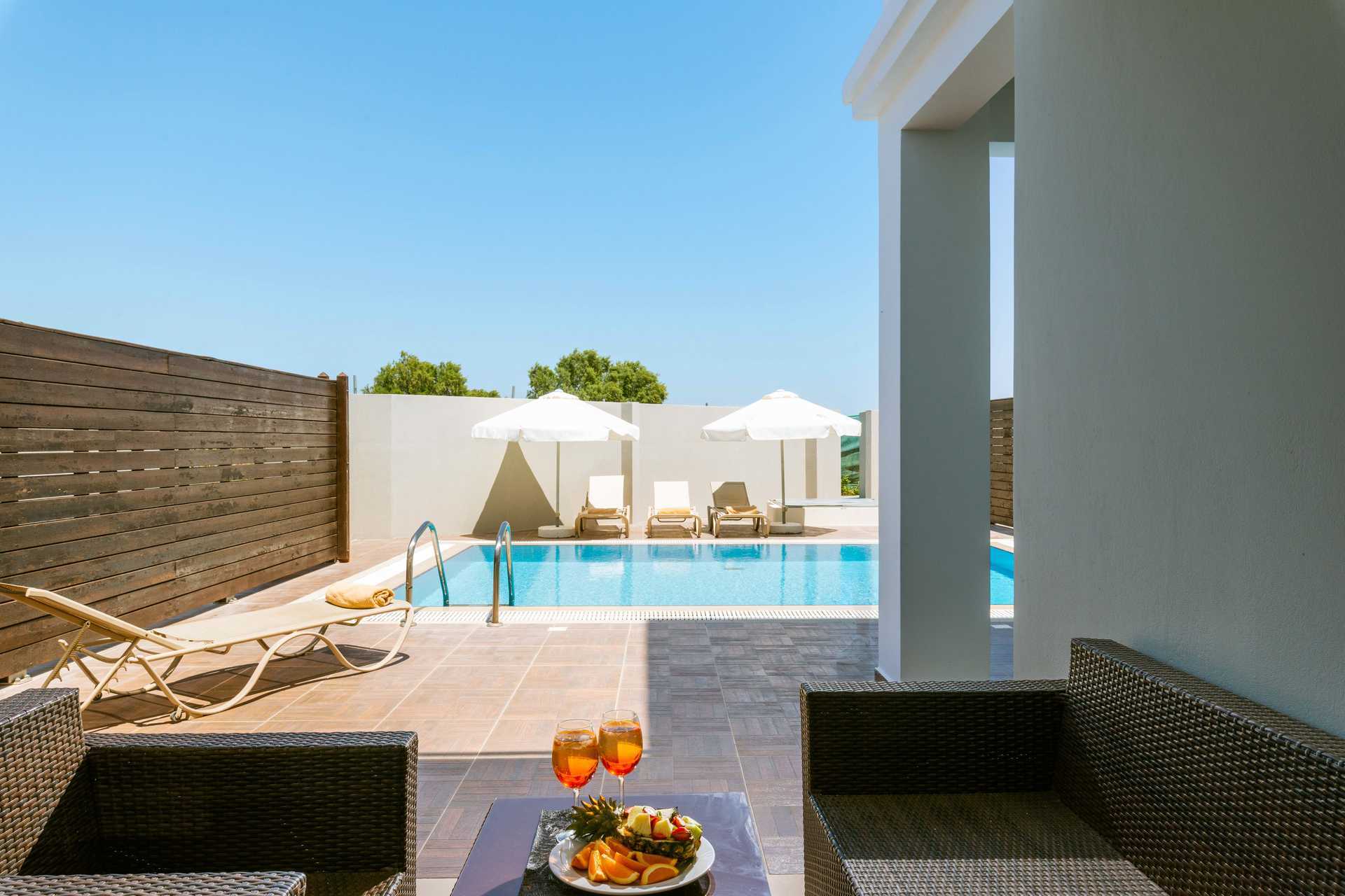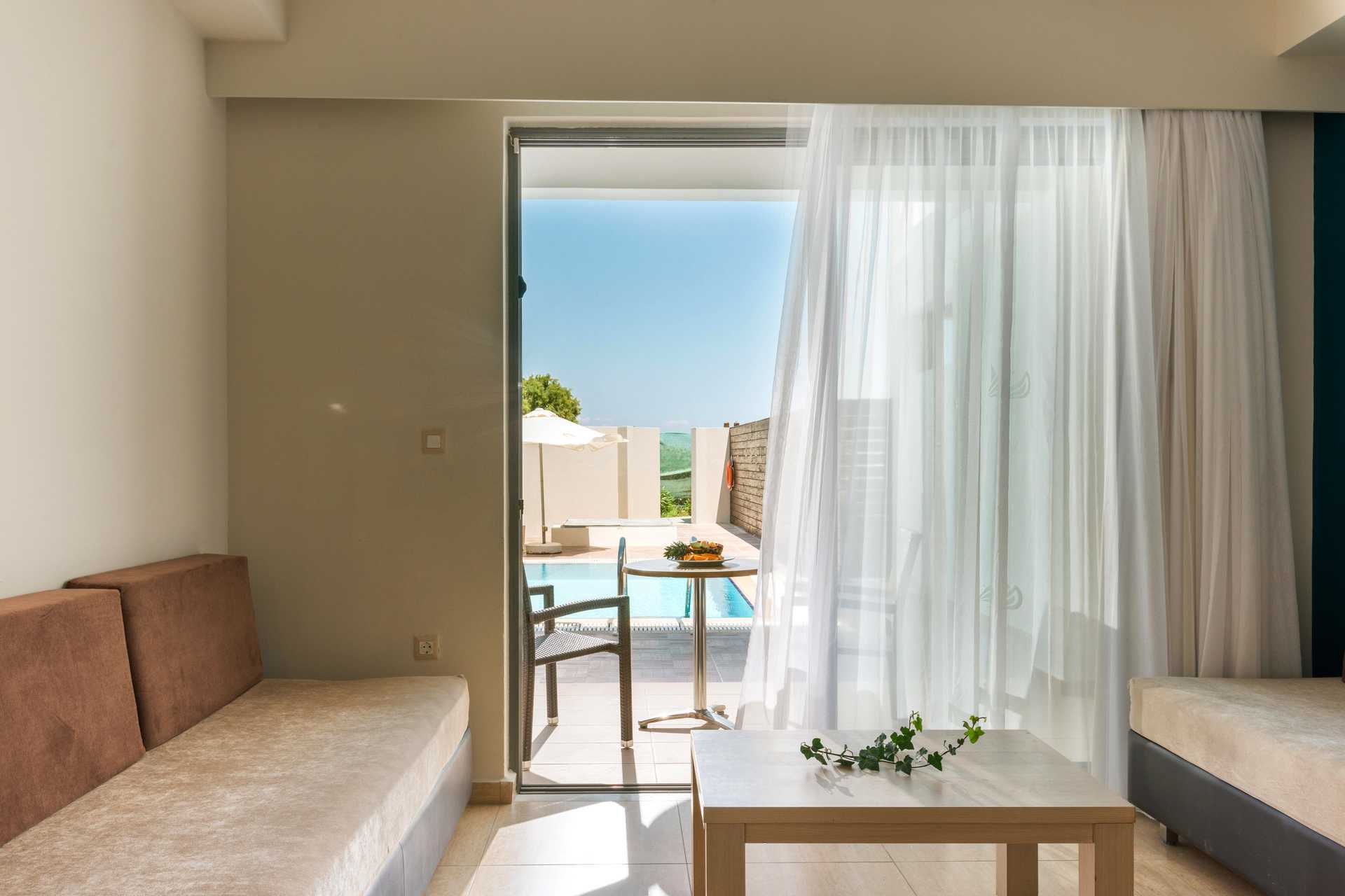 Perhehuoneita, joissa on ulkotila ja oma allas. Ulkotilassa on mukavat lounge-huonekalut ja aurinkotuolit. Makuuhuoneosa ja olohuoneosa, jotka voidaan erottaa väliovin. Parivuode. Lisävuodemahdollisuus vuodesohvasta. Tv kansainvälisillä kanavilla. Pieni jääkaappi ja vedenkeitin. Maksuton wifi, ilmastointi ja tallelokero. Hiustenkuivain. Amme/suihku ja wc. Siivous 7 krt/viikko.