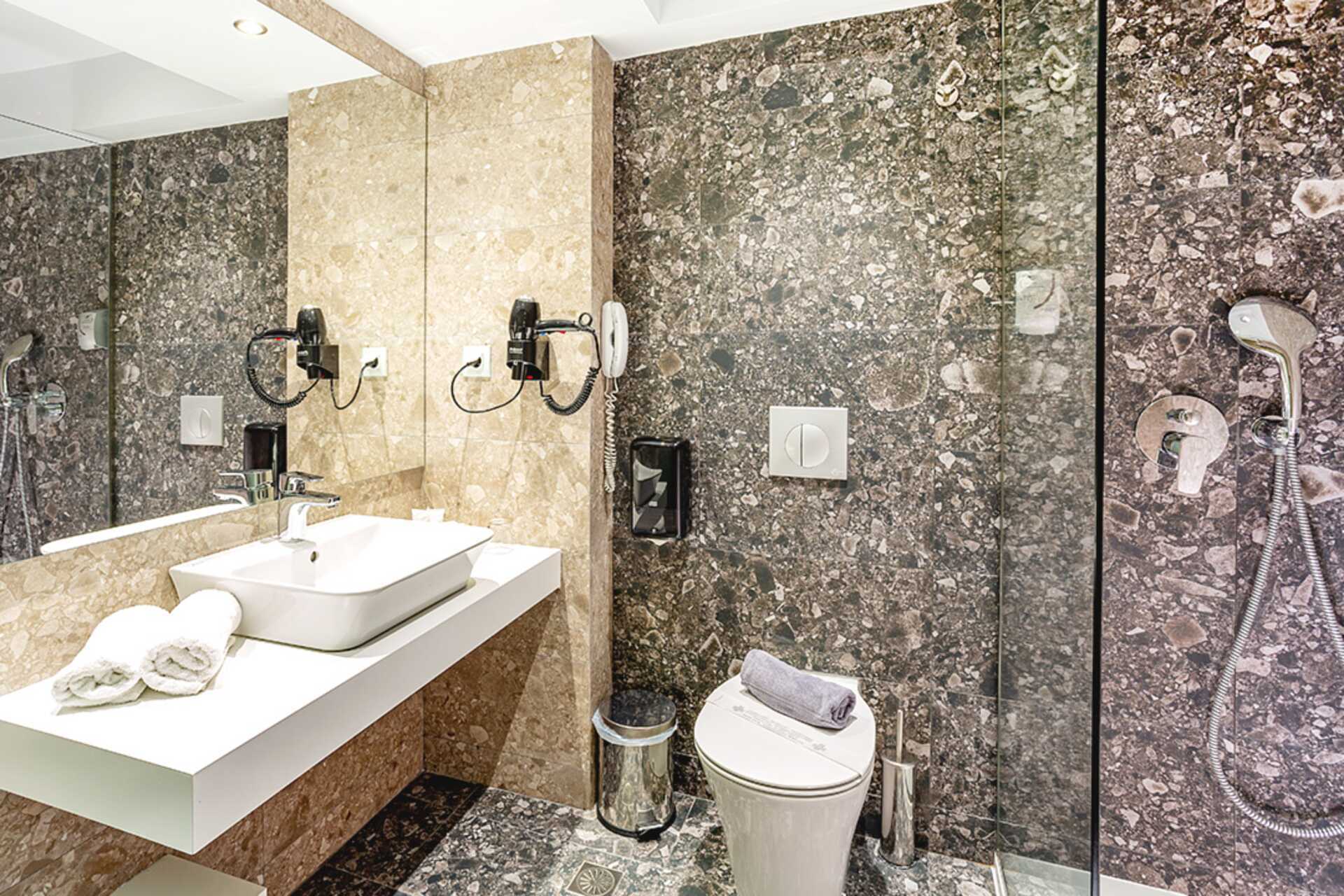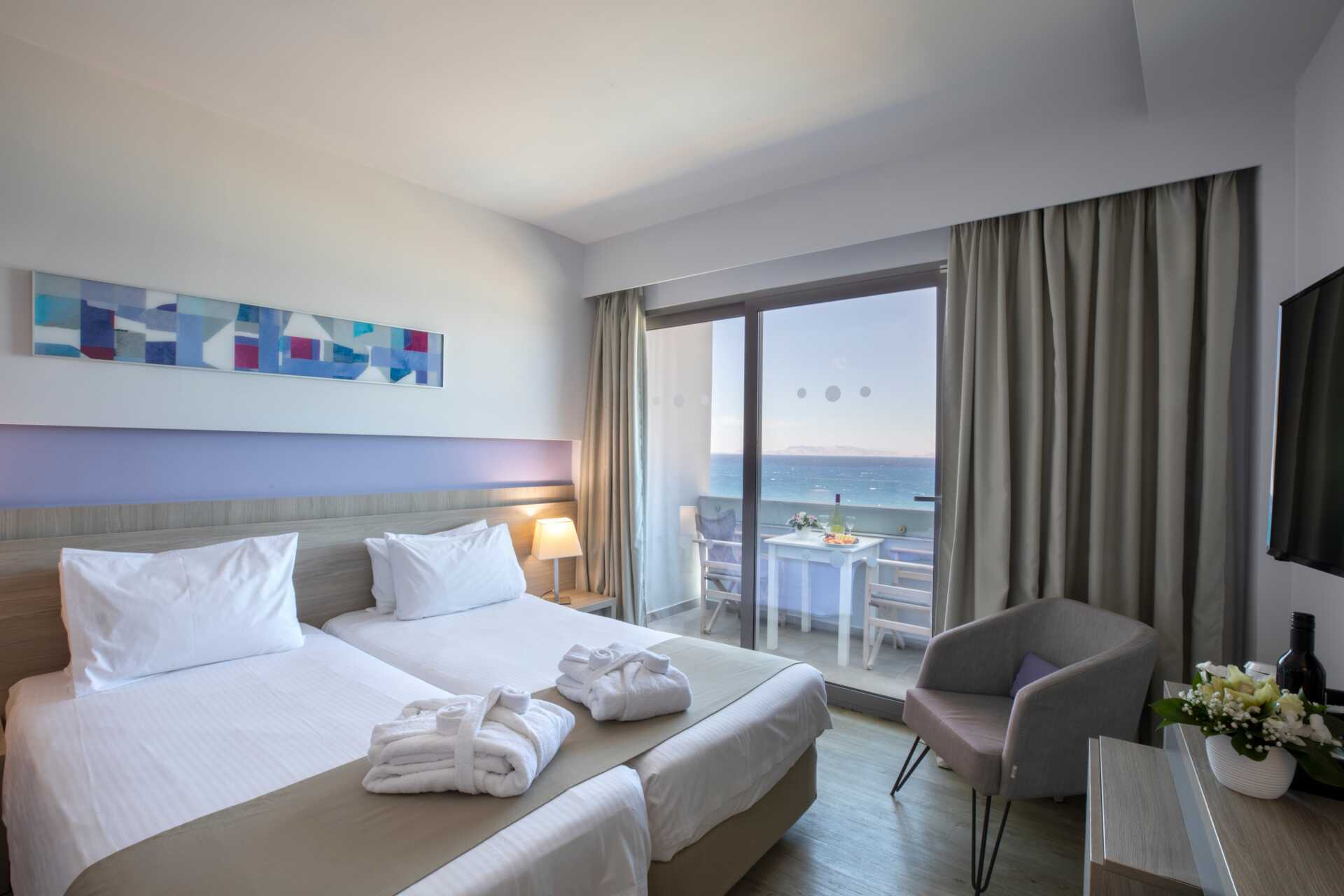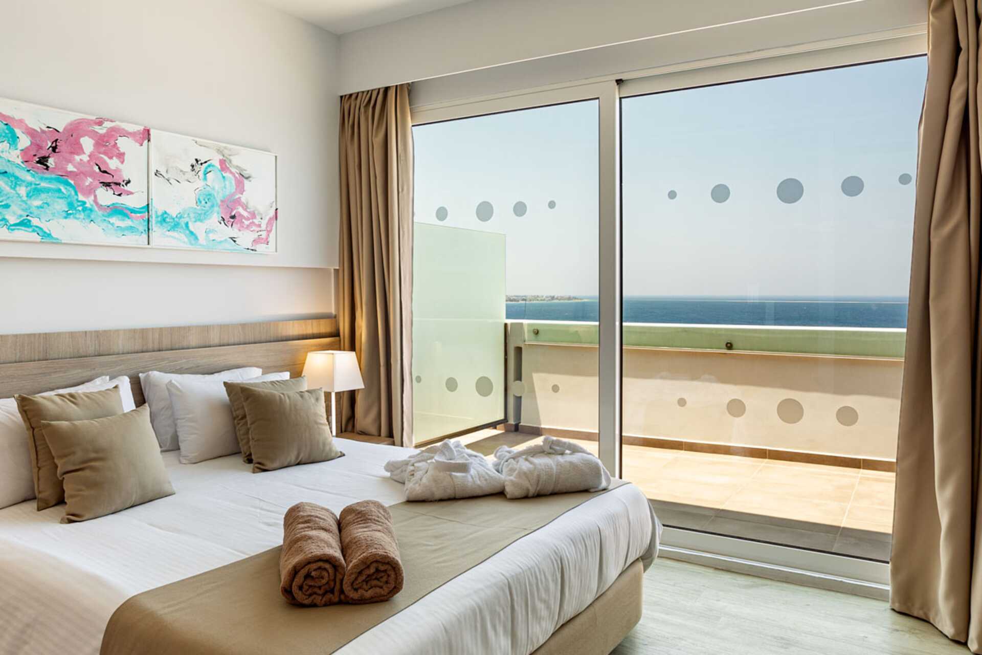 Sviitti, jossa on parveke. Jotkut parvekkeet merinäköalalla ja jotkut rajoitetuilla merinäköalalla. Yksi makuuhuone parivuoteella ja olohuone, jossa on mahdollisuus kahdelle lisävuoteelle kahdessa vuodesohvassa. Maksuton wifi, ilmastointi ja tallelokero. Huoneen minibaari sisältää päivittäin täytettävän viinin, oluen, virvoitusjuomien, mehun ja veden. Vedenkeitin, kahvia ja teetä sekä Nespresso-kahvinkeitin. Tv kansainvälisillä kanavilla. Tohvelit. Hiustenkuivain. Kylpyamme tai suihku ja wc. Siivous 7 krt/viikko.