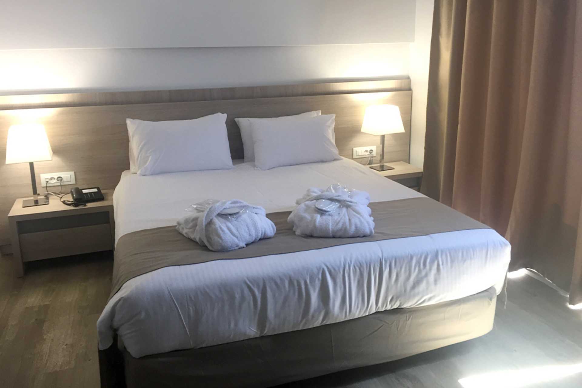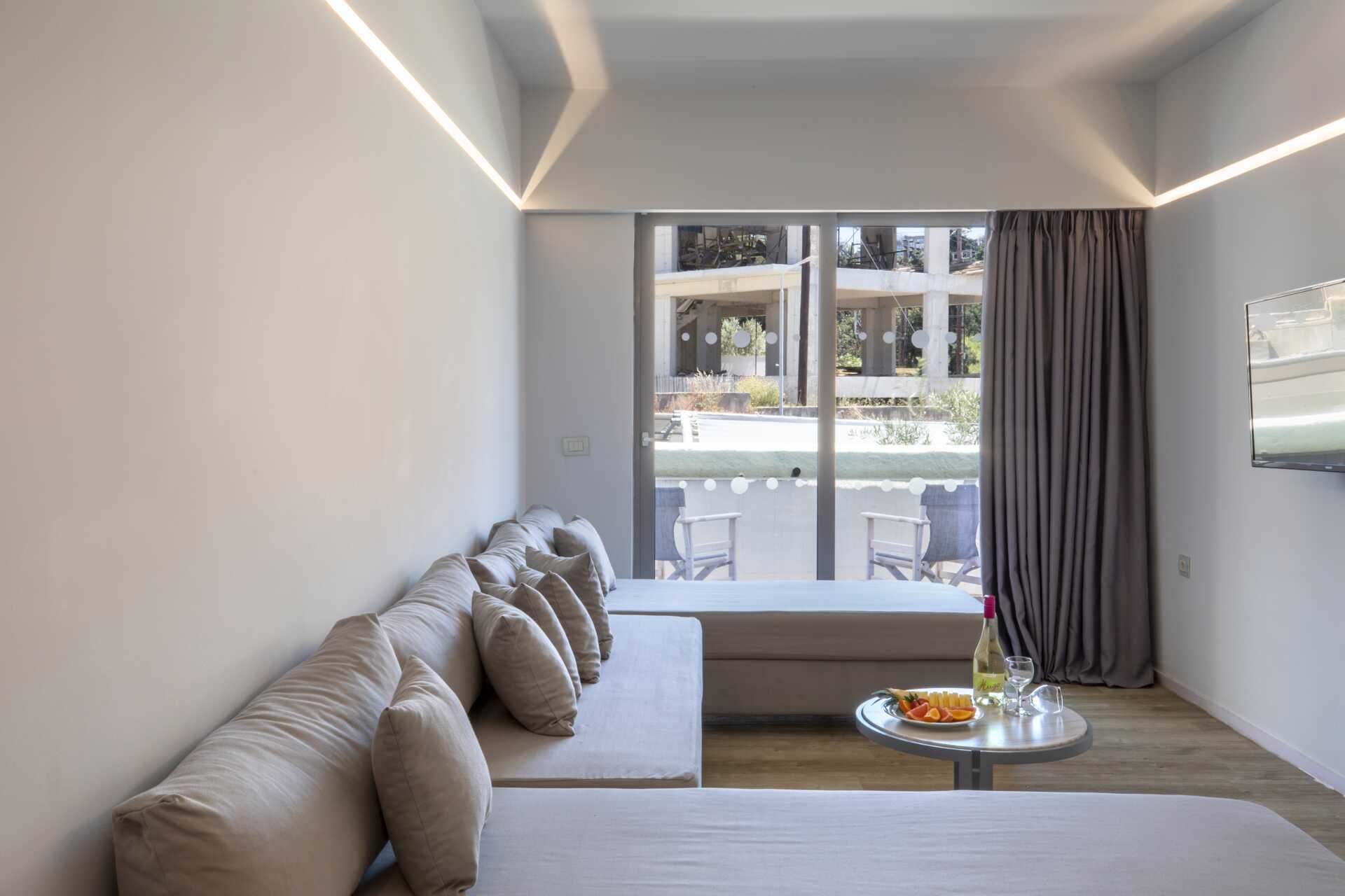 Perhehuone parvekkeella. Huoneet sijaitsevat hotellin sivurakennuksessa. Makuuhuone ja olohuone. Makuuhuoneessa parisänky ja mahdollisuus kolmeen lisävuoteeseen kolmessa vuodesohvassa. Maksuton wifi, ilmastointi ja tallelokero. Huoneen minibaari sisältyy hintaan, ja se täytetään päivittäin viinillä, oluella, virvoitusjuomilla, mehulla ja vedellä. Vedenkeitin, kahvia ja teetä. Tv kansainvälisillä kanavilla. Tohvelit. Hiustenkuivain. Suihku ja wc. Siivous 7 krt/viikko.