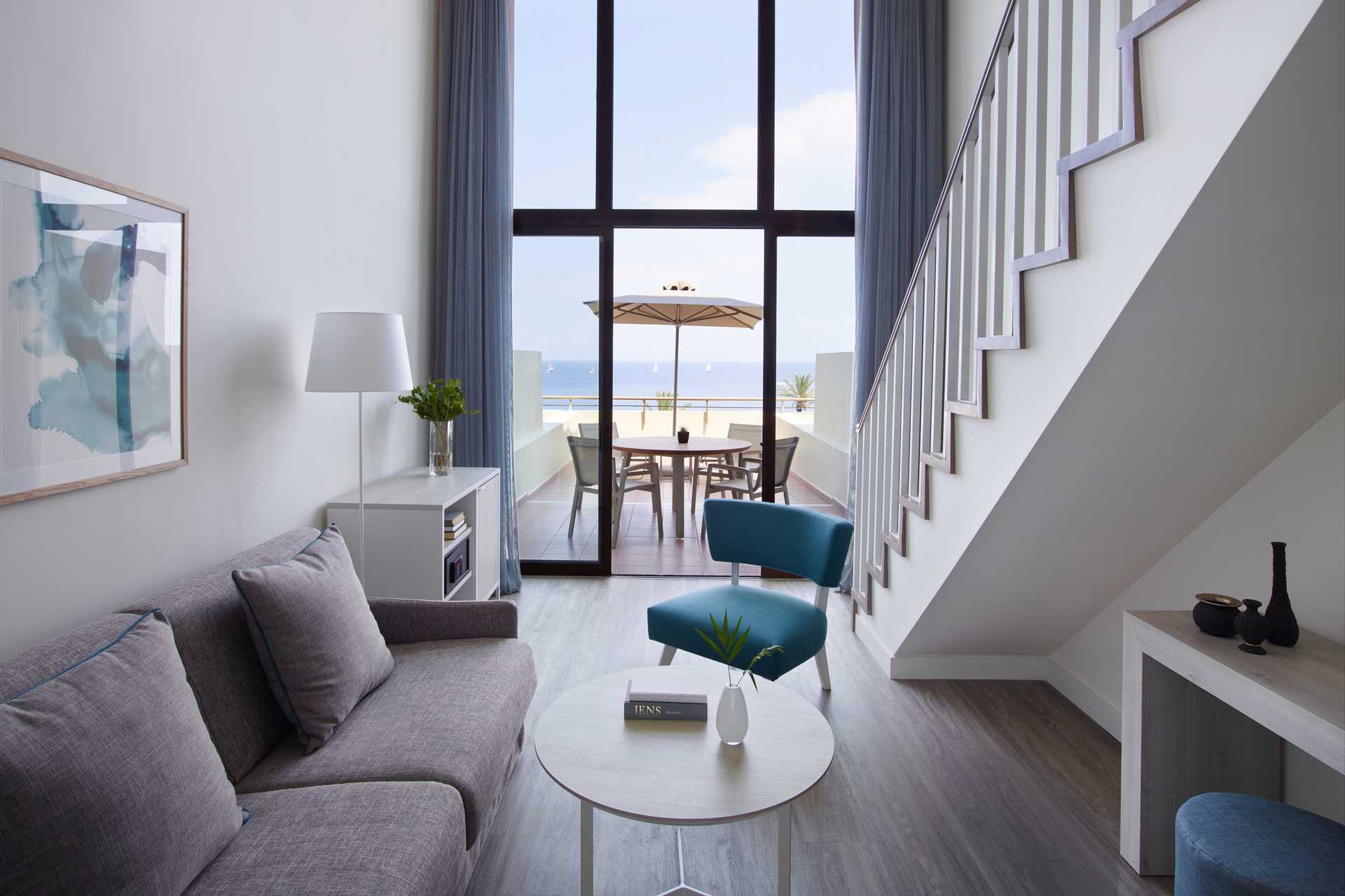 Deluxe-huone parvekkeella ja merinäköalalla. Huone koostuu makuuhuoneesta, jossa on parivuode. Parilla porrasaskelmalla pääset alas olohuoneeseen, jossa on vuodesohva. Maksuton wifi, ilmastointi ja tallelokero. Jääkaappi. Vedenkeitin, kahvia ja teetä. Nespresso-keitin. Tv kansainvälisillä kanavilla. Kylpytakit ja tohvelit. Kylpyhuoneessa suihku ja wc. Siivous 7 krt/viikko. Alle 2-vuotiaat lapset lasketaan lisävuoteella majoittuviksi henkilöiksi.