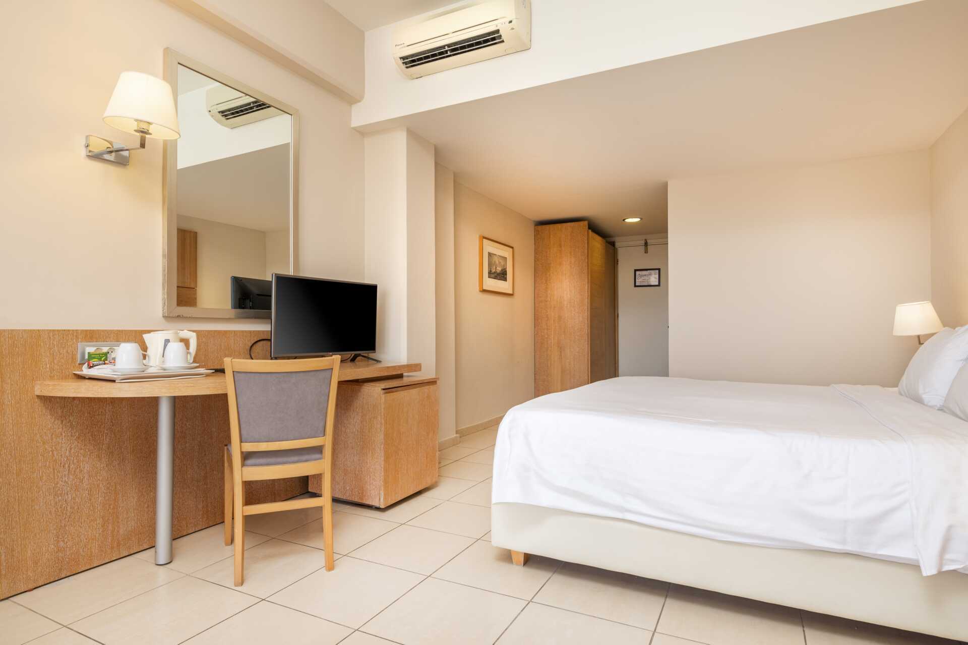 Perhehuone parvekkeella, osa merinäköalalla. Yksi parivuode tai kaksi erillistä vuodetta. Lisävuodemahdollisuus vuodesohvasta. Maksuton wifi, ilmastointi ja tallelokero. Jääkaappi. Vedenkeitin, kahvia ja teetä. Tv kansainvälisillä kanavilla. Hiustenkuivain. Kylpyhuoneessa kylpyamme tai suihku ja wc. Siivous 6 krt/viikko.
