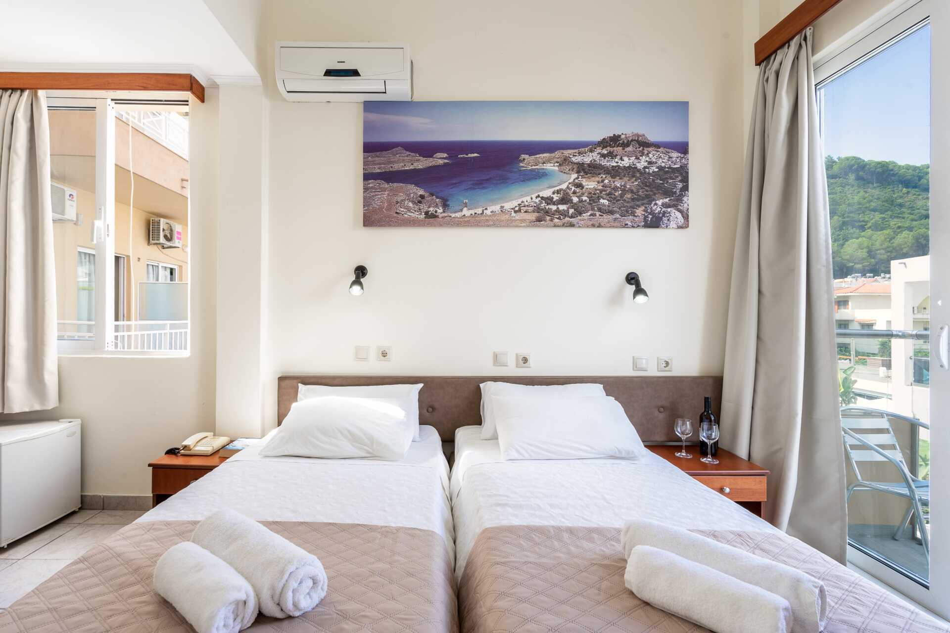 Kahden hengen huoneita, joissa on parveke. Parivuode tai kaksi yhden hengen vuodetta. Lisävuodemahdollisuus yhden hengen vuoteesta. Maksuton wifi ja ilmastointi. Tallelokero lisämaksusta. Jääkaappi. Tv kansainvälisillä kanavilla. Hiustenkuivain. Suihku ja wc. Siivous 6 krt/viikko.