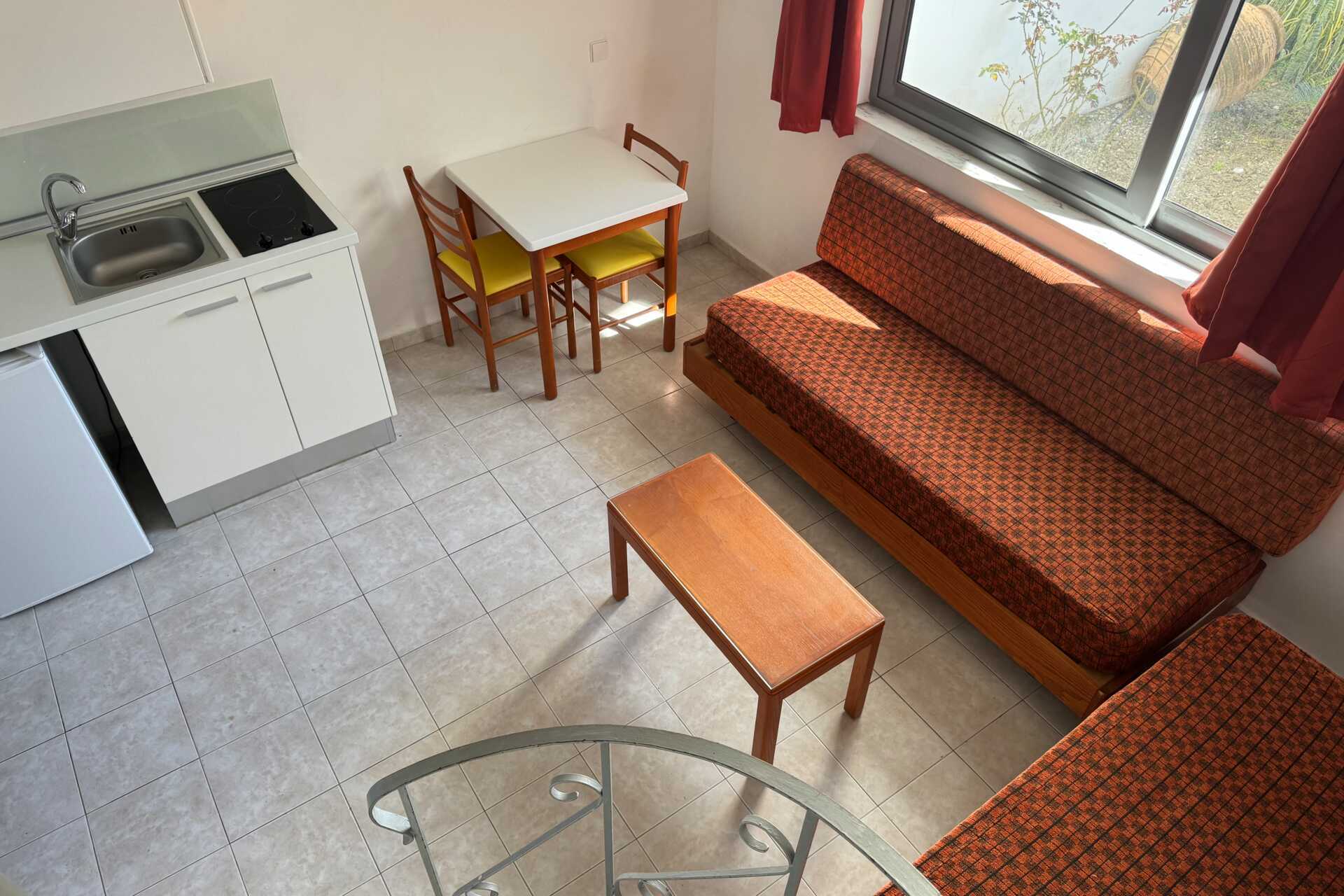 Yksiö alennetulla maatasolla, maaparveke ja näkymä uima-altaalle. Huoneisto on suurelle allasalueelle päin. Yhdistetty makuuhuone ja minikeittiö. Kaksi yhden hengen sänkyä tai yksi parivuode. Minikeittiössä keittolevyt, jääkaappi, vedenkeitin, kahvinkeitin ja yksinkertainen keittiövarustus. Maksuton wifi, ilmastointi ja tallelokero. Tv kansainvälisillä kanavilla. Hiustenkuivain. Kylpyhuoneessa kylpyamme tai suihku ja wc. Siivous 5 krt/viikko.