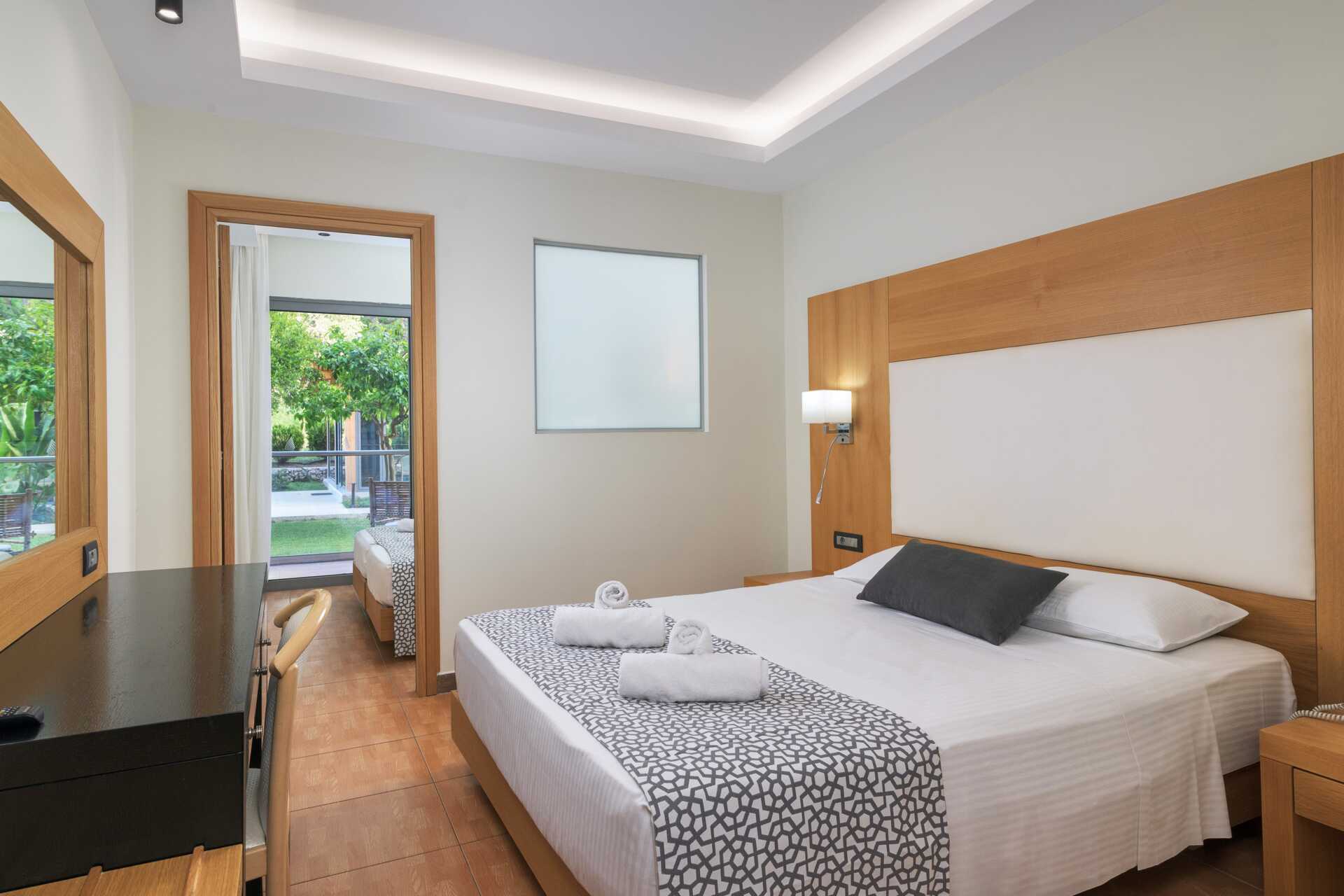 Perhehuone parvekkeella tai terassilla. Huone koostuu kahdesta erillisestä makuuhuoneesta. Kaksi yhden hengen sänkyä tai yksi parivuode. Lisävuodemahdollisuus kokoontaitettavaan sänkyyn. Wifi, tallelokero ja keskusilmastointi sisältyvät hintaan ajalla 15.4.–1.11. Jääkaappi. Vedenkeitin, kahvia ja teetä. Tv kansainvälisillä kanavilla. Hiustenkuivain. Kylpyhuoneessa suihku ja wc. Alle 2-vuotiaat lapset lasketaan lisävuoteella majoittuviksi henkilöiksi.