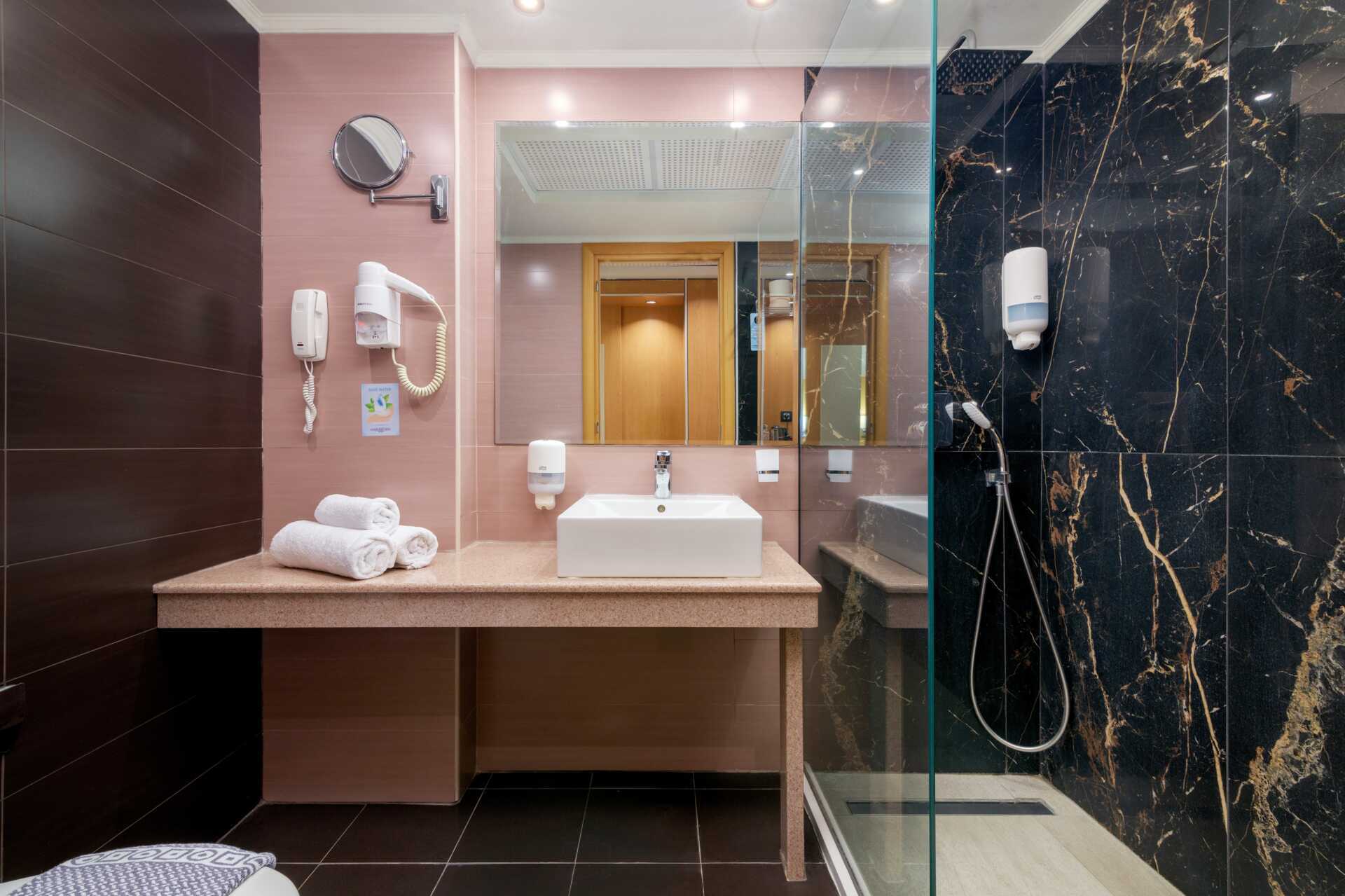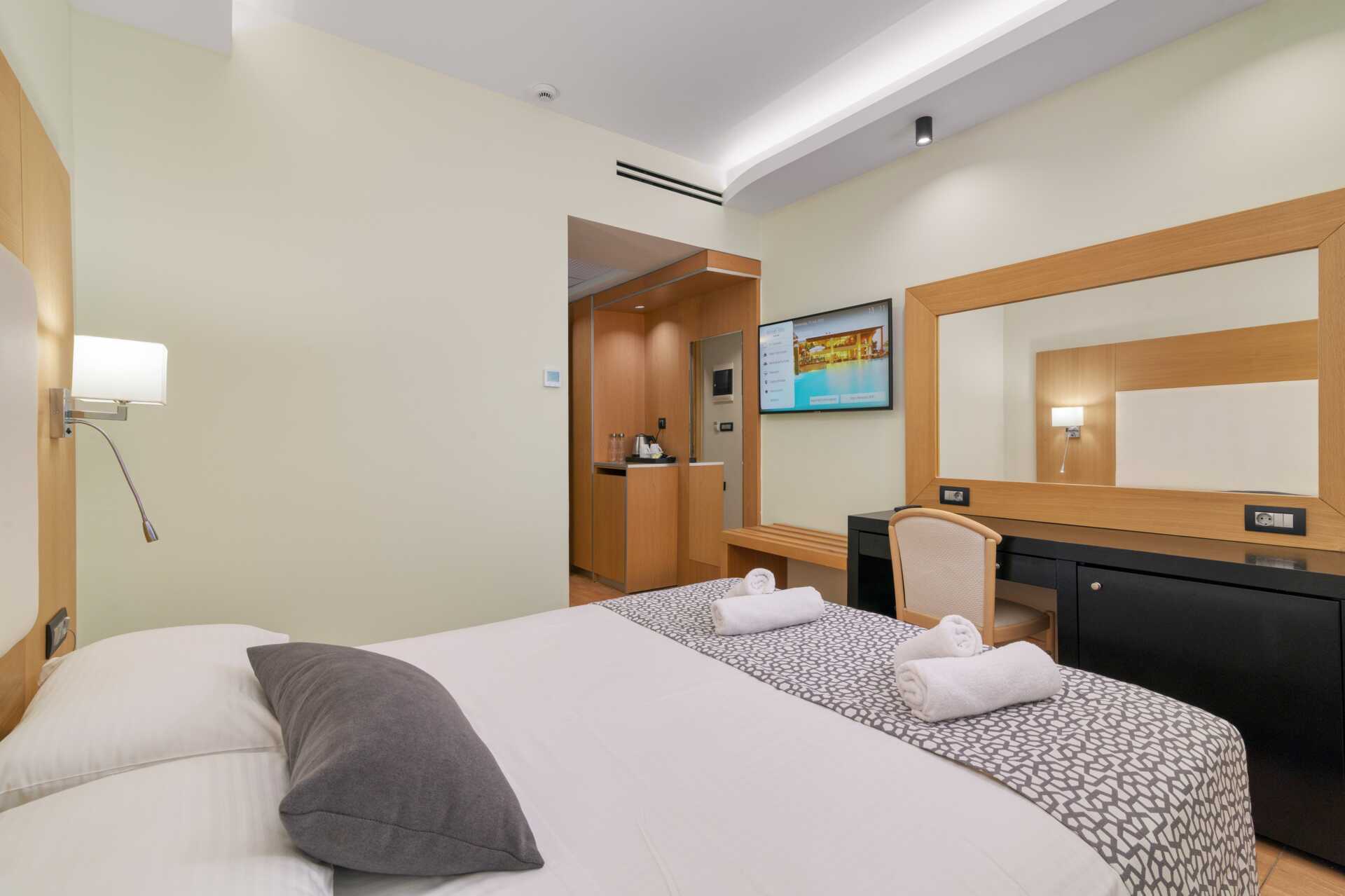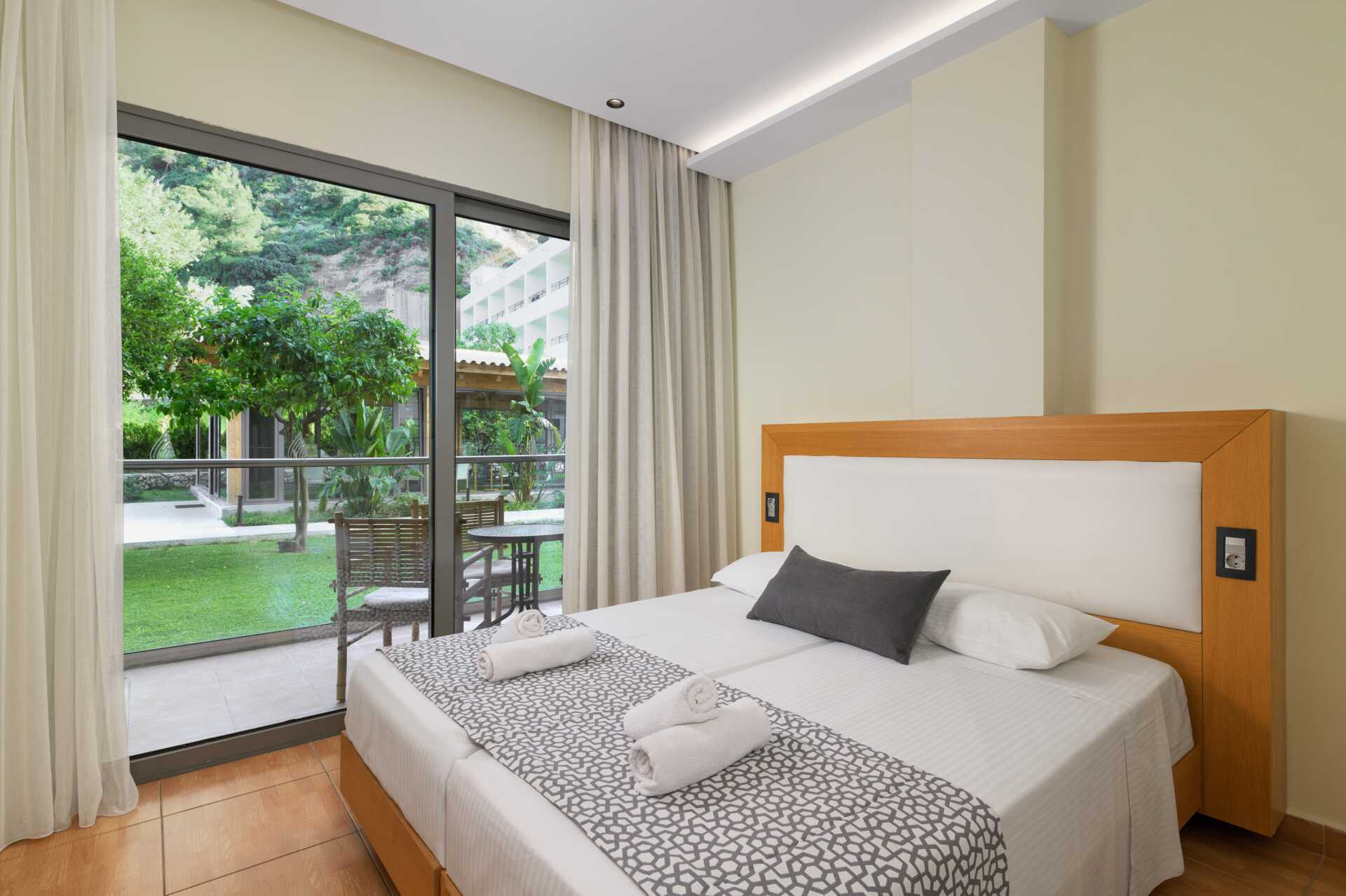 Superior-huone, jossa parveke tai terassi, osassa merinäköala. Kaksi yhden hengen sänkyä. Saatavilla on kolmas yhden hengen vuode. Wifi, tallelokero ja keskusilmastointi sisältyvät hintaan ajalla 15.4.–1.11.. Jääkaappi. Vedenkeitin, kahvia ja teetä. Kylpyhuoneessa suihku ja wc. Siivous 7 krt/viikko. Alle 2-vuotiaat lapset lasketaan lisävuoteella majoittuviksi henkilöiksi.