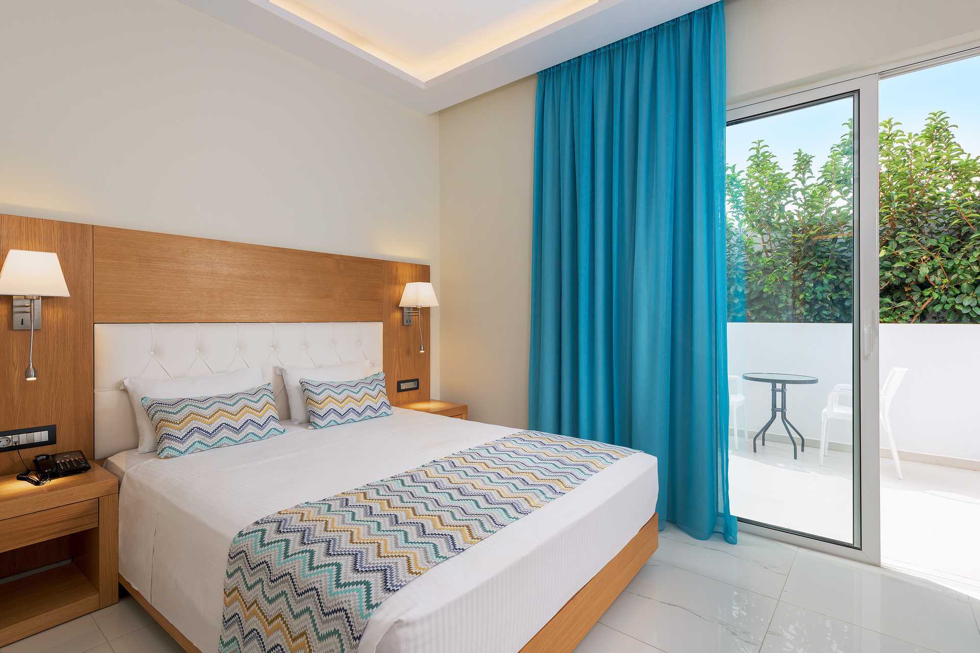 Perhehuoneita parvekkeella tai terassilla. Huoneet koostuvat kahdesta huoneesta, toisessa parivuode ja toisessa kaksi erillistä vuodetta. Maksuton wifi, ilmastointi ja tallelokero. Jääkaappi. Kahvin ja teen keittomahdollisuus. Vesipullo saavuttaessa. Tv satelliittikanavilla molemmissa huoneissa. Suihku ja wc. Siivous 7 krt/viikko.