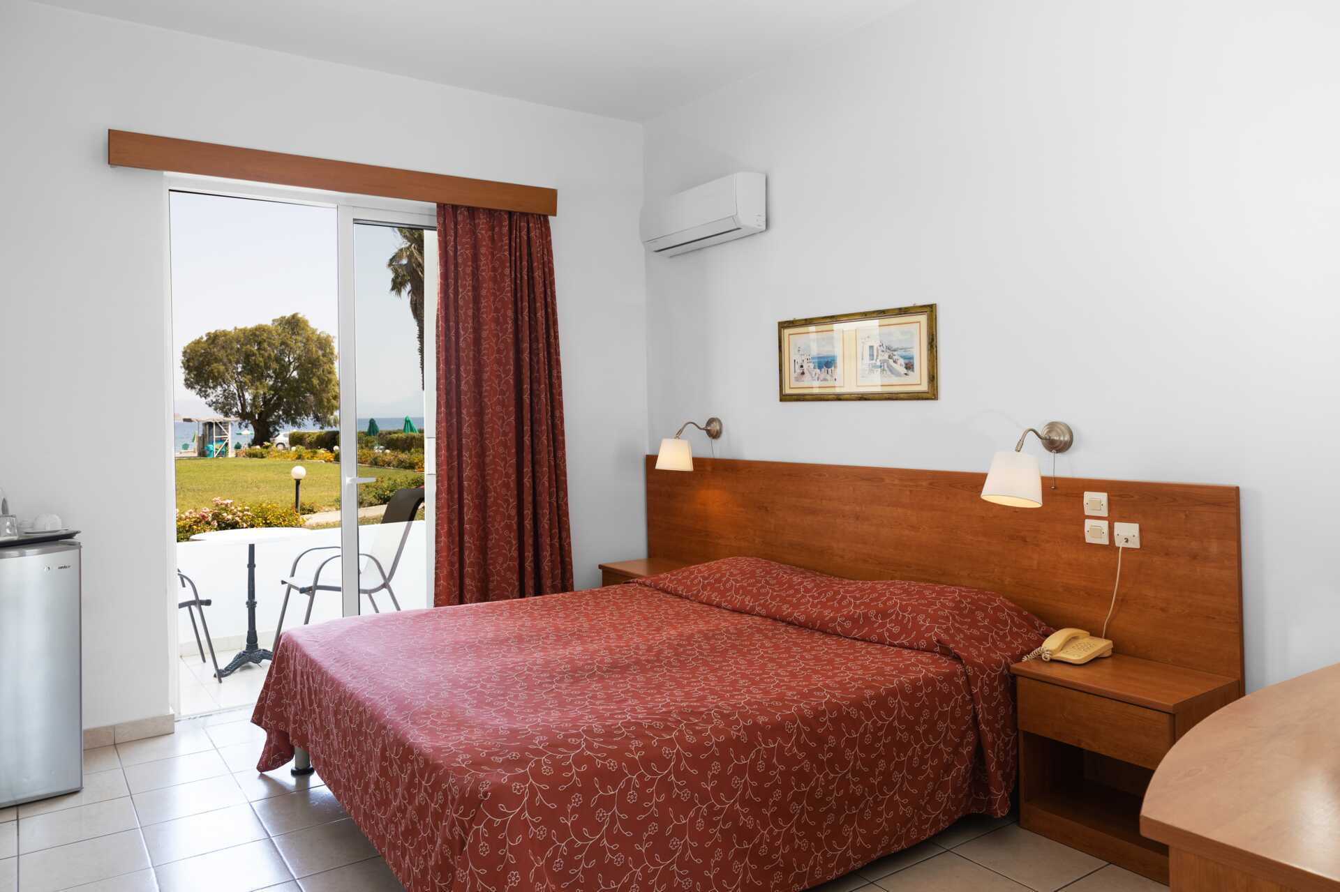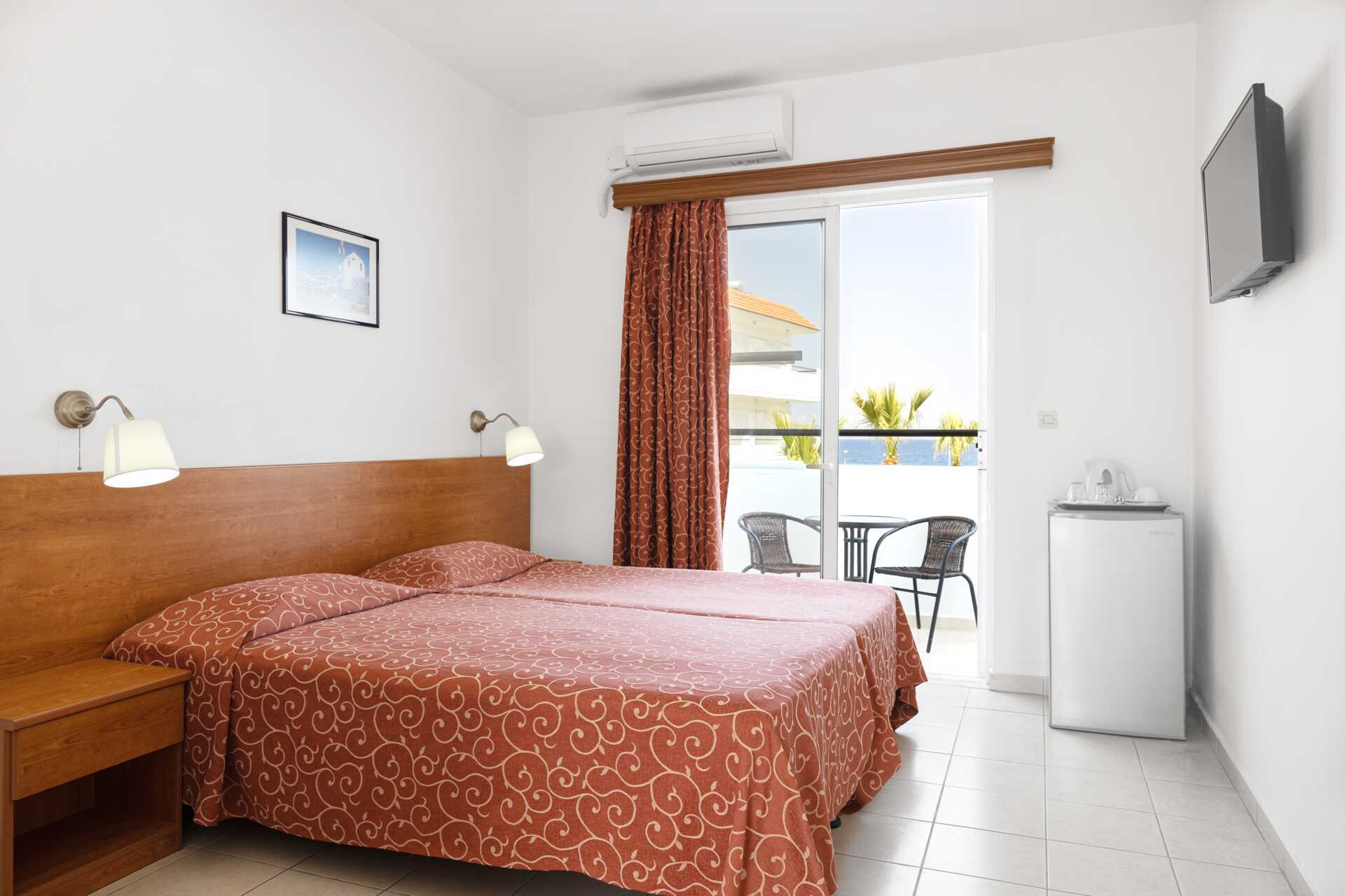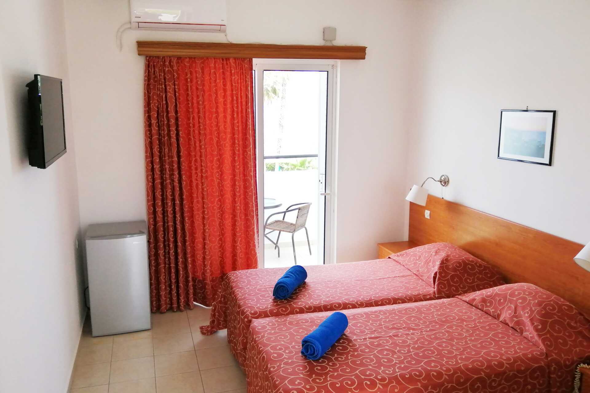 Kahden hengen huoneessa on parveke tai maaparveke, joiltakin parvekkeilta on rajoitettu merinäköala. Kaksi yhden hengen sänkyä. Lisävuodemahdollisuus kolmannelle henkilölle. Maksuton wifi ja ilmastointi. Tallelokero lisämaksusta. Jääkaappi. Vedenkeitin. Hiustenkuivain. Amme ja wc. Siivous 7 krt/viikko.