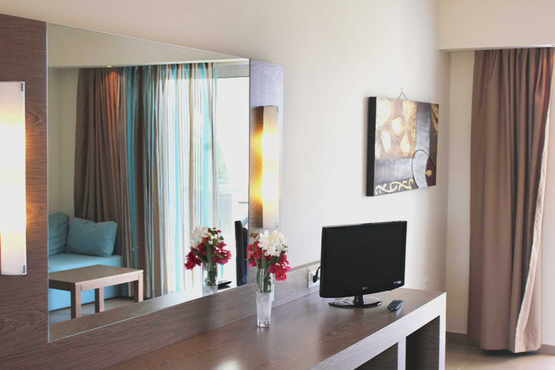 Perhehuoneita parvekkeella tai terassilla. Erillinen makuuhuone ja olohuone. Kaksi yhden hengen vuodetta. Lisävuodemahdollisuus vuodesohvasta. Maksuton wifi, ilmastointi ja tallelokero. Jääkaappi. Hiustenkuivain. Amme/suihku ja wc. Siivous 6 krt/viikko.