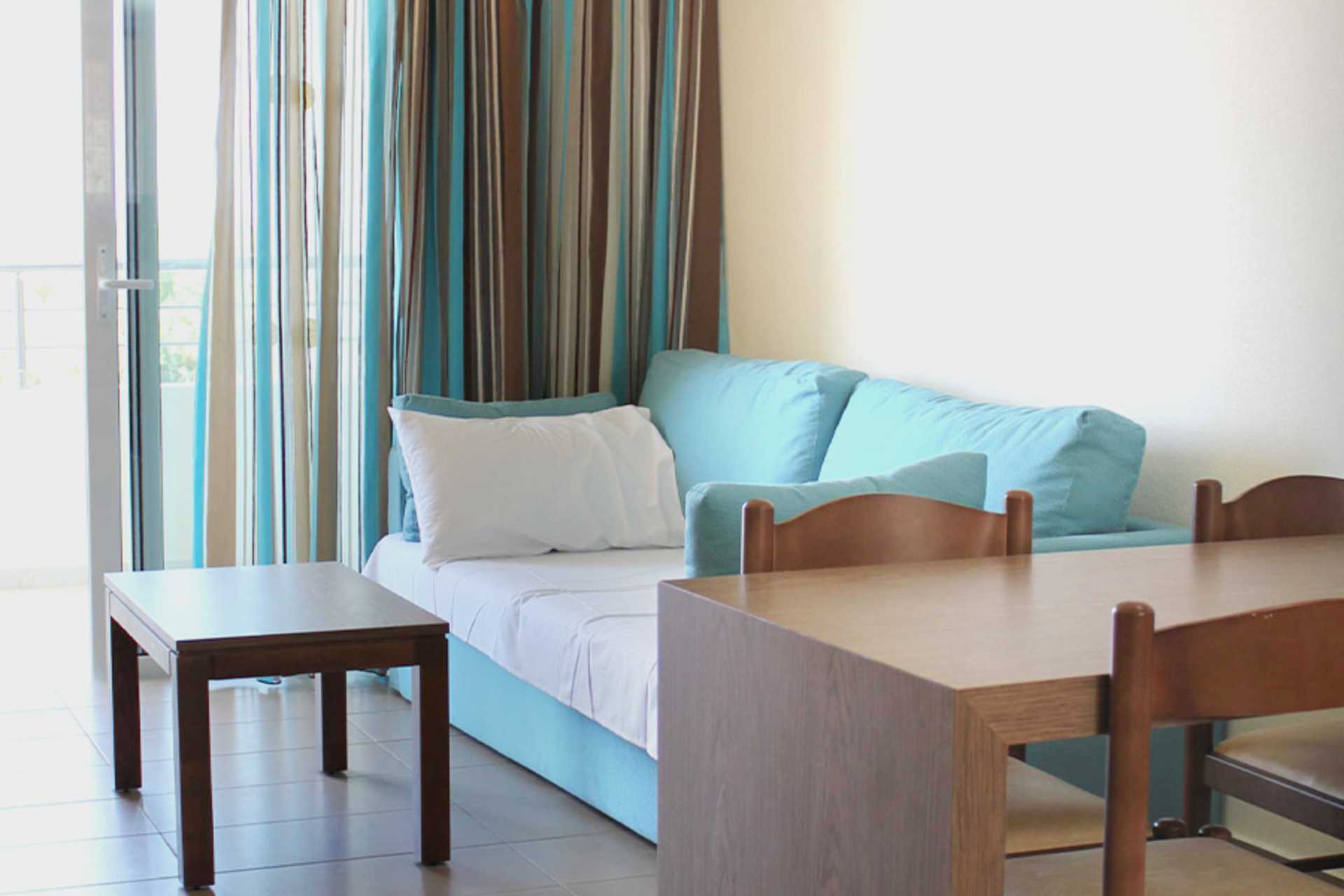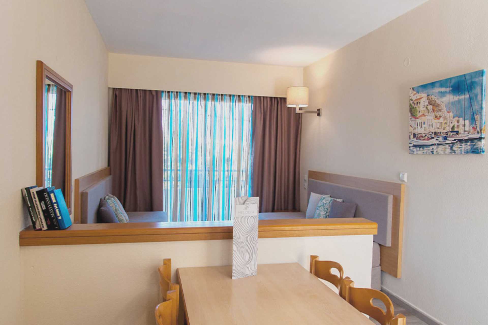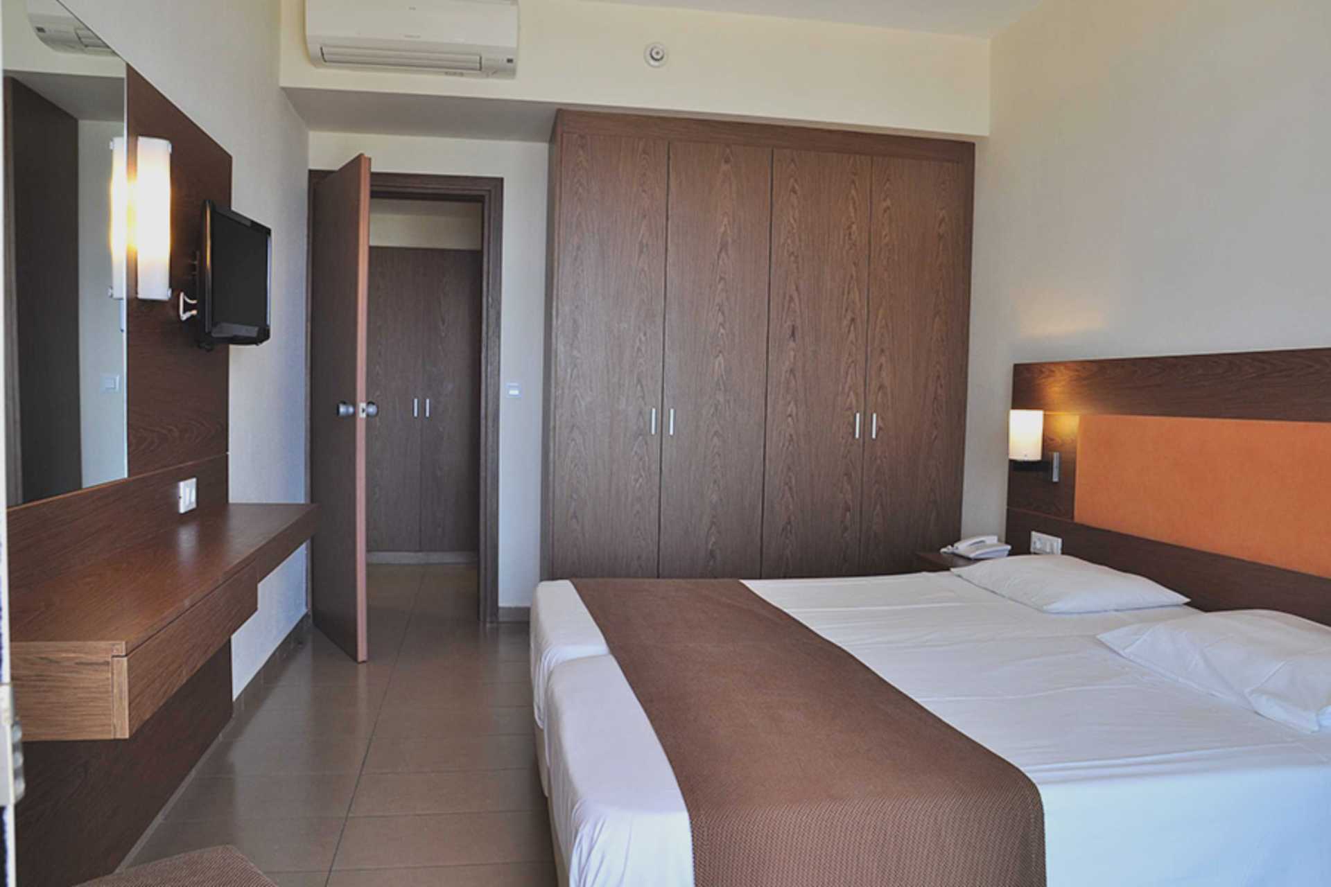 Kahden hengen huone parvekkeella tai terassilla. Kaksi yhden hengen sänkyä. Lisävuodemahdollisuus vuodesohvasta. Maksuton wifi, ilmastointi ja tallelokero. Jääkaappi. Tv kansainvälisillä kanavilla. Hiustenkuivain. Kylpyamme tai suihku ja wc. Siivous 6 krt/viikko.