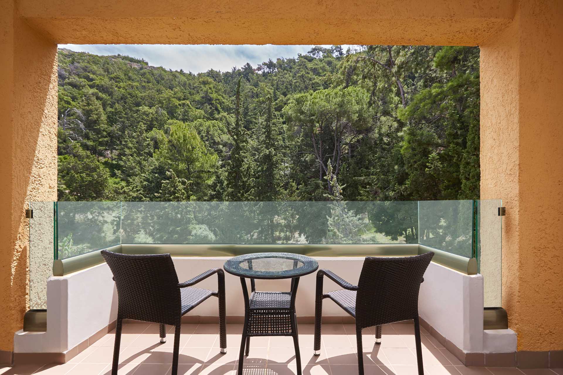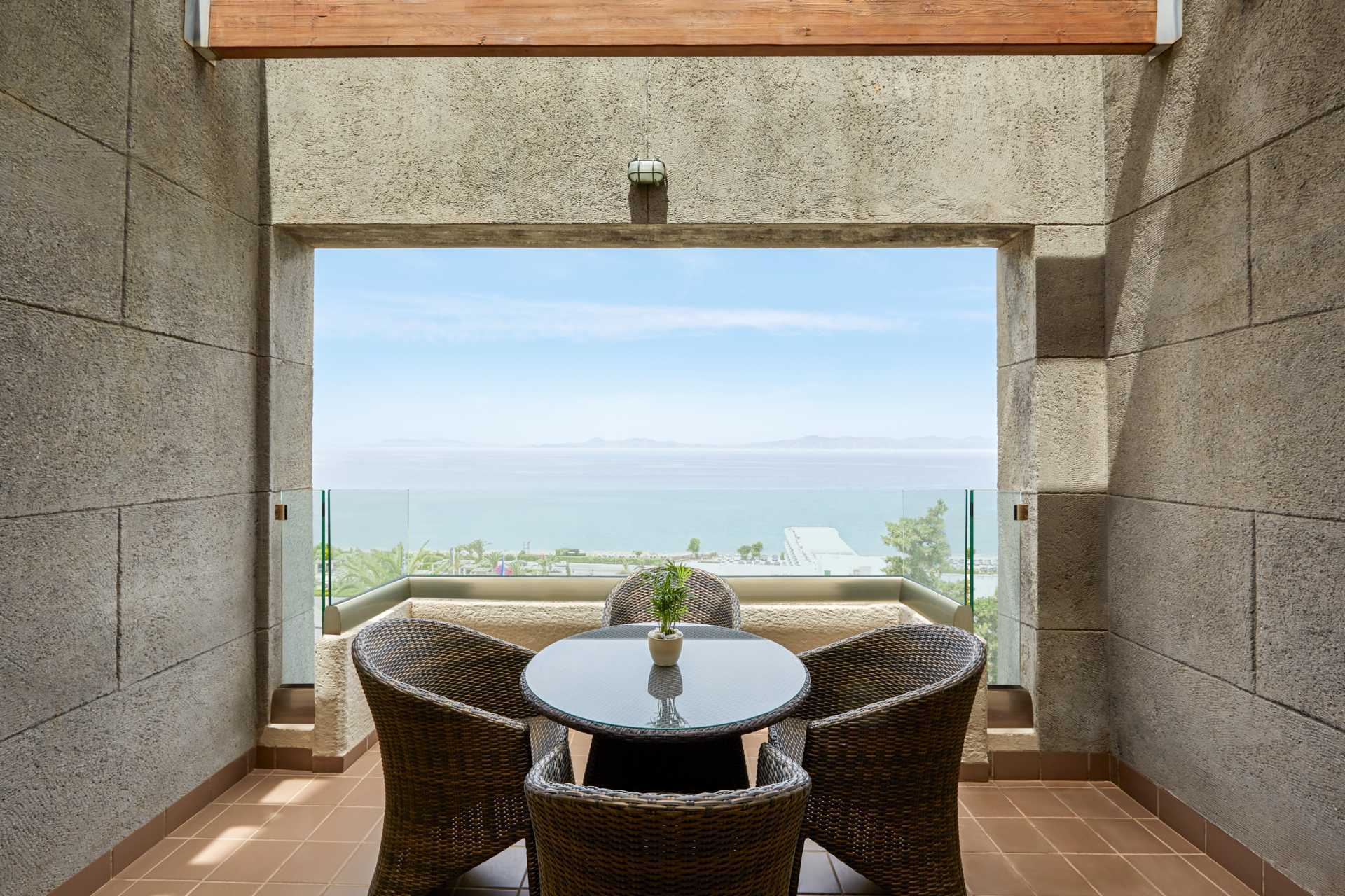Deluxe-huone parvekkeella ja merinäköalalla. Parivuode tai kaksi yhden hengen sänkyä. Mahdollisuus lisävuoteeseen kokoontaitettavasta vuoteesta. Maksuton wifi, ilmastointi ja tallelokero. Jääkaappi. Vesipullo per henkilö sisältyy saavuttaessa. Vedenkeitin, kahvia ja teetä. Työpöytä ja pieni pöytä ja kaksi tuolia. Tv kansainvälisillä kanavilla. Hiustenkuivain. Kylpyhuoneessa suihku ja wc. Siivous 7 krt/viikko.