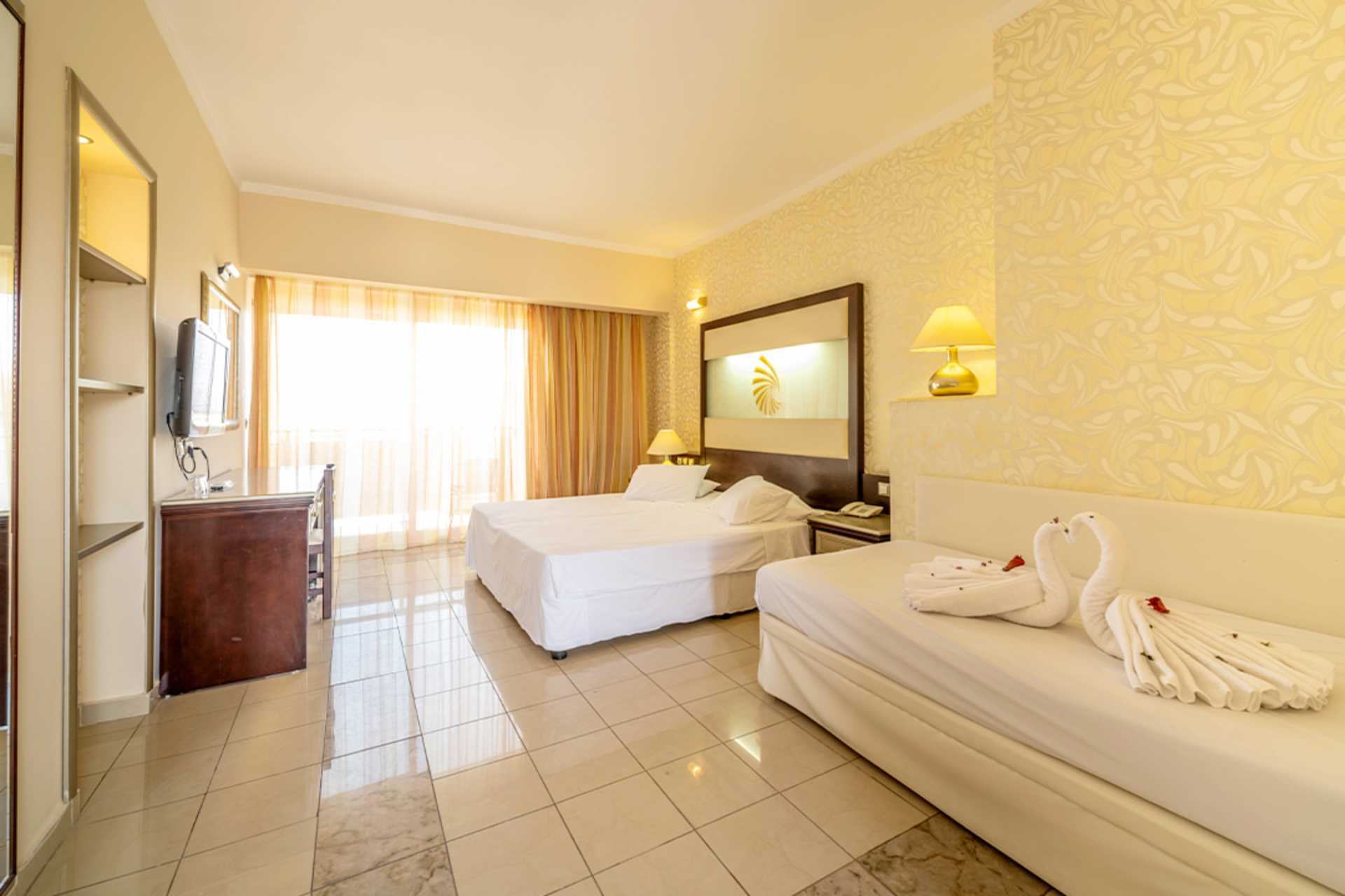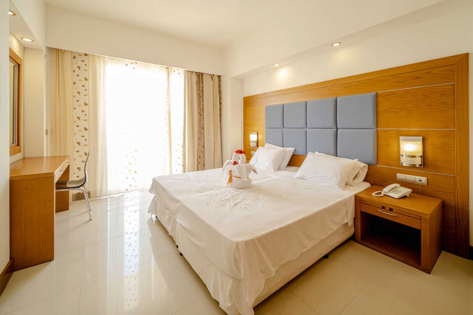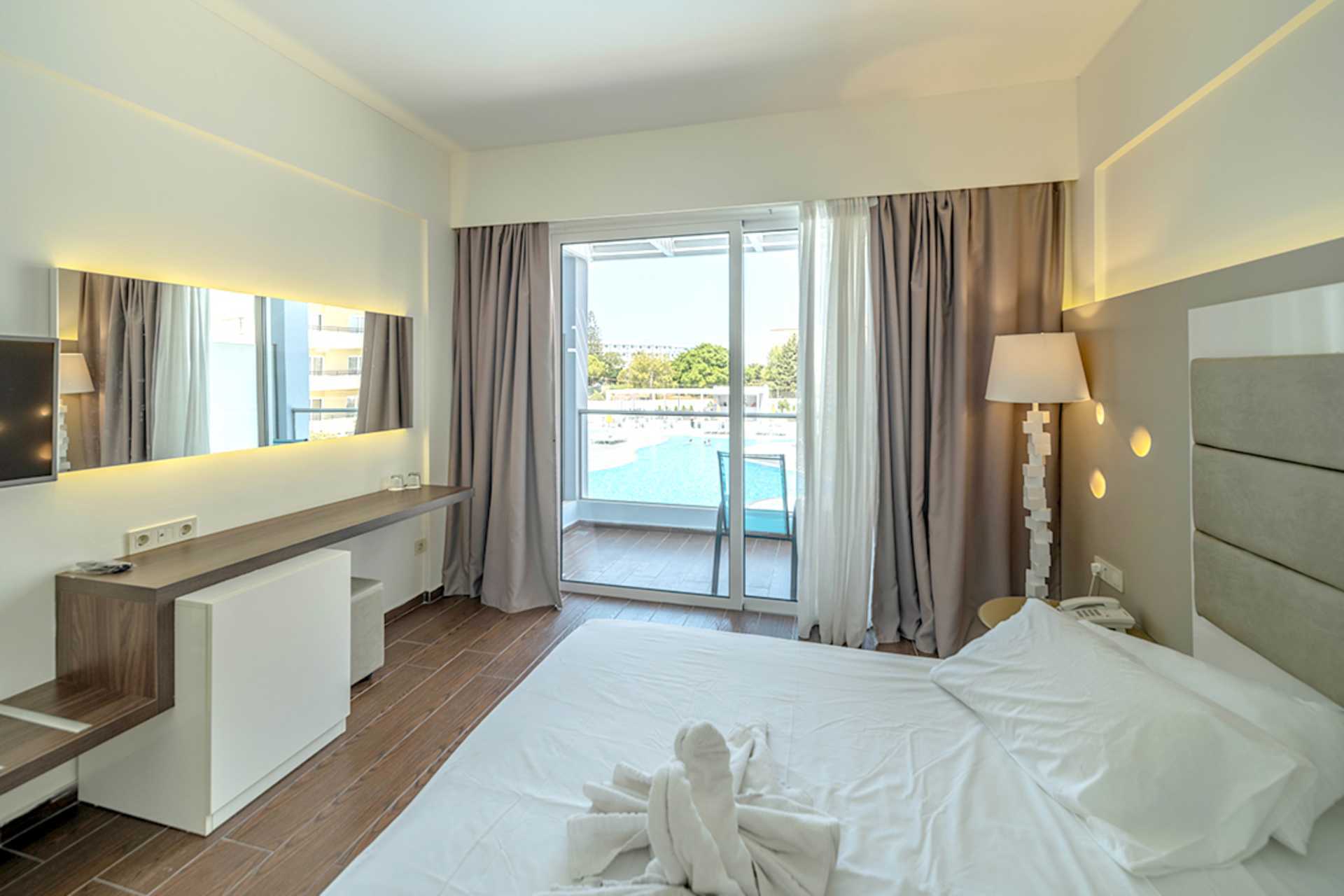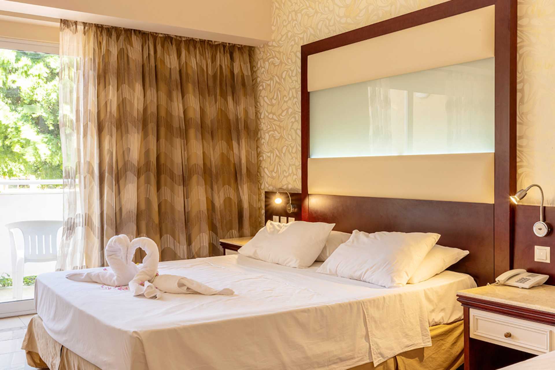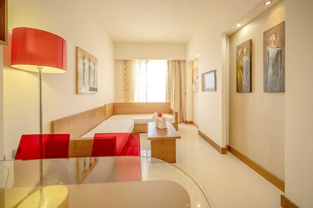 Perhehuone parvekkeella, osassa merinäköala ja osassa näkymä uima-altaalle. Makuuhuone, jossa on parivuode tai kaksi erillistä sänkyä. Parvekkeella, sekä parvekkeella ja merinäköalalla varustetuissa huoneissa (noin 45 neliömetriä) on olohuone, johon on mahdollista saada lisävuode vuodesohvaan. Näkymällä uima-altaalle varustetut huoneet (36 neliömetriä) on kaksi vuodesohvaa makuutilassa, joka voidaan erottaa makuuhuoneesta liukuovilla. Huoneisiin allasnäkymällä pääsee pienen tien yli. Maksuton wifi, ilmastointi ja tallelokero. Ilmastointi on käytettävissä 1. kesäkuuta - 30. syyskuuta. Jääkaappi. Tv kansainvälisillä kanavilla. Hiustenkuivain. Kylpyamme tai suihku ja wc. Siivous 7 krt/viikko.