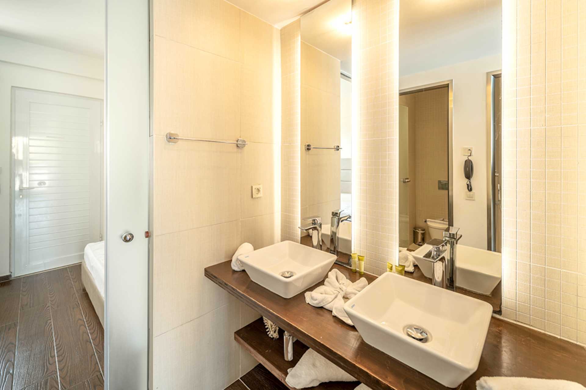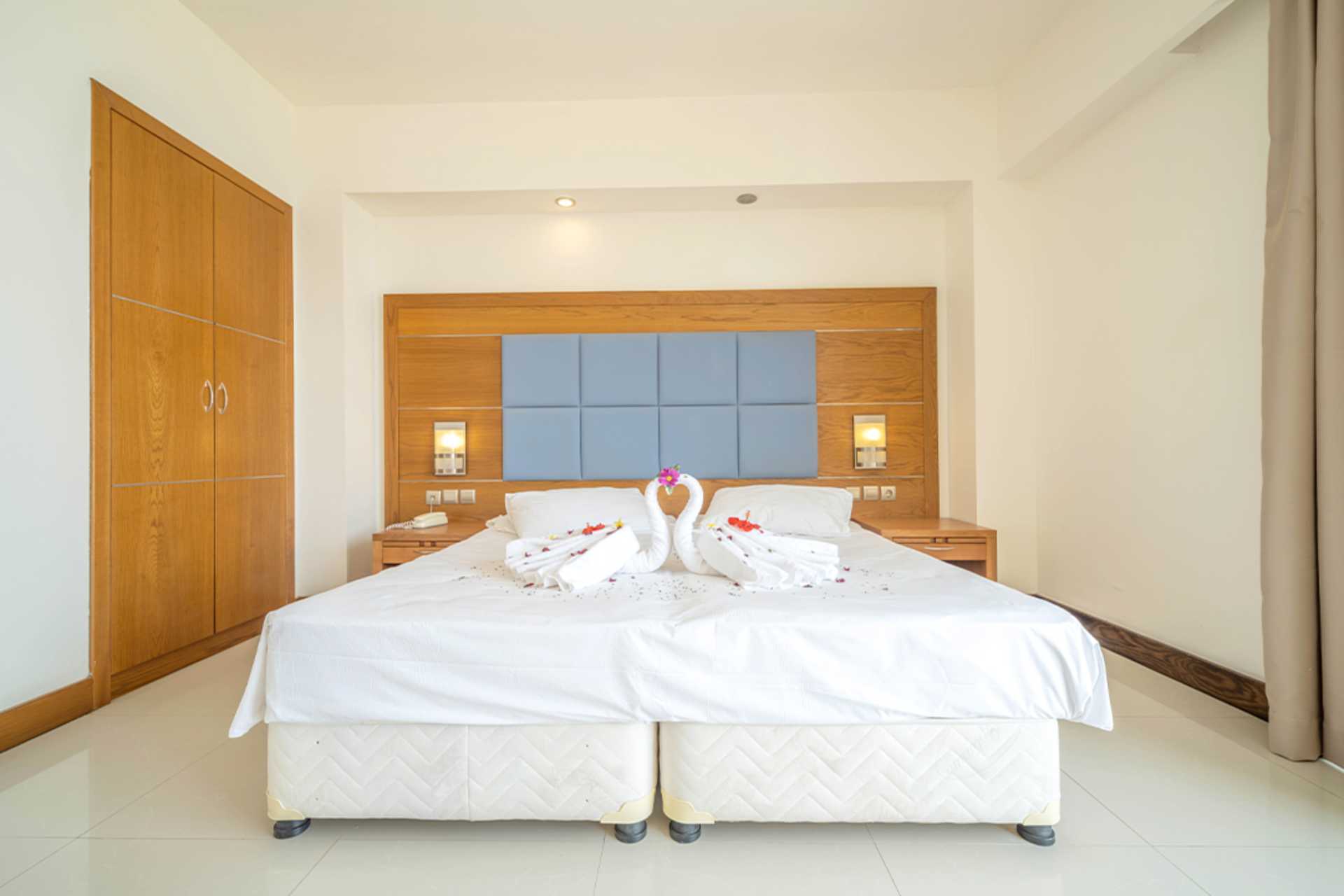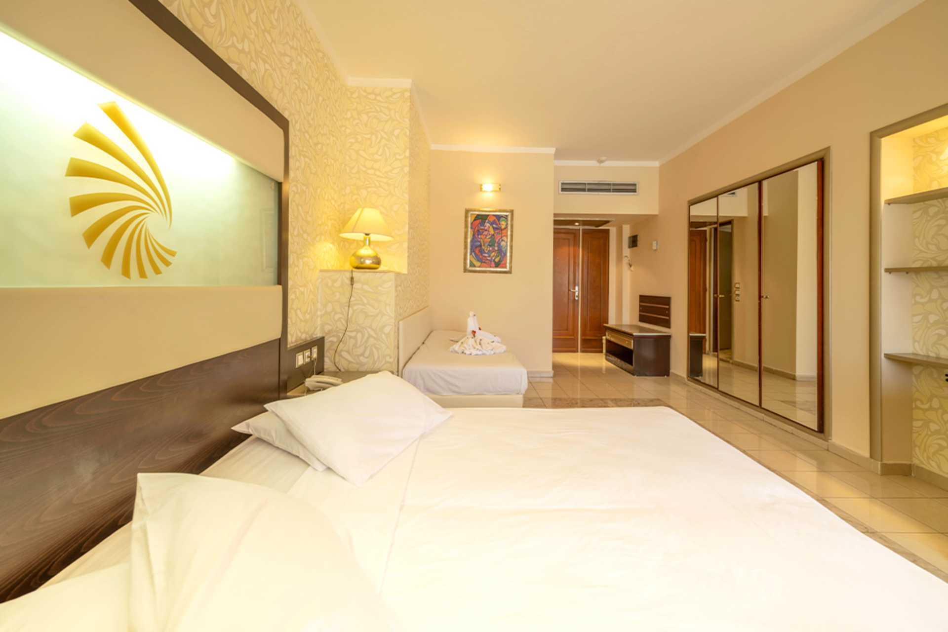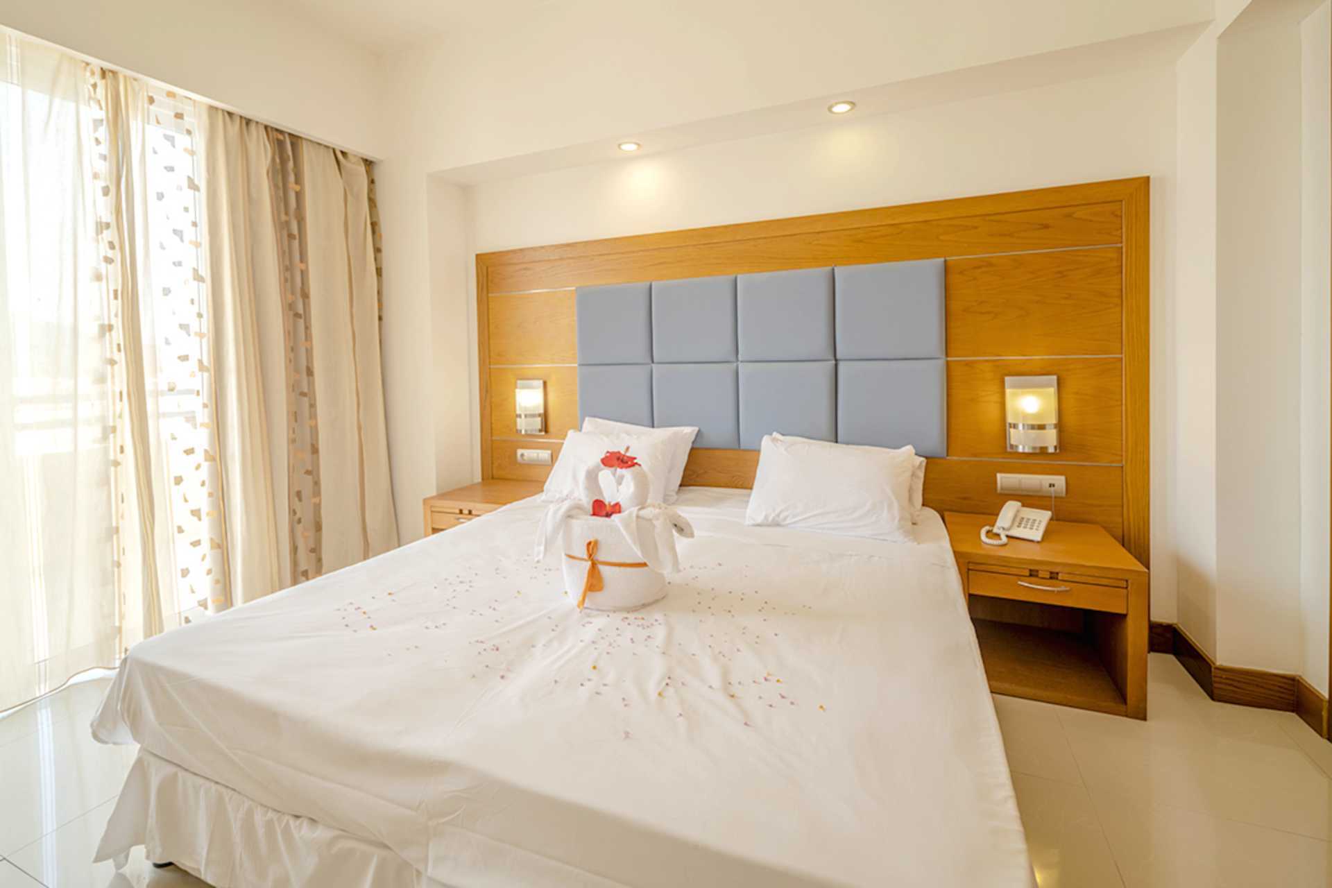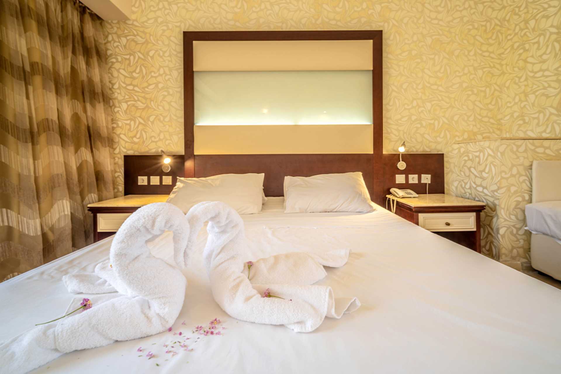 Perhehuone parvekkeella, osassa merinäköala ja osassa näkymä uima-altaalle. Makuuhuone, jossa on parivuode tai kaksi erillistä sänkyä. Parvekkeella, sekä parvekkeella ja merinäköalalla varustetuissa huoneissa (noin 45 neliömetriä) on olohuone, johon on mahdollista saada lisävuode vuodesohvaan. Näkymällä uima-altaalle varustetut huoneet (36 neliömetriä) on kaksi vuodesohvaa makuutilassa, joka voidaan erottaa makuuhuoneesta liukuovilla. Huoneisiin allasnäkymällä pääsee pienen tien yli. Maksuton wifi, ilmastointi ja tallelokero. Ilmastointi on käytettävissä 1. kesäkuuta - 30. syyskuuta. Jääkaappi. Tv kansainvälisillä kanavilla. Hiustenkuivain. Kylpyamme tai suihku ja wc. Siivous 7 krt/viikko.