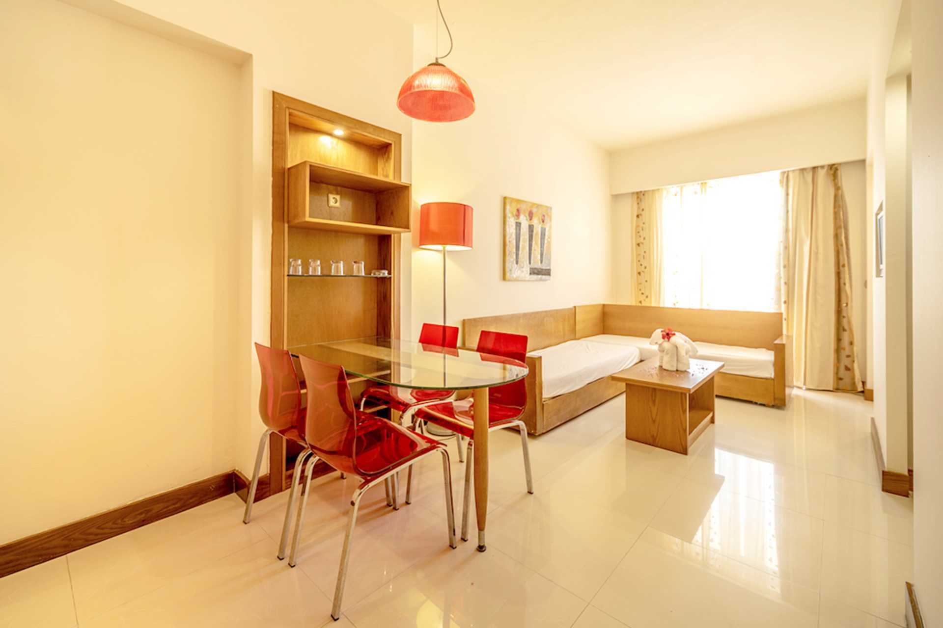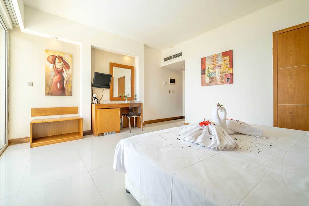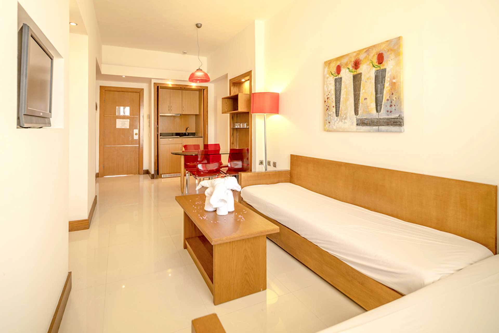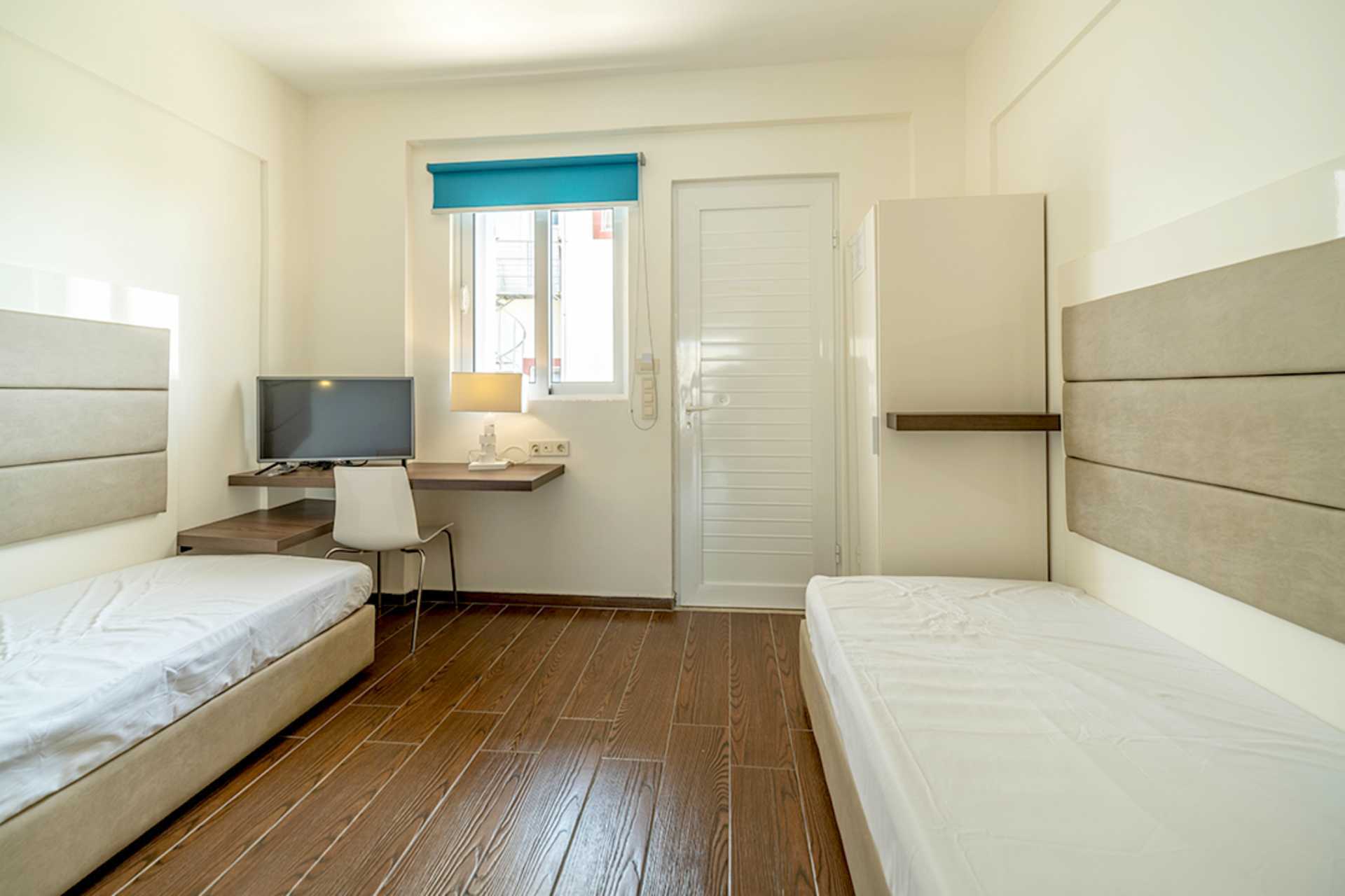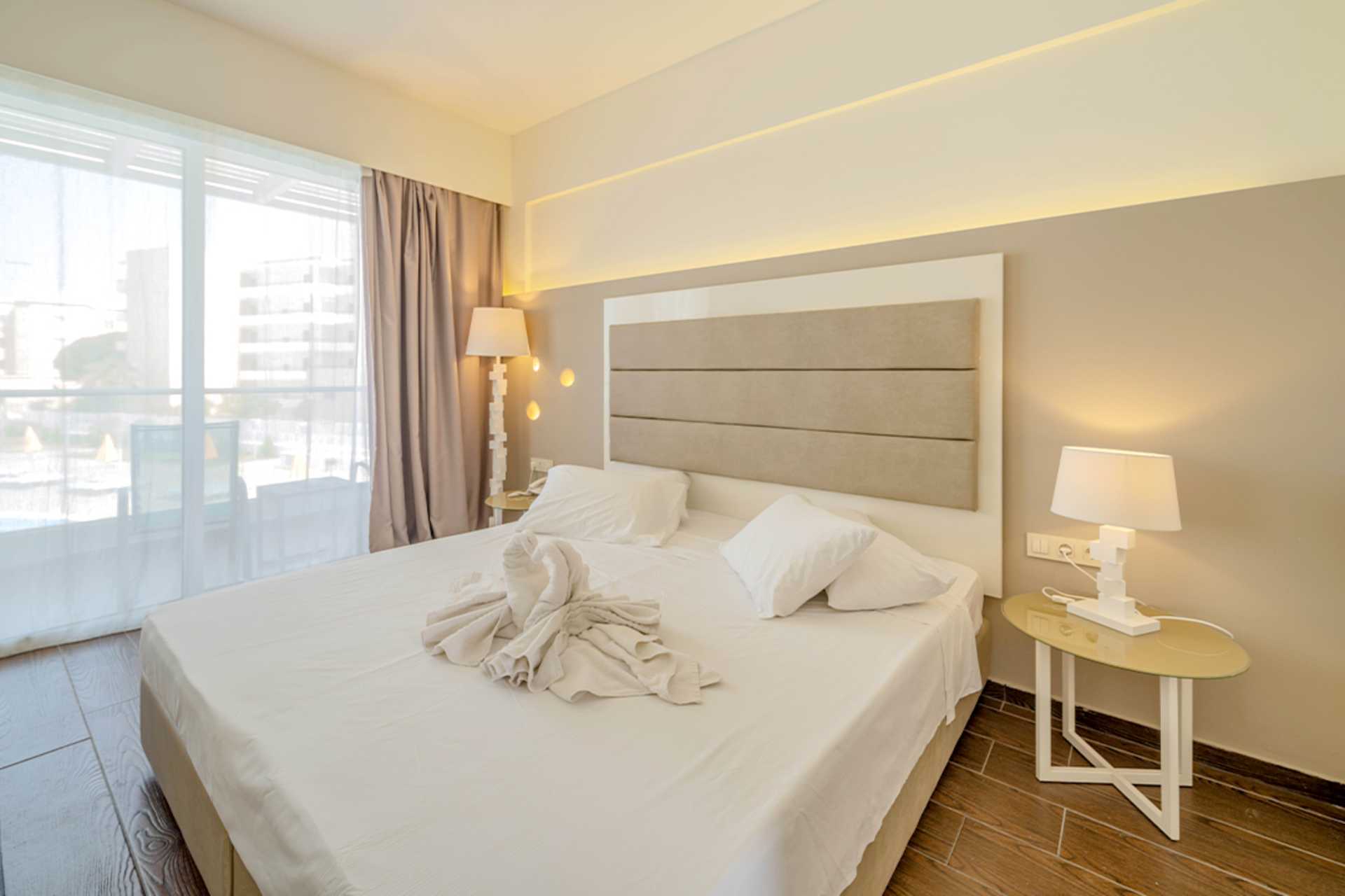 Perhehuone parvekkeella, osassa merinäköala ja osassa näkymä uima-altaalle. Makuuhuone, jossa on parivuode tai kaksi erillistä sänkyä. Parvekkeella, sekä parvekkeella ja merinäköalalla varustetuissa huoneissa (noin 45 neliömetriä) on olohuone, johon on mahdollista saada lisävuode vuodesohvaan. Näkymällä uima-altaalle varustetut huoneet (36 neliömetriä) on kaksi vuodesohvaa makuutilassa, joka voidaan erottaa makuuhuoneesta liukuovilla. Huoneisiin allasnäkymällä pääsee pienen tien yli. Maksuton wifi, ilmastointi ja tallelokero. Ilmastointi on käytettävissä 1. kesäkuuta - 30. syyskuuta. Jääkaappi. Tv kansainvälisillä kanavilla. Hiustenkuivain. Kylpyamme tai suihku ja wc. Siivous 7 krt/viikko.