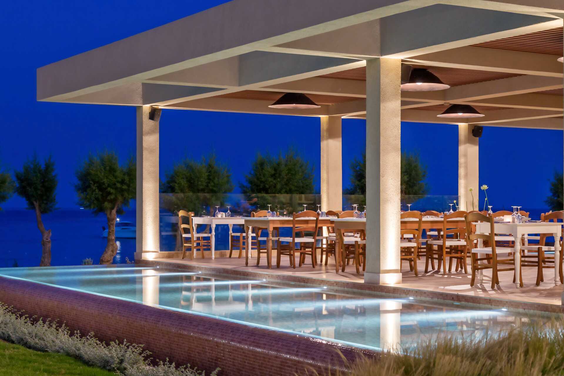 Hotellilla on buffetravintola, jossa tarjoillaan aamiaista, lounasta ja illallista. Buffetravintolassa on erillinen osio yli 18-vuotiaille aikuisille. Hotellissa on kreikkalainen, italialainen ja aasialainen à la carte-ravintola. Siisti pukeutuminen vaaditaan, miehillä pitkät housut ja pöytävaraus tulee tehdä. Ravintoloiden lisäksi hotellilla on kaksi baaria, joista toinen toivottaa tervetulleiksi vain aikuiset klo 21.00 jälkeen.