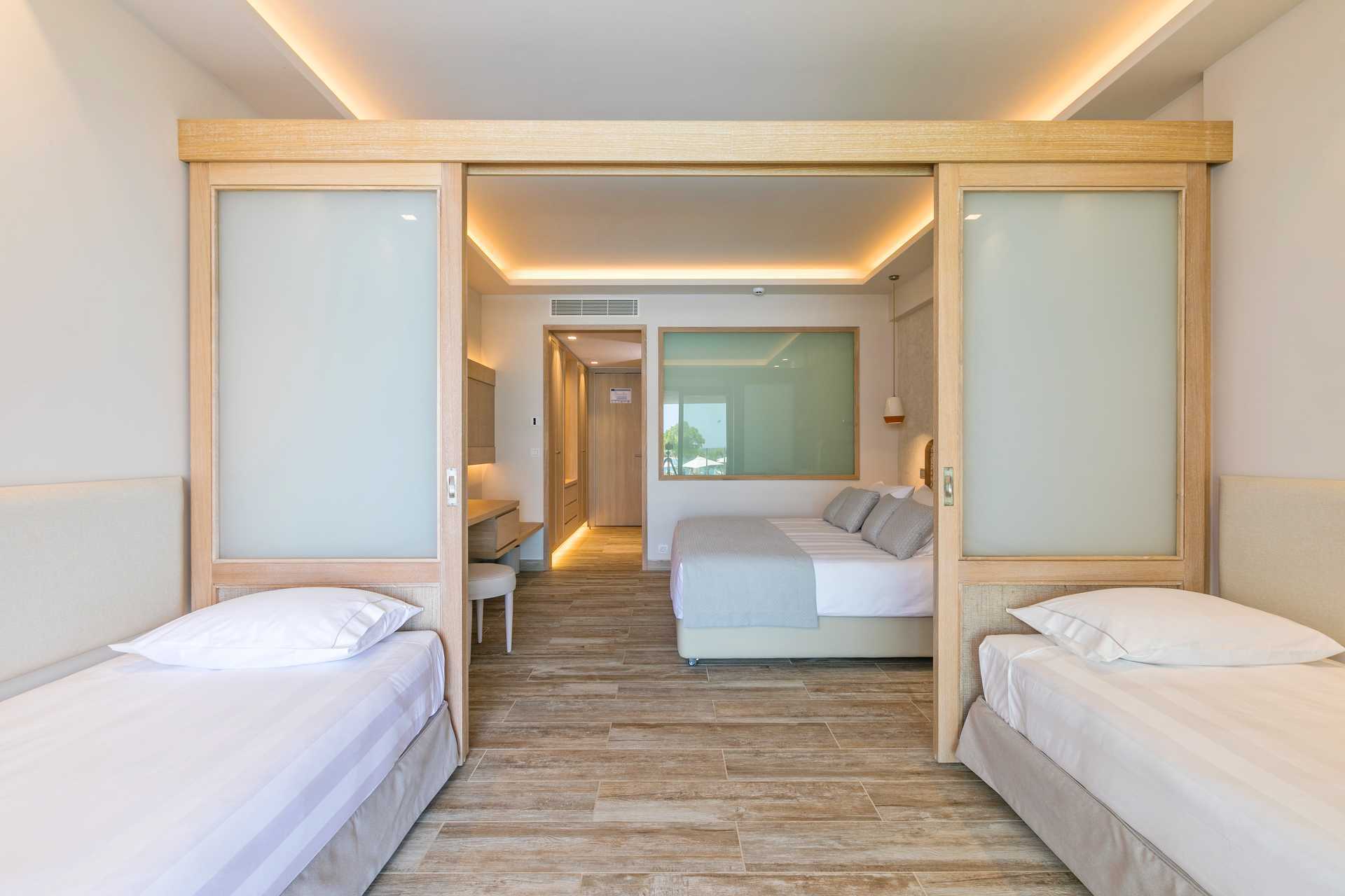 Perhehuone parvekkeella tai terassilla. Perhehuone koostuu makuuhuoneesta ja olohuoneesta, jonka välissä on liukuovi. Parivuode. Lisävuodemahdollisuus tavallisessa sängyssä. Maksuton wifi, ilmastointi ja tallelokero. Jääkaappi. Vedenkeitin, kahvia ja teetä. Tv kansainvälisillä kanavilla. Kylpytakit ja tossut. Hiustenkuivain. Suihku ja wc. Siivous 7 krt/viikko.
