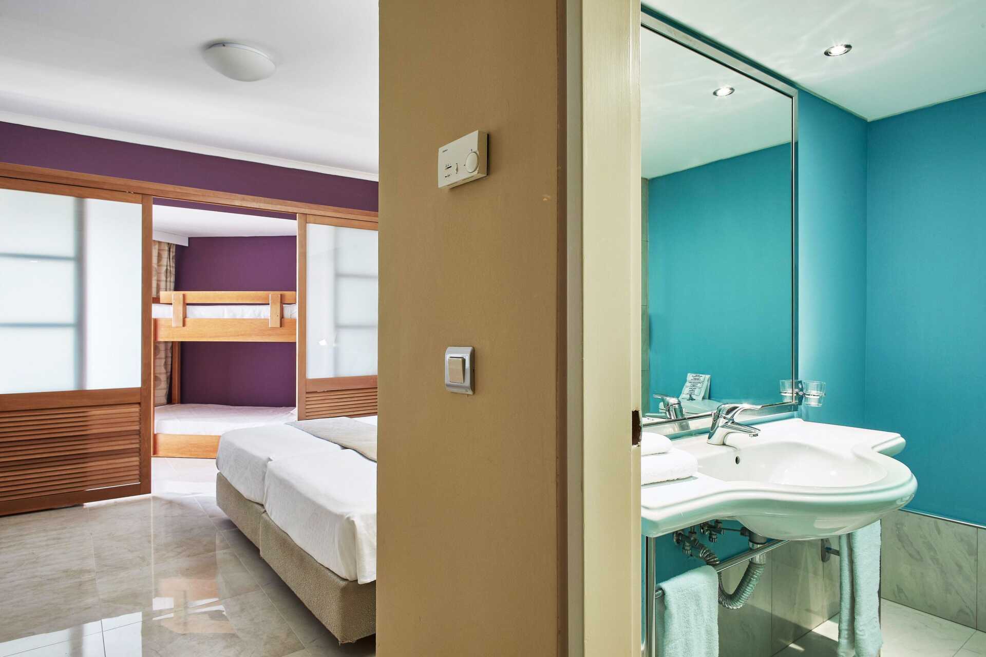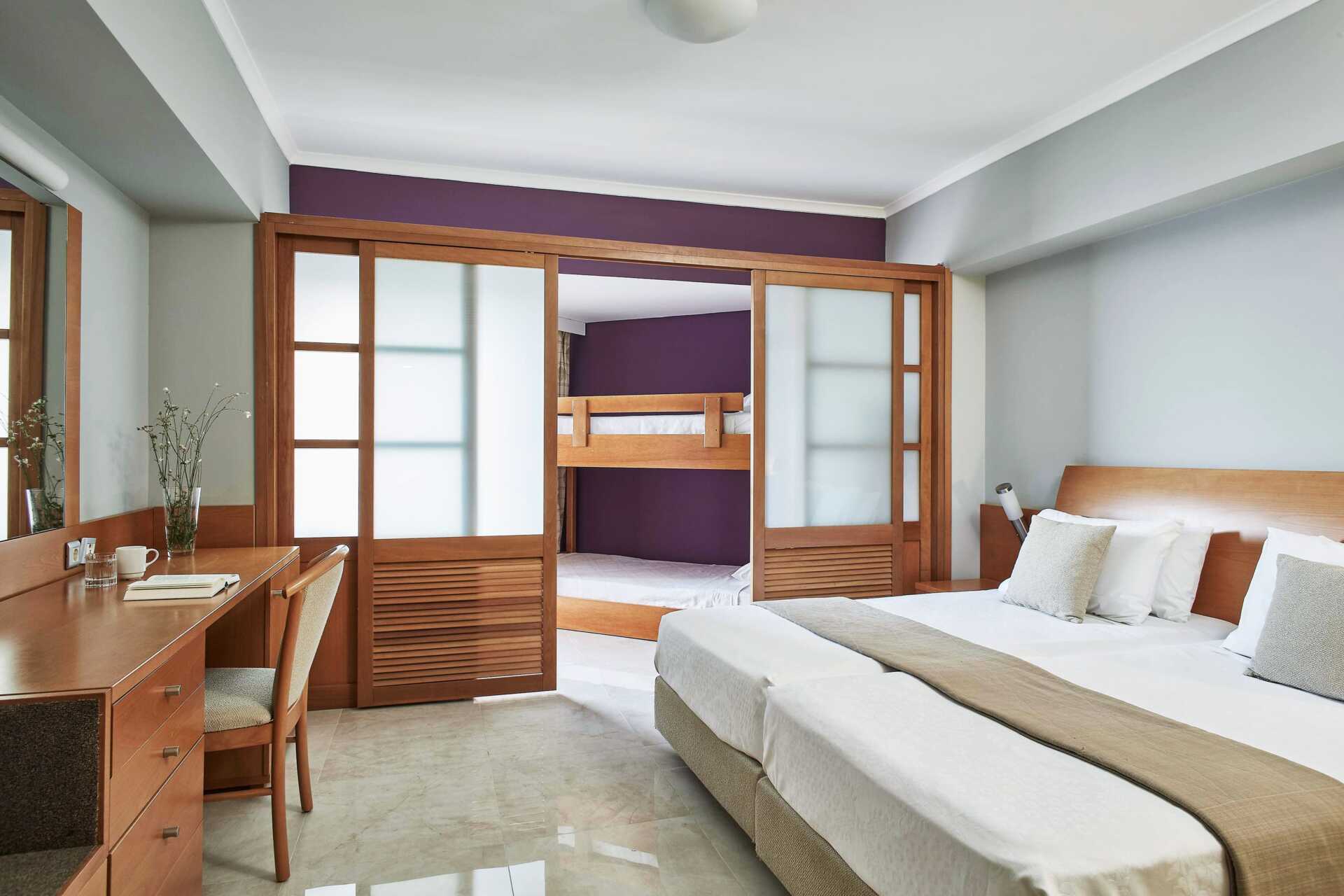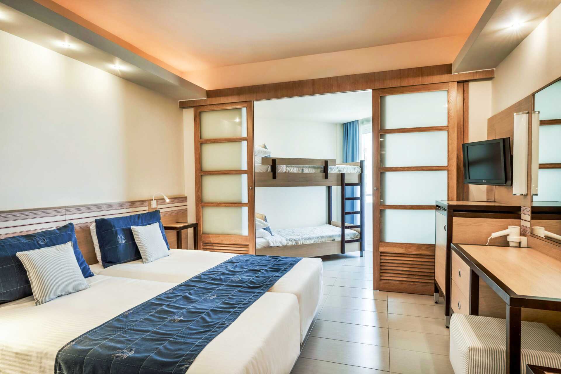 Perhehuoneita parvekkeella tai terassilla. Perhehuoneet sijaitsevat hotellin sivurakennuksessa. Yhdessä makuuhuoneessa on parivuode ja toisessa makuuhuoneessa kaksi erillistä vuodetta. Lisävuodemahdollisuus vuodesohvasta. Maksuton keskusilmastointi (mahdollinen 1.6.-30.9.), wifi ja tallelokero. Jääkaappi. Saapuessaan jääkaapissa vesipulloja, virvoitusjuomia ja olutta, jotka sisältyvät hintaan. Tv kansainvälisillä kanavilla. Kaksi kylpyhuonetta, jossa kylpyamme tai suihku ja wc. Siivous 7 krt/viikko. Alle 2-vuotiaat lapset lasketaan lisävuoteella majoittuviksi henkilöiksi.