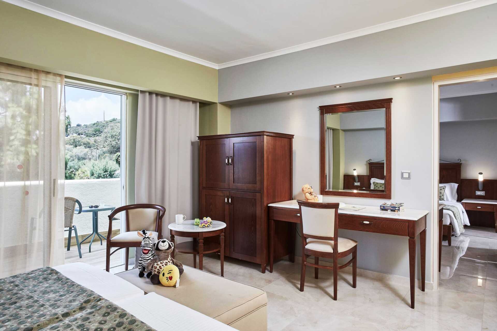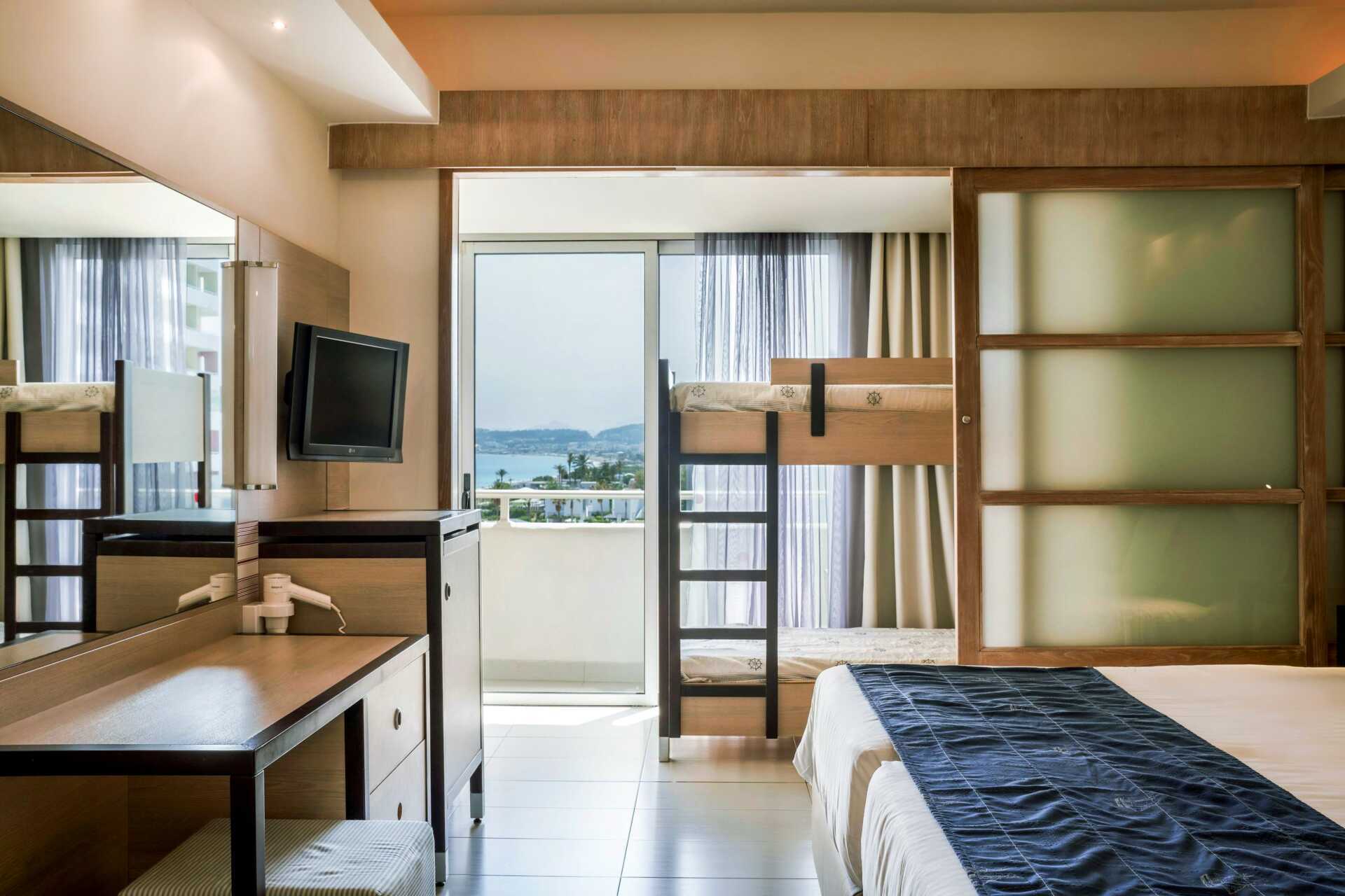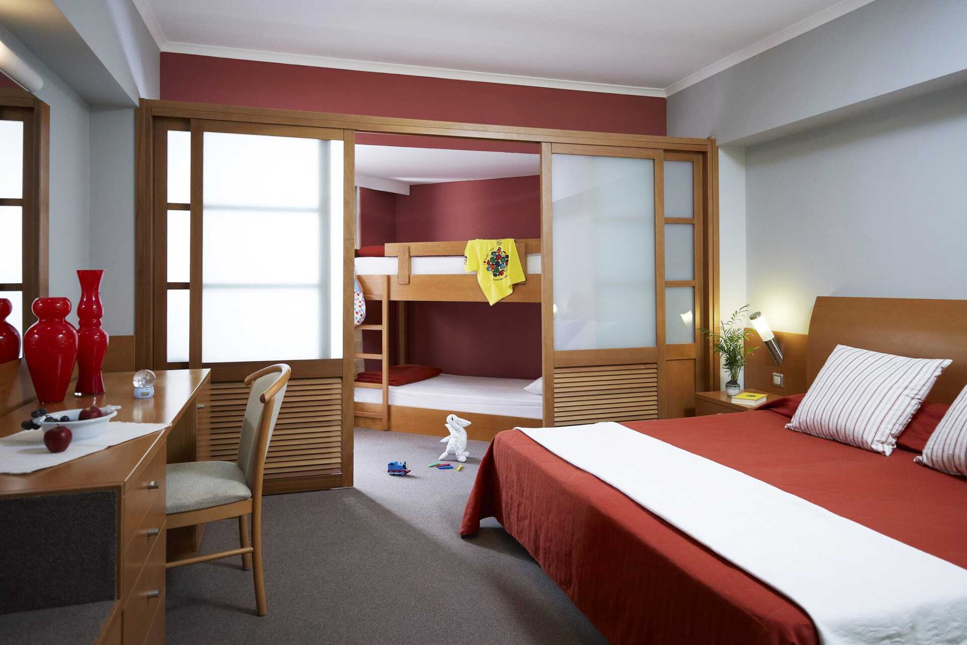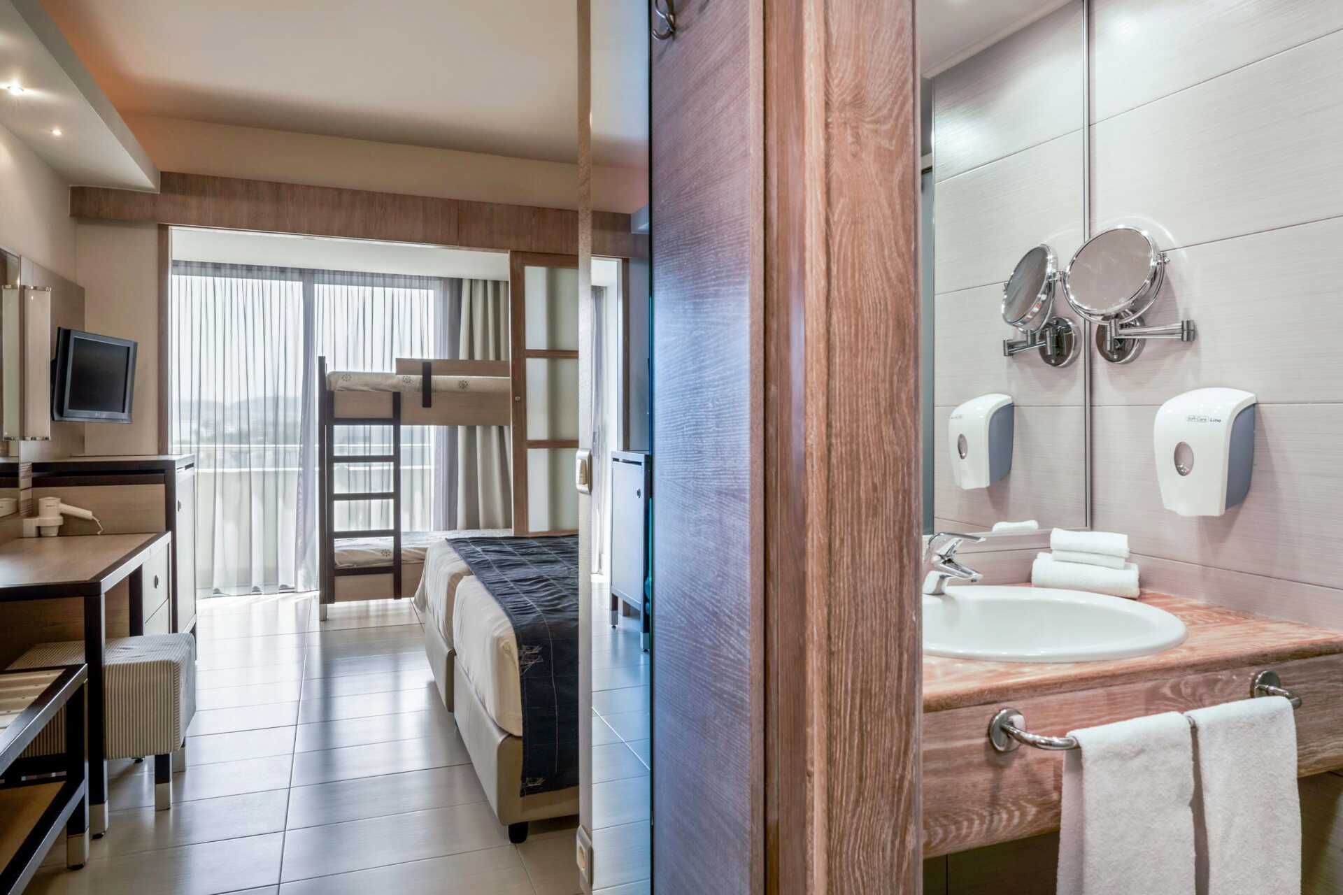 Perhehuoneita parvekkeella tai terassilla. Perhehuoneet sijaitsevat hotellin sivurakennuksessa. Yhdessä makuuhuoneessa on parivuode ja toisessa makuuhuoneessa kaksi erillistä vuodetta. Lisävuodemahdollisuus vuodesohvasta. Maksuton keskusilmastointi (mahdollinen 1.6.-30.9.), wifi ja tallelokero. Jääkaappi. Saapuessaan jääkaapissa vesipulloja, virvoitusjuomia ja olutta, jotka sisältyvät hintaan. Tv kansainvälisillä kanavilla. Kaksi kylpyhuonetta, jossa kylpyamme tai suihku ja wc. Siivous 7 krt/viikko. Alle 2-vuotiaat lapset lasketaan lisävuoteella majoittuviksi henkilöiksi.