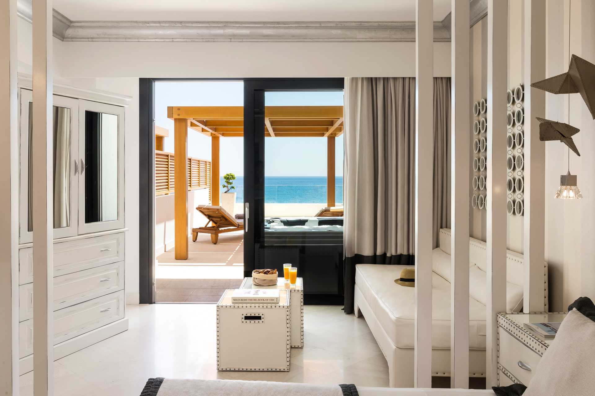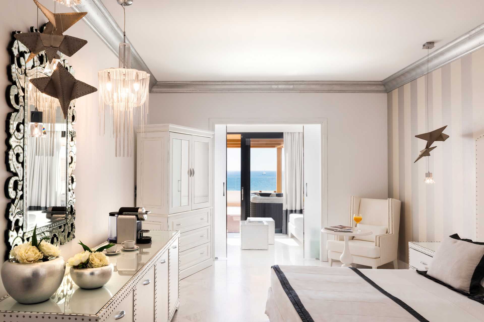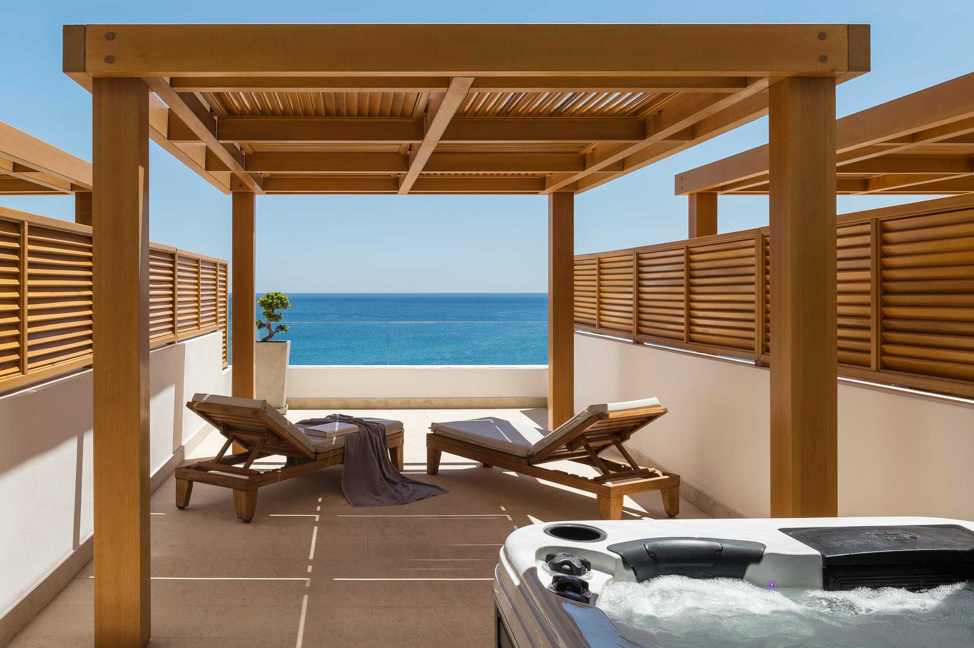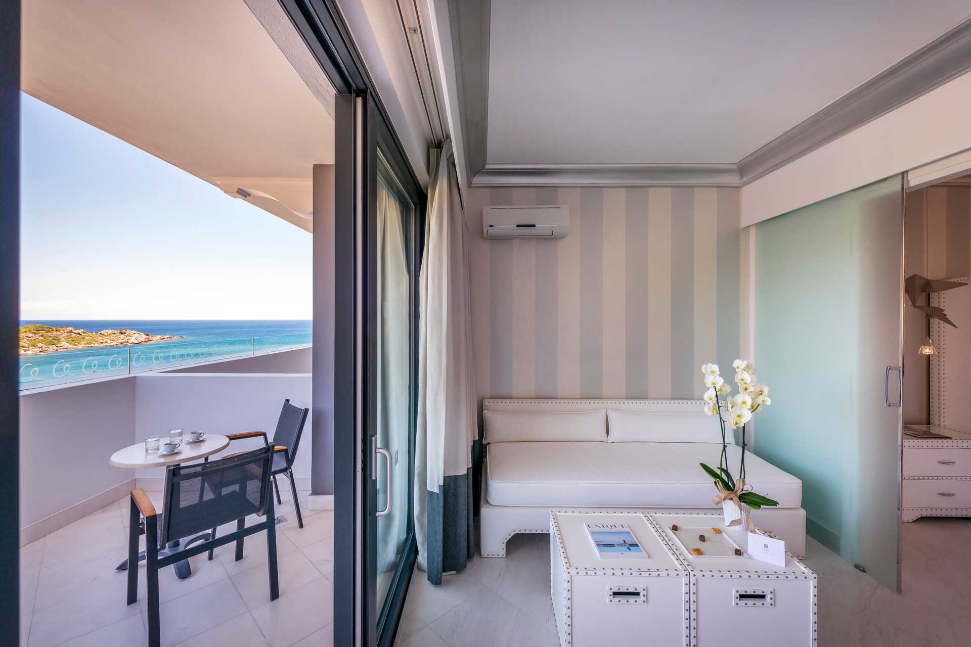 Juniorsviitti parvekkeella ja merinäköalalla. Juniorsviitit sijaitsevat päärakennuksen ensimmäisessä kerroksessa. Parvekkeella on lämmitetty poreallas ja aurinkotuolit. Juniorsviitit koostuvat rakenteeltaan avoimesta makuuhuoneesta ja olohuoneesta. Yksi parivuode tai kaksi erillistä vuodetta. Maksuton wifi, ilmastointi ja tallelokero. Minibaari sisältyy hintaan - täytetään päivittäin. Vedenkeitin, kahvia ja teetä. Nespresso-kahvinkeitin - kapselit mukana ja täytetään päivittäin. Tv kansainvälisillä kanavilla. Kylpytakit ja tossut. Hiustenkuivain. Kylpyhuoneessa amme ja wc. Siivous 7 krt/viikko. Alle 2-vuotiaat lapset lasketaan lisävuoteella majoittuviksi henkilöiksi.