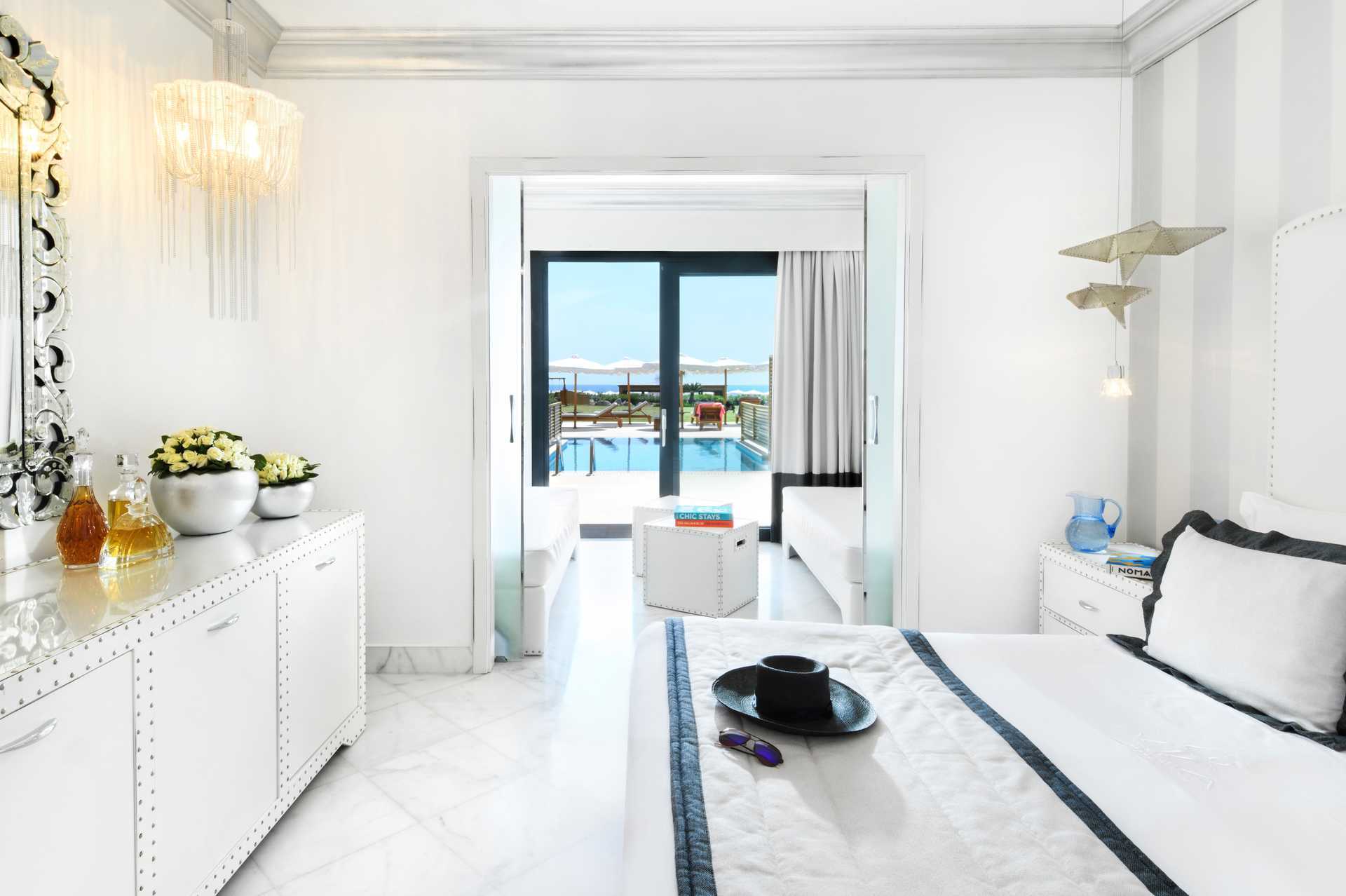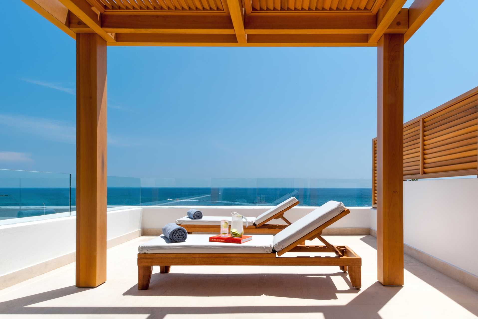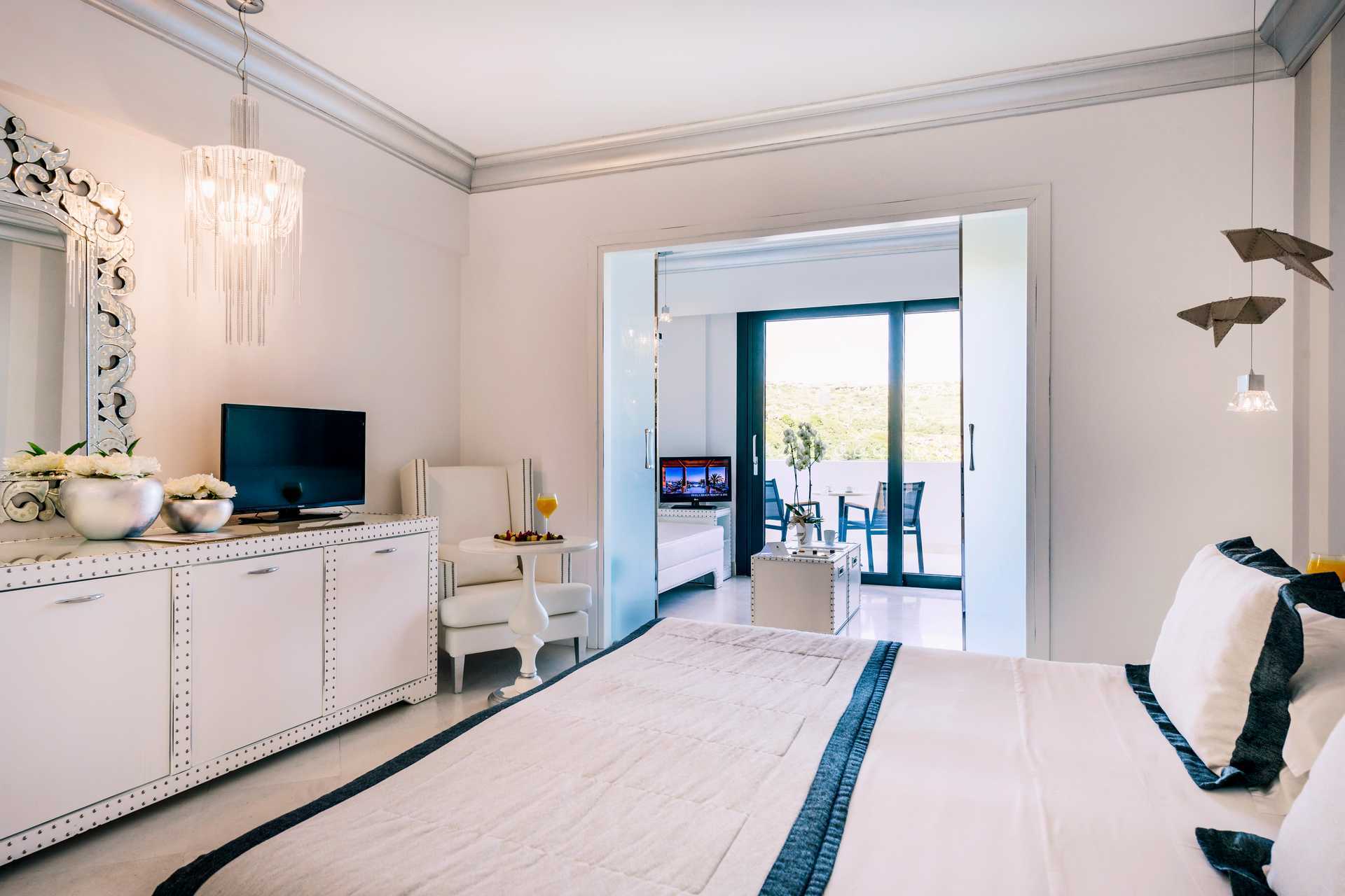 Juniorsviitti parvekkeella ja merinäköalalla. Juniorsviitit sijaitsevat päärakennuksen ensimmäisessä kerroksessa. Parvekkeella on lämmitetty poreallas ja aurinkotuolit. Juniorsviitit koostuvat rakenteeltaan avoimesta makuuhuoneesta ja olohuoneesta. Yksi parivuode tai kaksi erillistä vuodetta. Maksuton wifi, ilmastointi ja tallelokero. Minibaari sisältyy hintaan - täytetään päivittäin. Vedenkeitin, kahvia ja teetä. Nespresso-kahvinkeitin - kapselit mukana ja täytetään päivittäin. Tv kansainvälisillä kanavilla. Kylpytakit ja tossut. Hiustenkuivain. Kylpyhuoneessa amme ja wc. Siivous 7 krt/viikko. Alle 2-vuotiaat lapset lasketaan lisävuoteella majoittuviksi henkilöiksi.