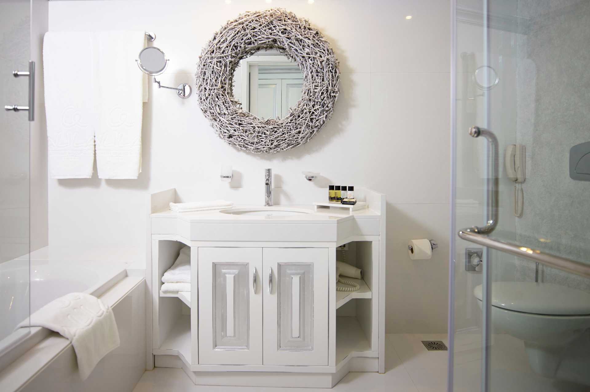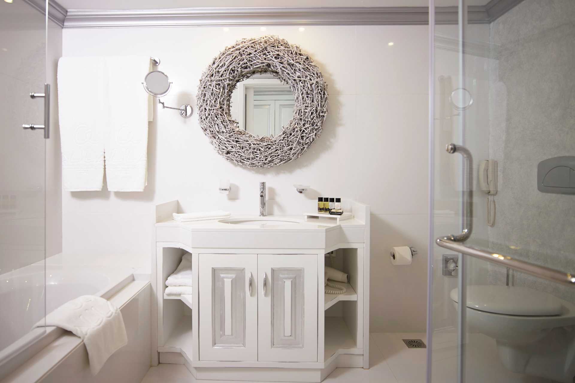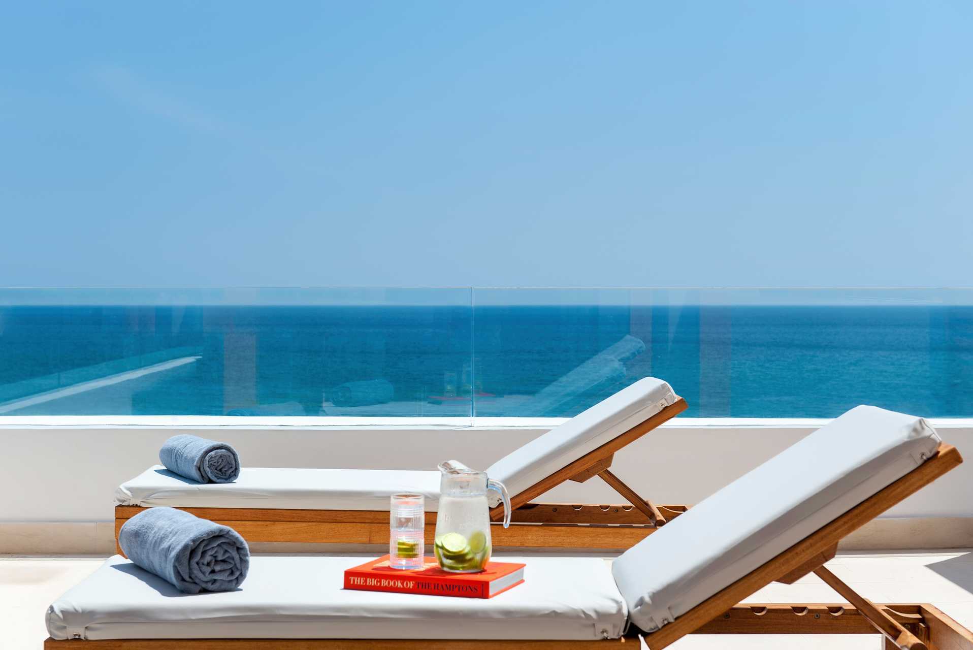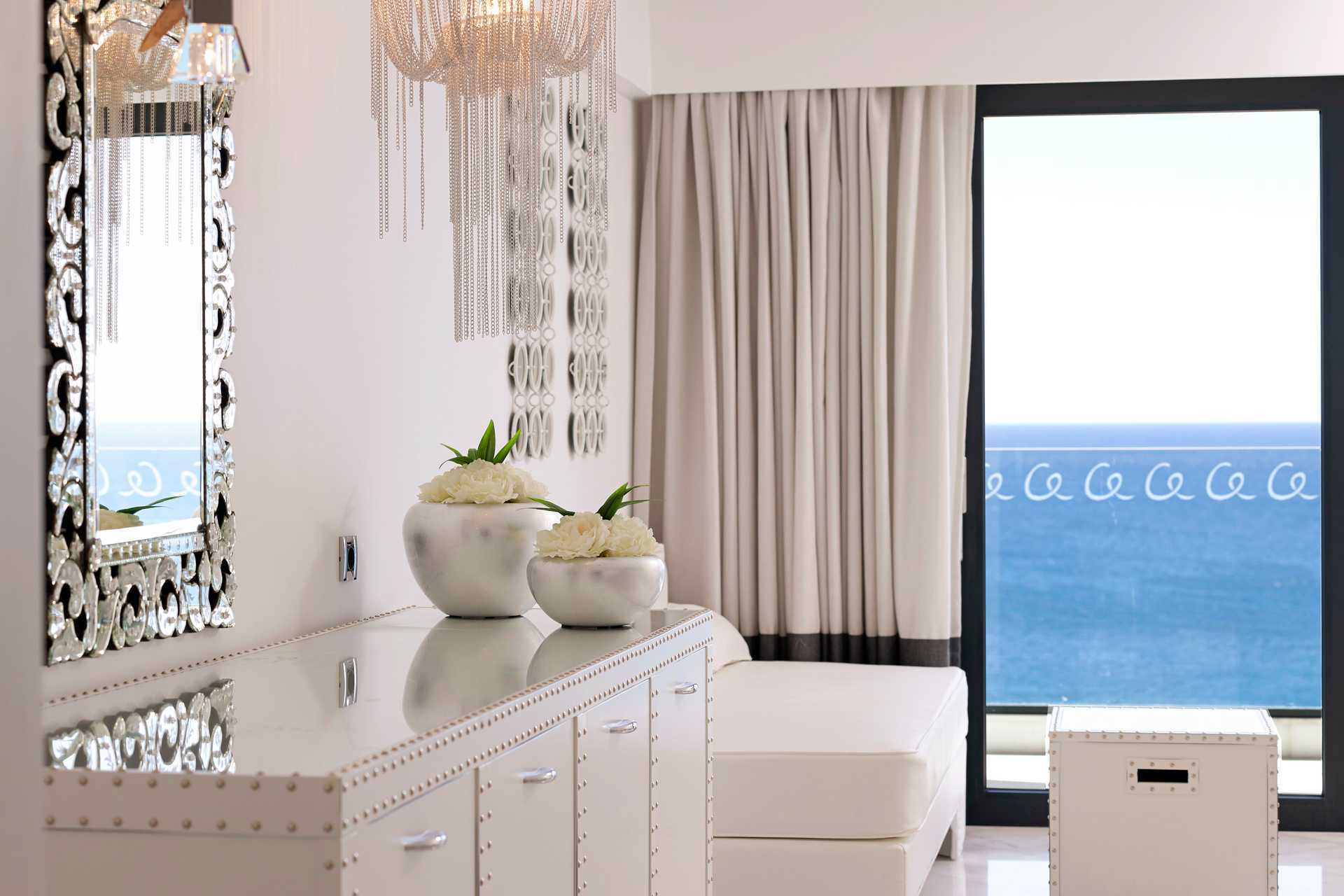 Juniorsviitti parvekkeella ja merinäköalalla. Juniorsviitit sijaitsevat päärakennuksen ensimmäisessä kerroksessa. Parvekkeella on lämmitetty poreallas ja aurinkotuolit. Juniorsviitit koostuvat rakenteeltaan avoimesta makuuhuoneesta ja olohuoneesta. Yksi parivuode tai kaksi erillistä vuodetta. Maksuton wifi, ilmastointi ja tallelokero. Minibaari sisältyy hintaan - täytetään päivittäin. Vedenkeitin, kahvia ja teetä. Nespresso-kahvinkeitin - kapselit mukana ja täytetään päivittäin. Tv kansainvälisillä kanavilla. Kylpytakit ja tossut. Hiustenkuivain. Kylpyhuoneessa amme ja wc. Siivous 7 krt/viikko. Alle 2-vuotiaat lapset lasketaan lisävuoteella majoittuviksi henkilöiksi.