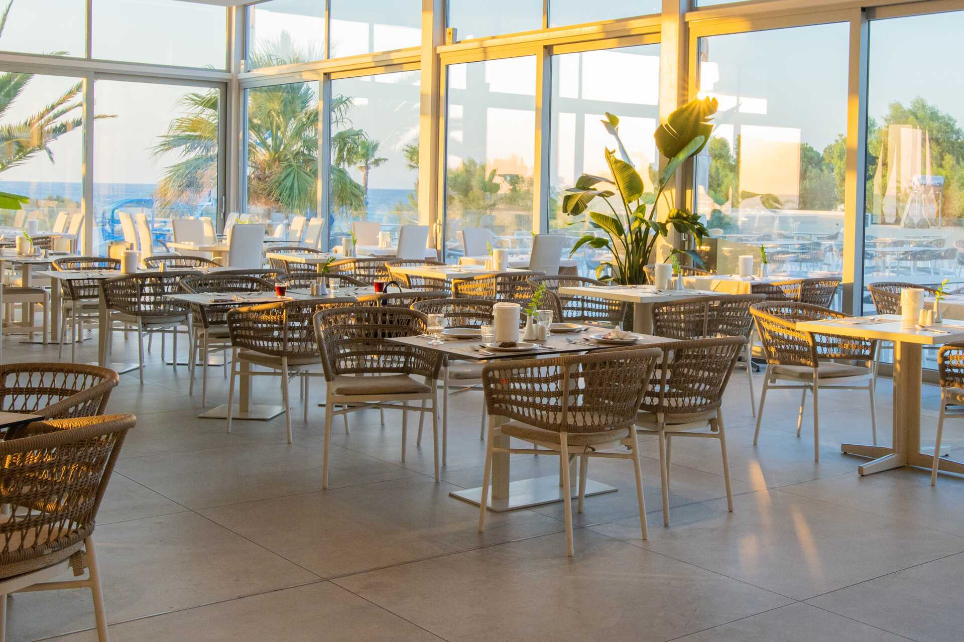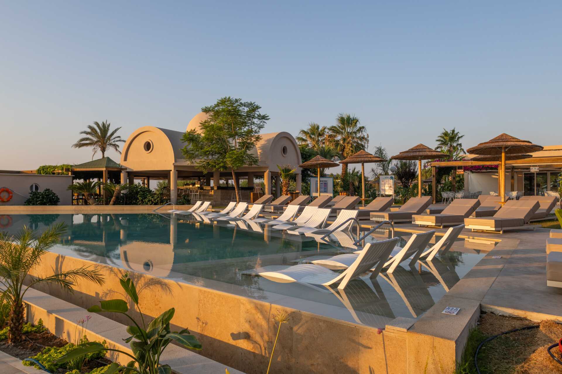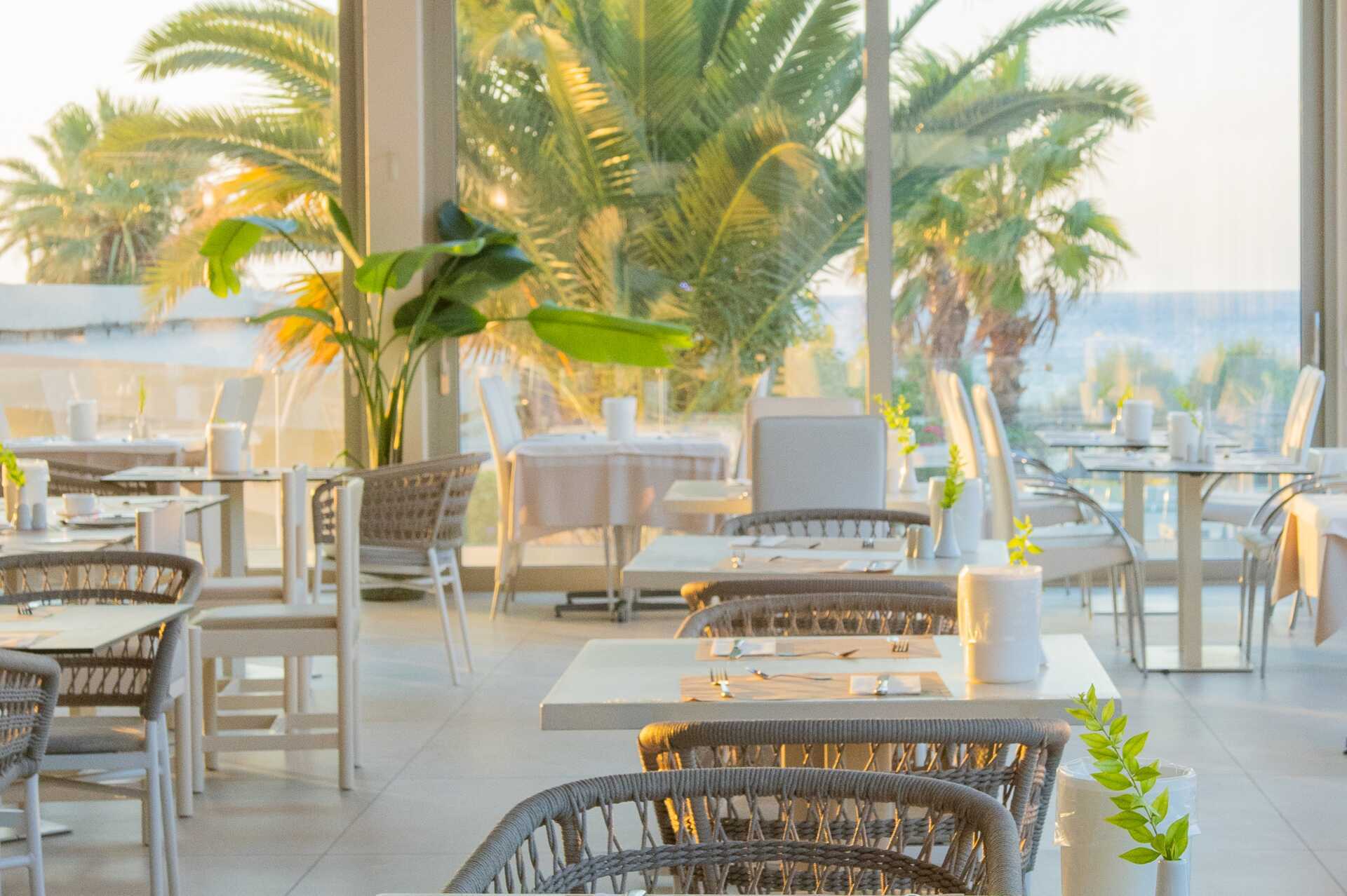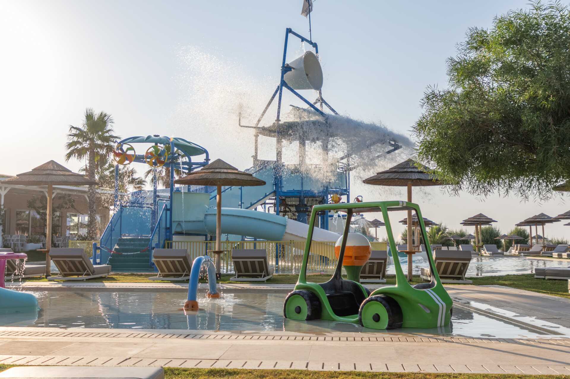 Allasalue, jossa kaksi allasta, erillinen lastenallas ja hauska vesileikkipuisto pienimmille. Aurinkotuolit ja -varjot uima-altailla ja hotellin alapuolella olevalla rannalla. Allasbaari. Buffetravintola Amrosiassa tarjoillaan aamupala, lounas ja illallinen. À la carte -ravintola Elia tarjoilee illallisen kreikkalaisilla mauilla. Näiden lisäksi tarjolla on myös Formaio Pizzaria, Meet the Greek gyros grill ja Choco Crêperie, jotka tarjoilevat erikoisuuksiaan lounaasta iltapäivään. Illallisella on pukeutumiskoodi: miehiltä edellytetään pitkiä housuja ja pitkähihaista yläosaa. Ei varvassandaaleja tai uima-asuja.