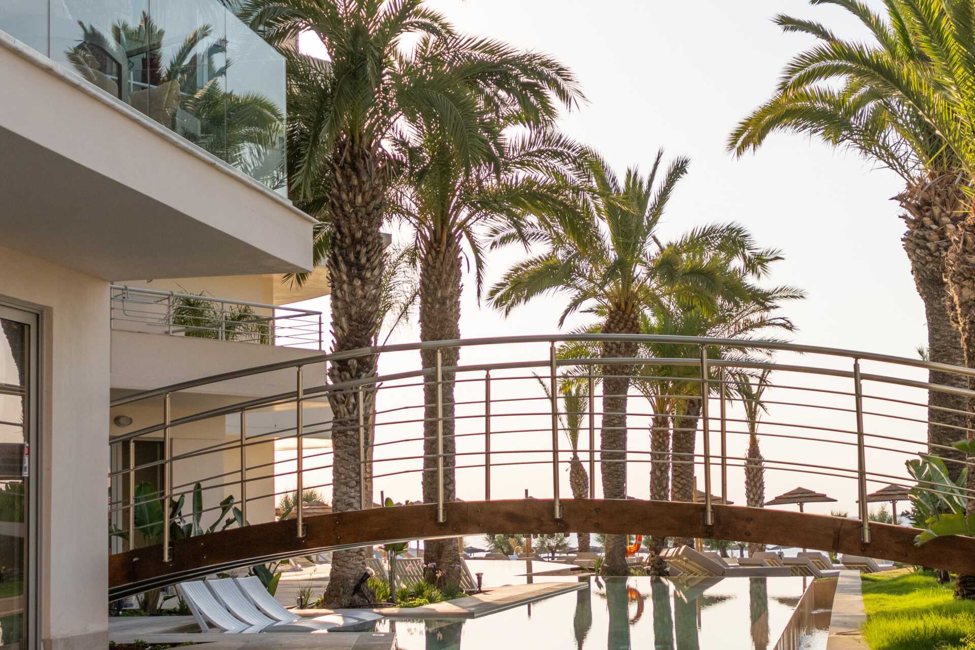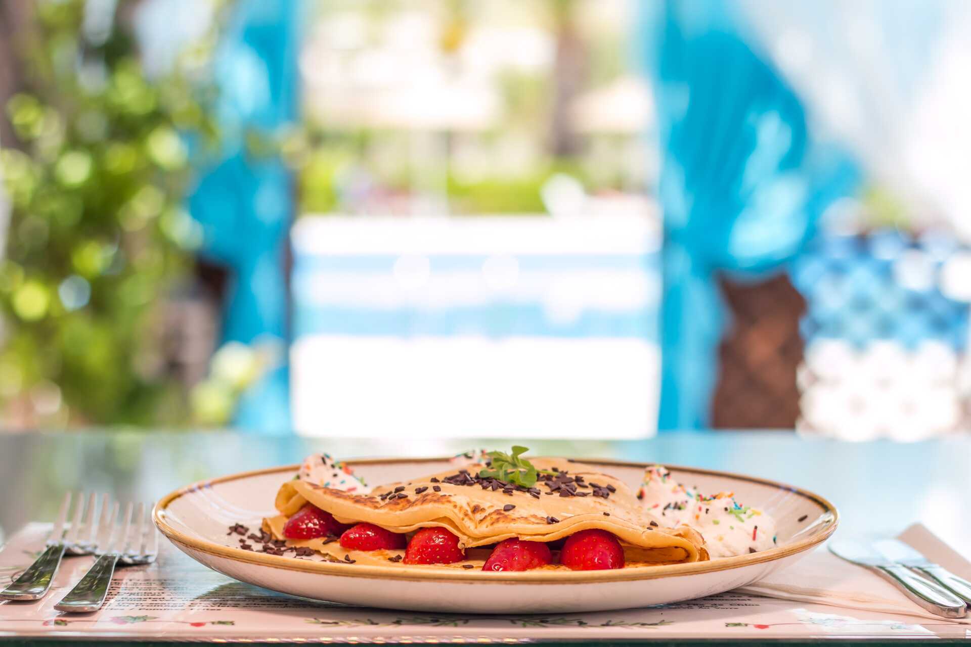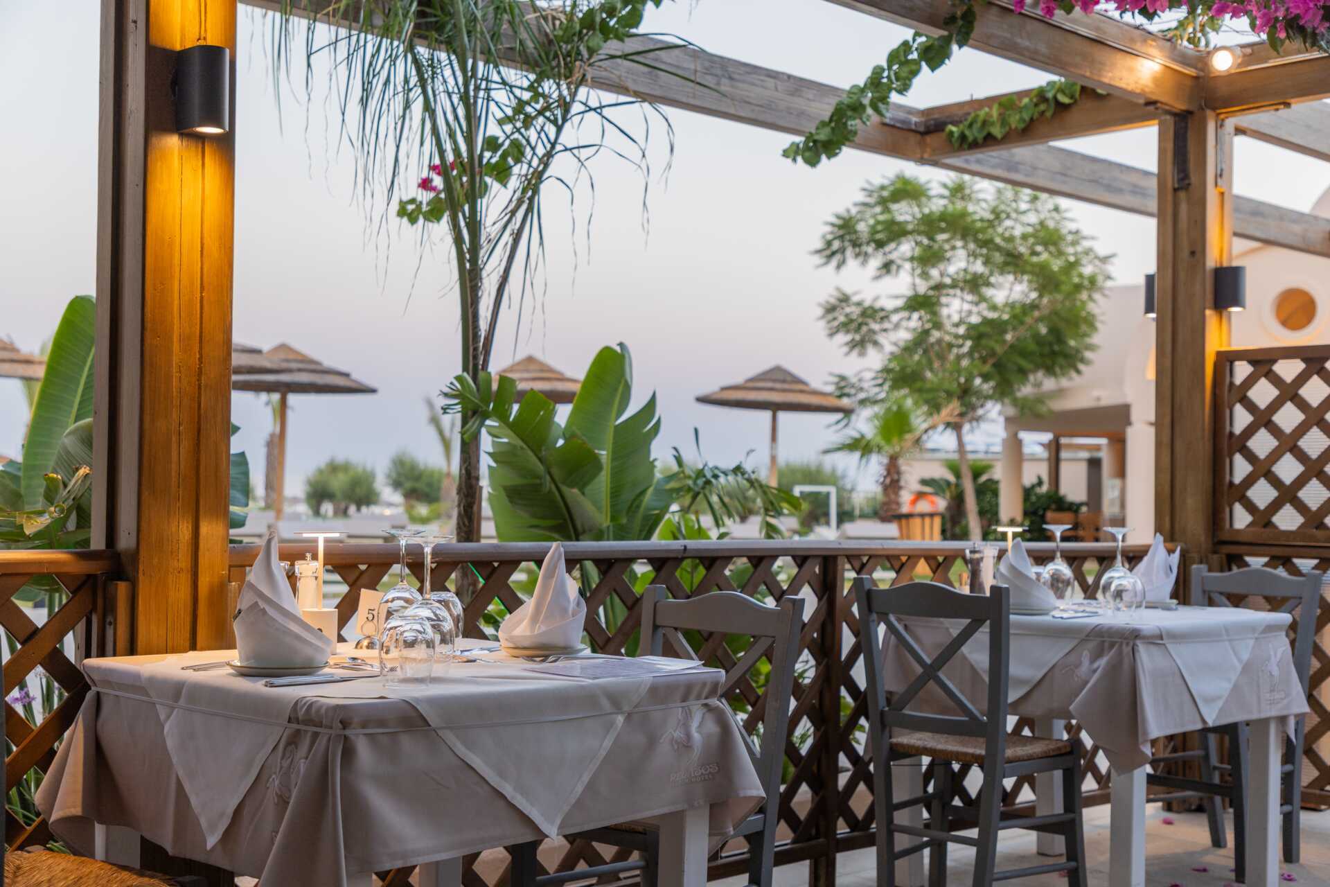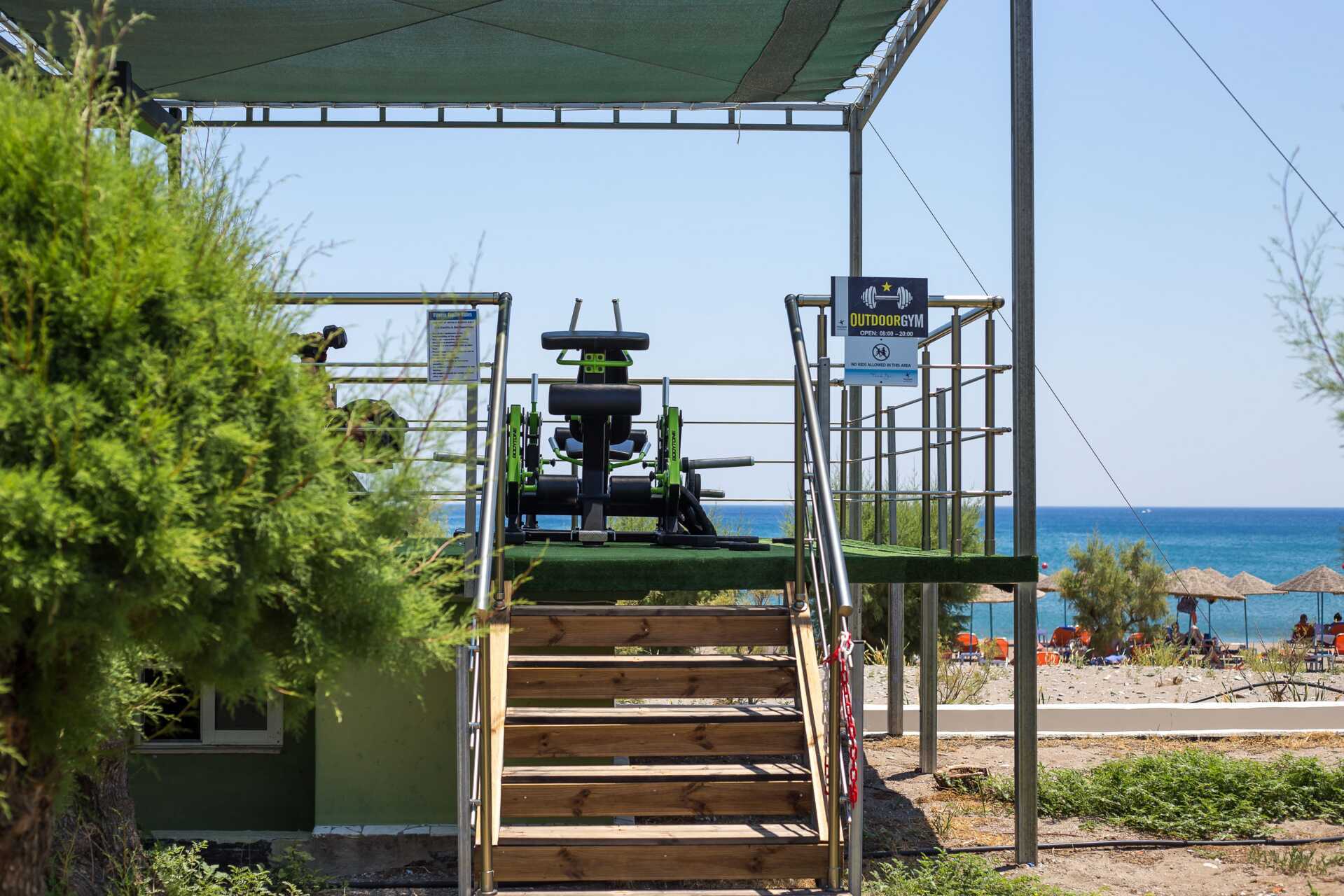 Allasalue, jossa kaksi allasta, erillinen lastenallas ja hauska vesileikkipuisto pienimmille. Aurinkotuolit ja -varjot uima-altailla ja hotellin alapuolella olevalla rannalla. Allasbaari. Buffetravintola Amrosiassa tarjoillaan aamupala, lounas ja illallinen. À la carte -ravintola Elia tarjoilee illallisen kreikkalaisilla mauilla. Näiden lisäksi tarjolla on myös Formaio Pizzaria, Meet the Greek gyros grill ja Choco Crêperie, jotka tarjoilevat erikoisuuksiaan lounaasta iltapäivään. Illallisella on pukeutumiskoodi: miehiltä edellytetään pitkiä housuja ja pitkähihaista yläosaa. Ei varvassandaaleja tai uima-asuja.