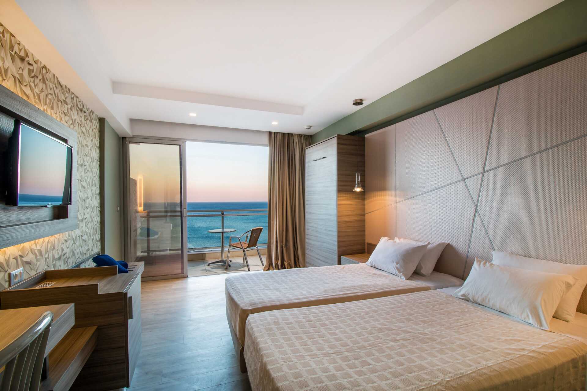 Perhehuone parvekkeella ja merinäköalalla. Perhehuoneissa on kaksi makuuhuonetta, joista toisessa on parivuode ja toisessa kaksi erillistä vuodetta. Maksuton wifi, ilmastointi ja tallelokero. Jääkaappi. Vedenkeitin, kahvia ja teetä. Nespresso-keitin. Tv kansainvälisillä kanavilla. Kylpytakit ja tossut. Hiustenkuivain. Suihku ja wc. Siivous 7 krt/viikko.