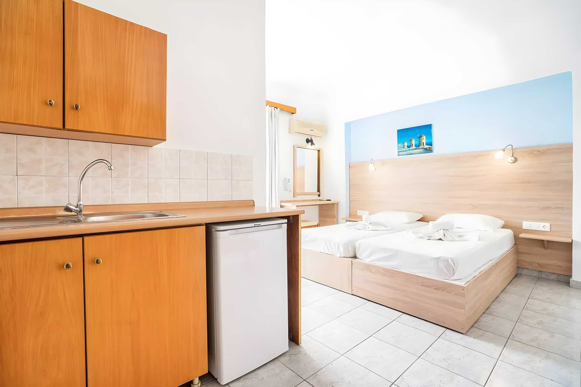 Kahden hengen huone parvekkeella. Parivuode tai kaksi yhden hengen sänkyä. Maksuton wifi. Ilmastointi lisämaksusta. Jääkaappi. Vedenkeitin. Tv. Hiustenkuivain. Kylpyamme tai suihku ja wc. Siivous 3 krt/viikko.