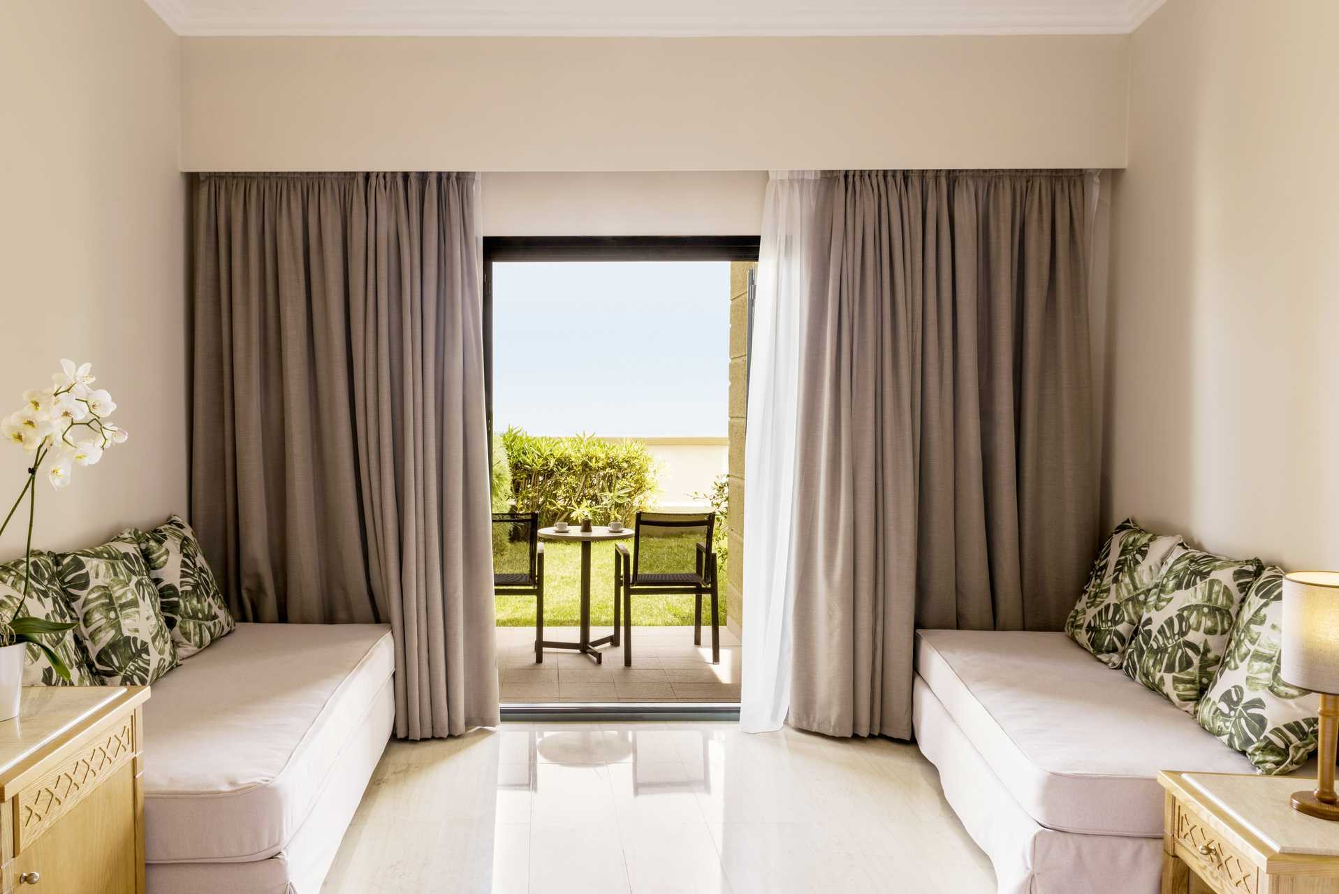 Perhehuone jaettu ulkotila. Perhehuoneet koostuvat makuuhuoneesta ja olohuoneesta, jotka on erotettu toisistaan lasiseinällä ja ovella. Kaksi yhden hengen sänkyä. Lisävuodemahdollisuus kahteen vuodesohvaan. Huoneet voivat sijaita päärakennuksessa tai bungaloweissa. Maksuton wifi, ilmastointi ja tallelokero. Minibaari, jossa vettä, virvoitusjuomia ja olutta sisältyvät - täytetään joka toinen päivä. Vedenkeitin, kahvia ja teetä. Tv kansainvälisillä kanavilla. Kylpytakit ja tossut. Hiustenkuivain. Kylpyamme tai suihku ja wc. Siivous 7 krt/viikko.