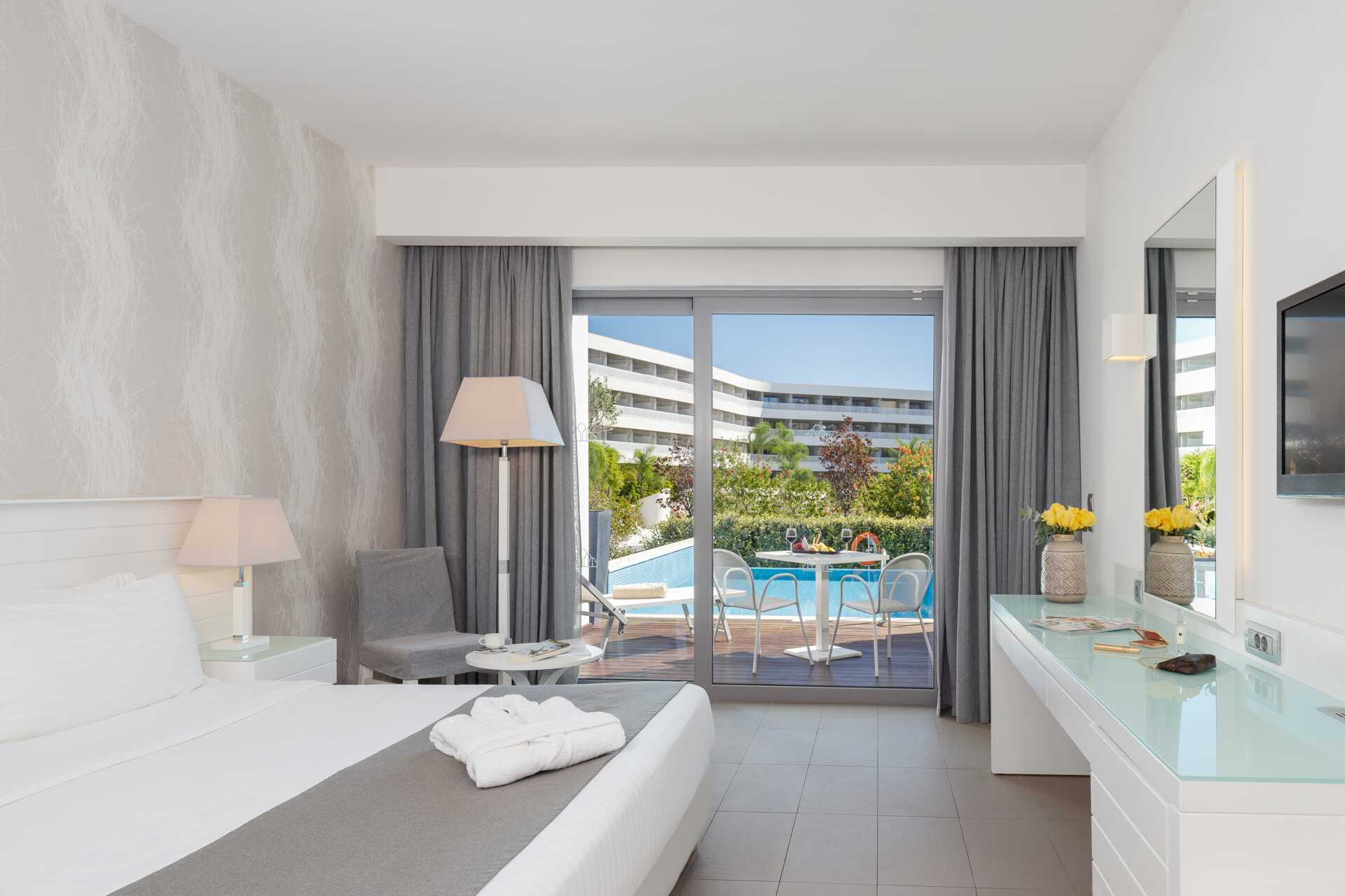 Junior-sviitti superior, jossa on oma uima-allas ja aurinkotuolit terassilla. Parivuode. Lisävuodemahdollisuus vuodesohvasta. Tyynymenu. Maksuton wifi, ilmastointi ja tallelokero. Minibaari sisältyy hintaan - täytetään joka toinen päivä virvoitusjuomilla, oluella ja vedellä. Vedenkeitin, kahvia ja teetä. Kaksi televisiota kansainvälisillä kanavilla. Kylpytakit ja tossut. Hiustenkuivain. Kylpyhuoneessa kaksi pesuallasta, kylpyamme ja wc. Siivous 7 krt/viikko. Alle 2-vuotiaat lapset lasketaan lisävuoteella majoittuviksi henkilöiksi.