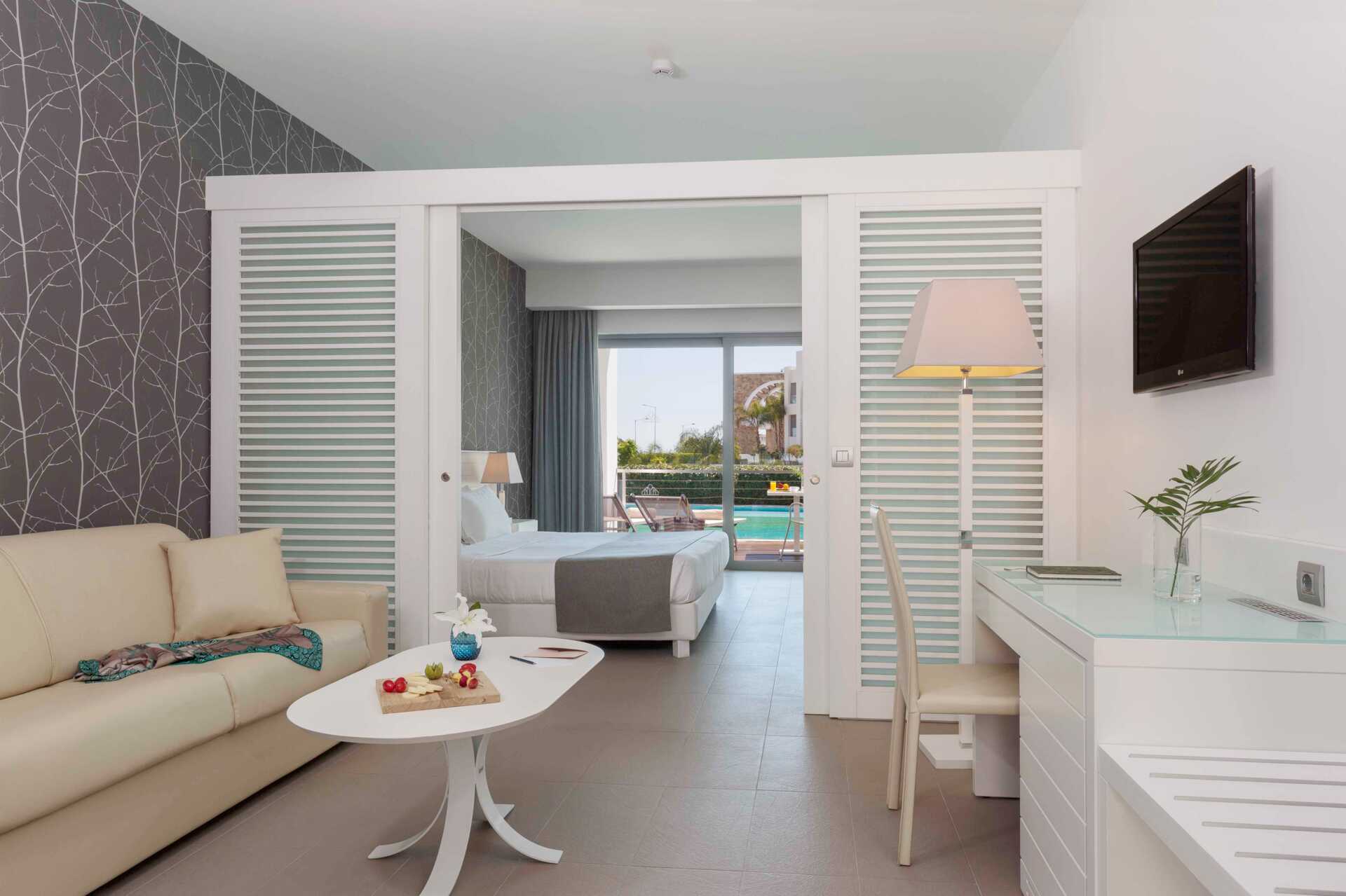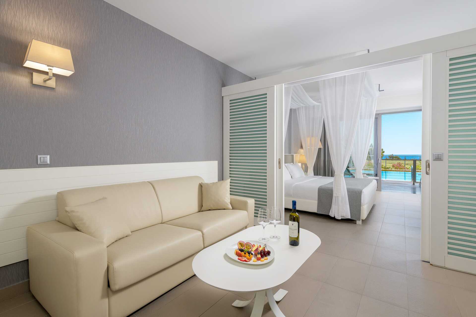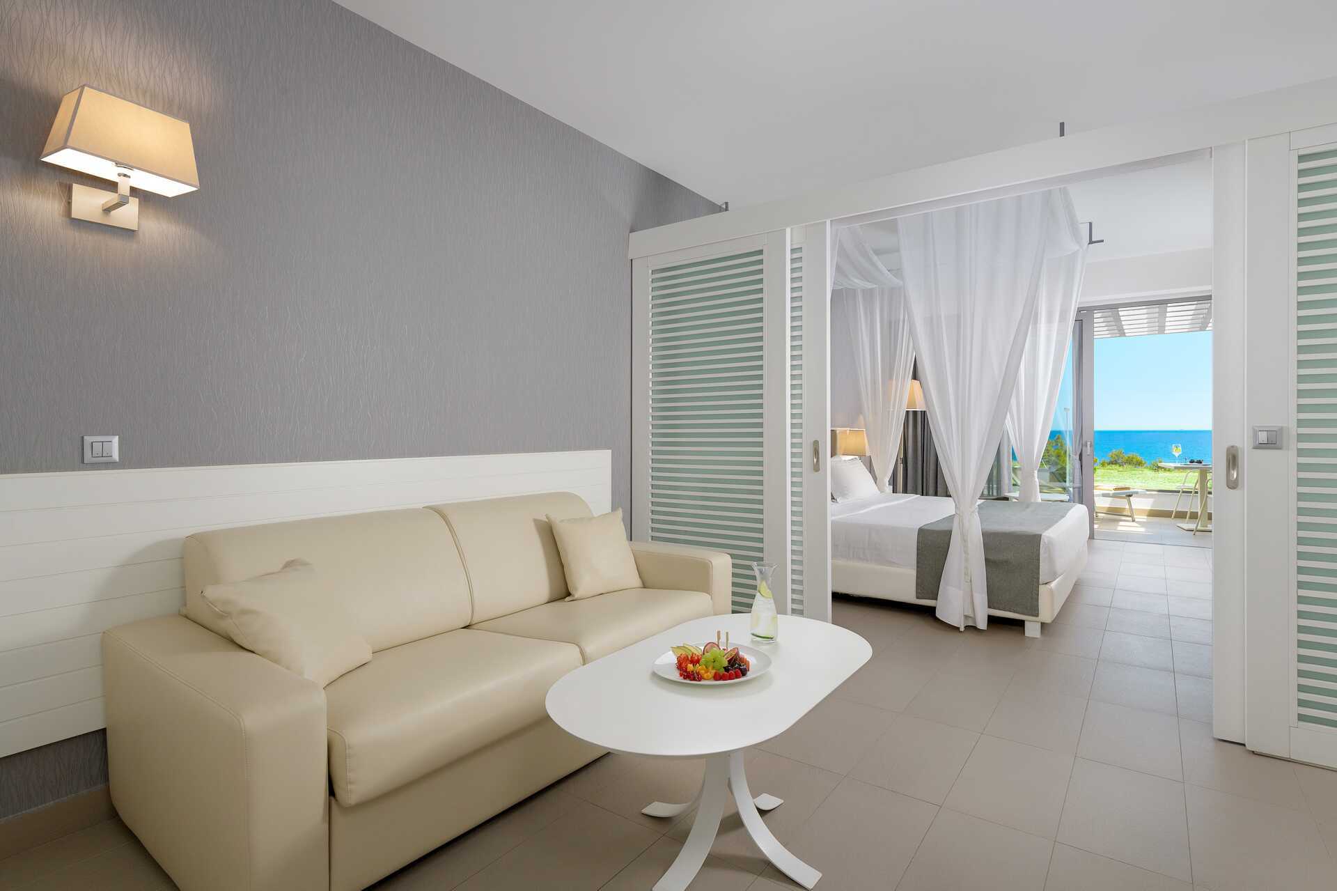 Junior-sviitti merinäköalalla, pääsy yhteiseen uima-altaaseen ja aurinkotuoleja terassilla. Juniorsviitti koostuu makuuhuoneesta ja olohuoneosasta, jotka voidaan erottaa lasiliukuovella - liukuovi ei kuitenkaan nouse kattoon asti. Parivuode tai kaksi yhden hengen sänkyä. Lisävuodemahdollisuus vuodesohvaan tai kahteen yhden hengen vuoteeseen. Tyynymenu. Maksuton wifi, ilmastointi ja tallelokero. Minibaari sisältyy hintaan - täytetään joka toinen päivä virvoitusjuomilla, oluella ja vedellä. Vedenkeitin, kahvia ja teetä. Jokaisessa huoneessa on televisio kansainvälisillä kanavilla. Kylpytakit ja tossut. Hiustenkuivain. Kylpyhuoneessa suihku ja wc. Siivous 7 krt/viikko. Alle 2-vuotiaat lapset lasketaan lisävuoteella majoittuviksi henkilöiksi.