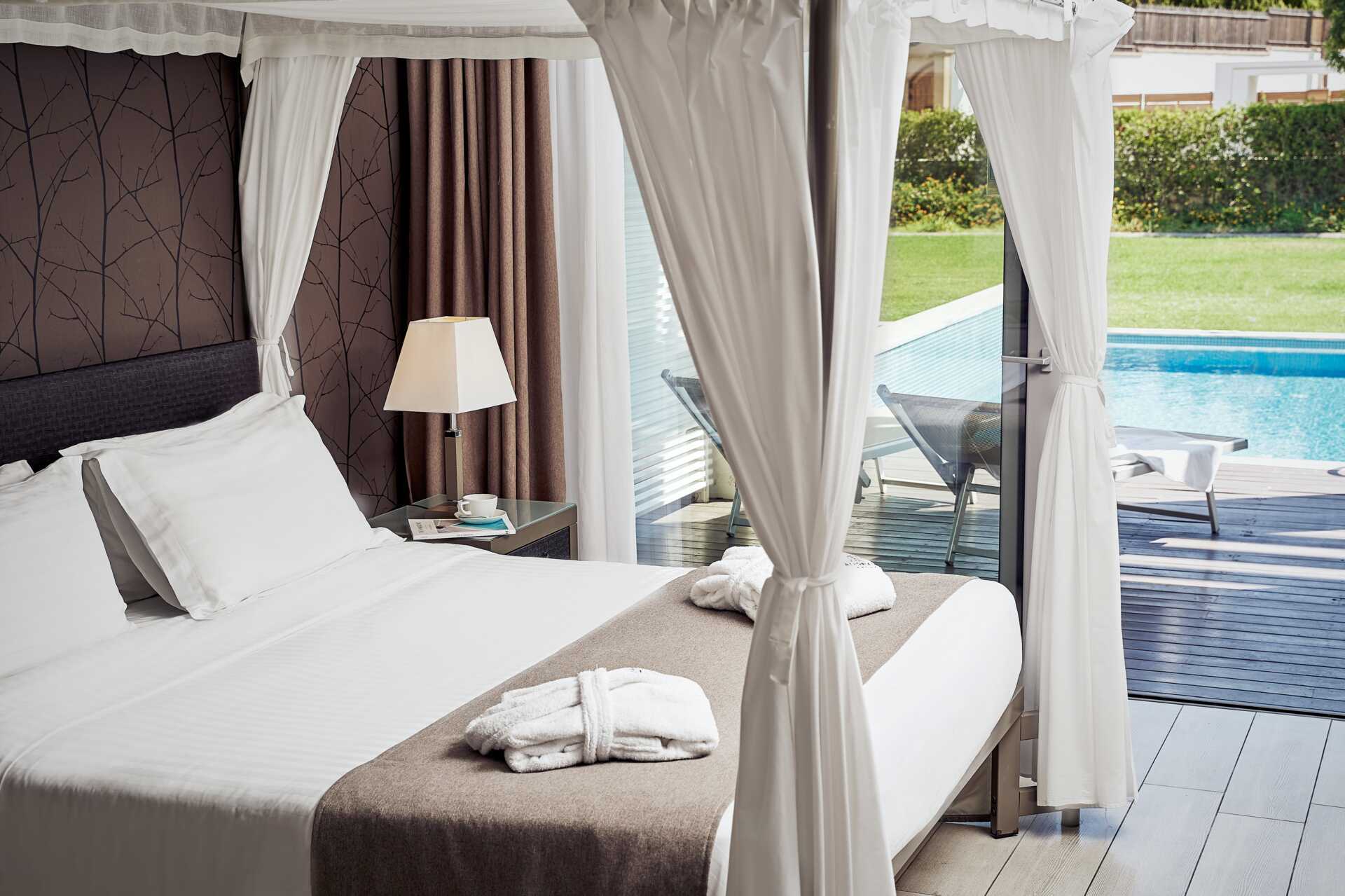 Deluxe-huone, jossa on oma uima-allas ja aurinkotuolit terassilla. Parivuode. Lisävuodemahdollisuus kokoontaitettavasta vuoteesta. Tyynymenu. Maksuton wifi, ilmastointi ja tallelokero. Minibaari sisältyy hintaan - täytetään joka toinen päivä virvoitusjuomilla, oluella ja vedellä. Vedenkeitin, kahvia ja teetä. Tv kansainvälisillä kanavilla. Kylpytakit ja tossut. Hiustenkuivain. Amme ja wc. Siivous 7 krt/viikko. Alle 2-vuotiaat lapset lasketaan lisävuoteella majoittuviksi henkilöiksi.
