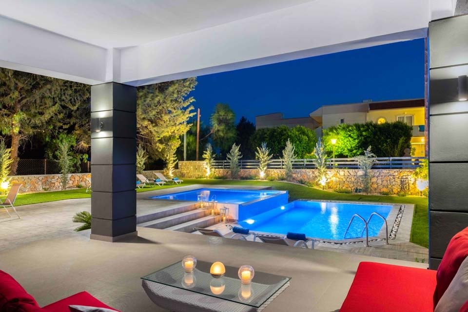 Kaunis moderni huvila – loistava sijainti vain muutaman minuutin kävelymatkan päässä kaupoista ja ravintoloista sekä Lardosin rannalta, mutta silti syrjässä kylän laidalla mäntymetsän takana ja täysin suojaisassa ympäristössä yksityisyyden takaamiseksi.
