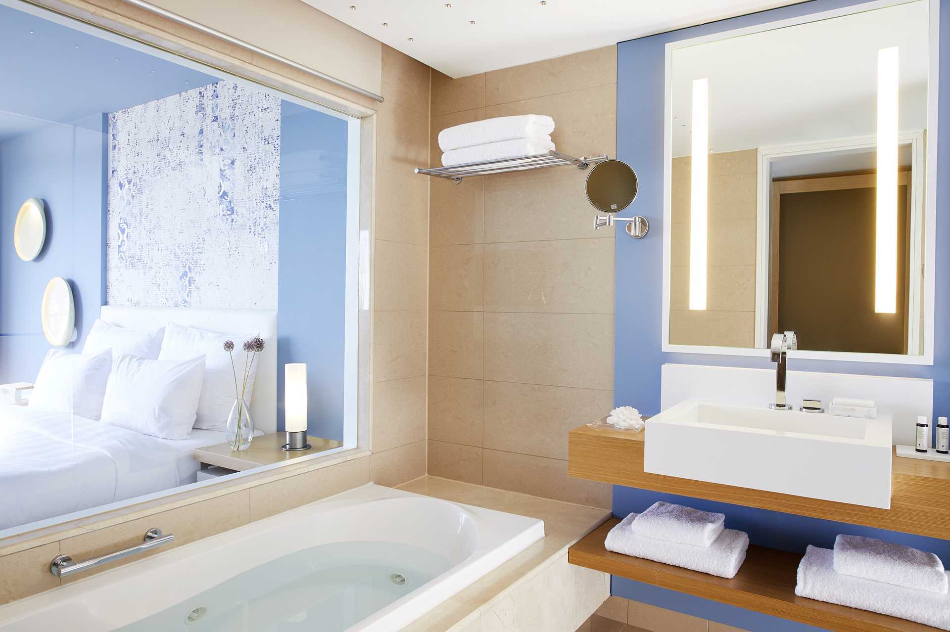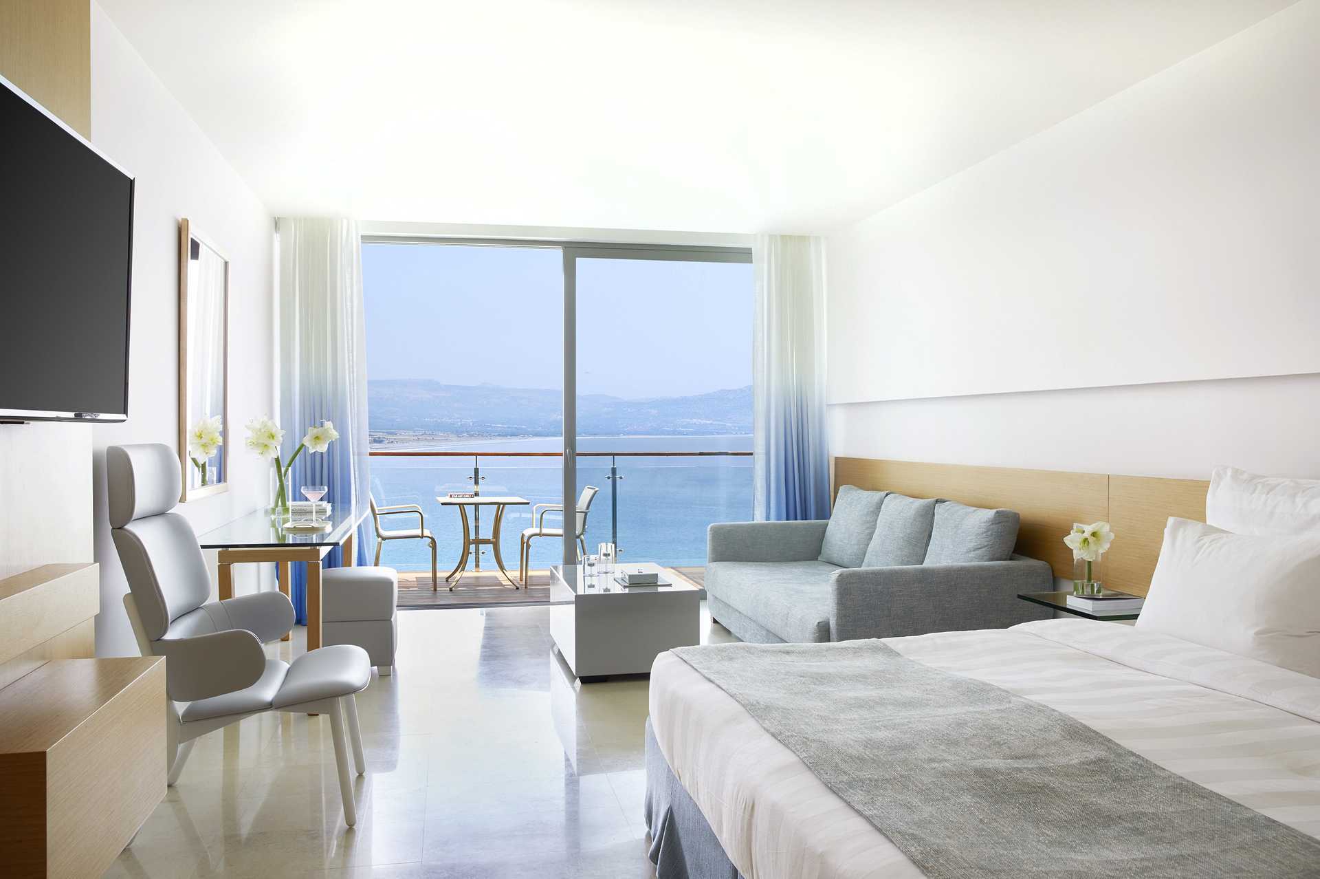 Junior-sviitti, jossa on ulkotila, jaettu uima-allas ja merinäköala. Parivuode. Maksuton wifi, ilmastointi ja tallelokero. Minibaari. Nespresso-keitin. Vedenkeitin, kahvia ja teetä. Tv kansainvälisillä kanavilla. Hiustenkuivain. Kylpytakit ja tossut. Kylpyhuone, jossa poreamme, erillinen suihku ja wc. Siivous 7 krt/viikko.