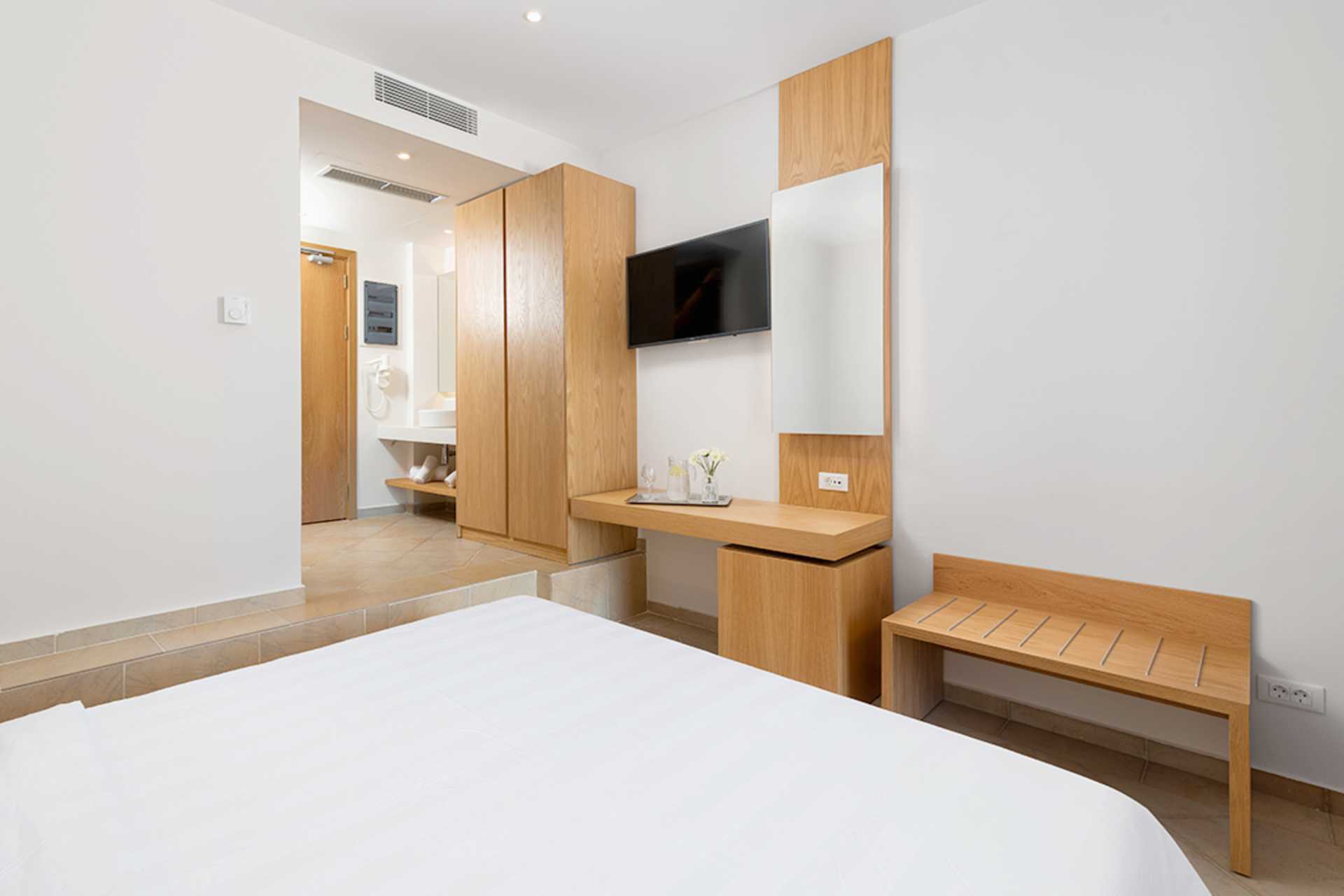 Deluxe-huone ulkotilalla ja jaetulla uima-altaalla. Terassilla on kaksi tuolia ja pöytä sekä kaksi mukavaa aurinkotuolia. Parivuode tai kaksi yhden hengen sänkyä. Maksuton wifi ja ilmastointi. Jääkaappi. Tv kansainvälisillä kanavilla. Hiustenkuivain. Suihku ja wc. Siivous 7 krt/viikko.