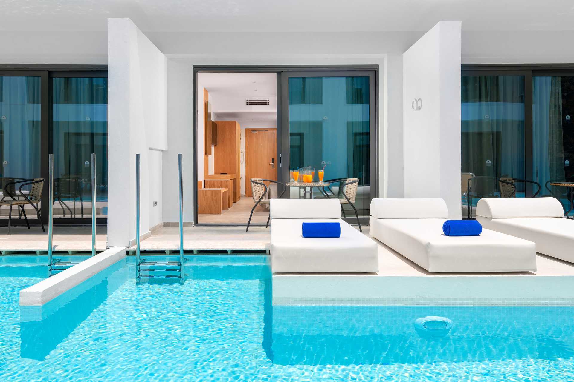 Deluxe-huone ulkotilalla ja jaetulla uima-altaalla.