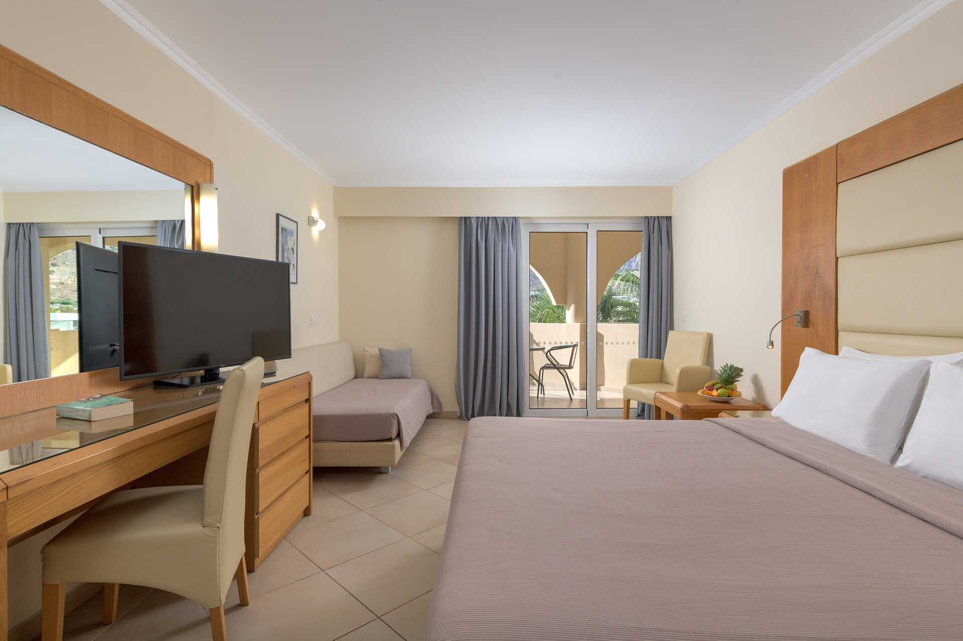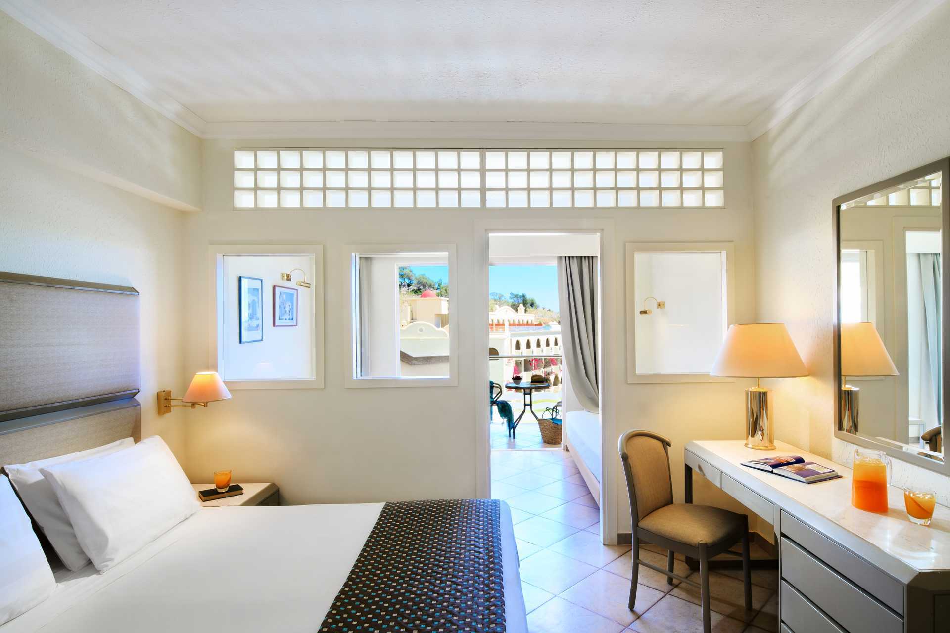 Perhehuone jossa parveke tai terassi, osassa näköala uima-altaalle. Perhehuone koostuu makuuhuoneesta ja olohuoneesta, jotka on jaettu seinällä, jossa on liukuovi. Parivuode tai kaksi yhden hengen sänkyä. Lisävuodemahdollisuus kahteen vuodesohvaan tai kahteen yhden hengen sänkyyn. Maksuton wifi ja ilmastointi. Jääkaappi. Tv kansainvälisillä kanavilla. Hiustenkuivain. Amme ja wc. Siivous 7 krt/viikko.